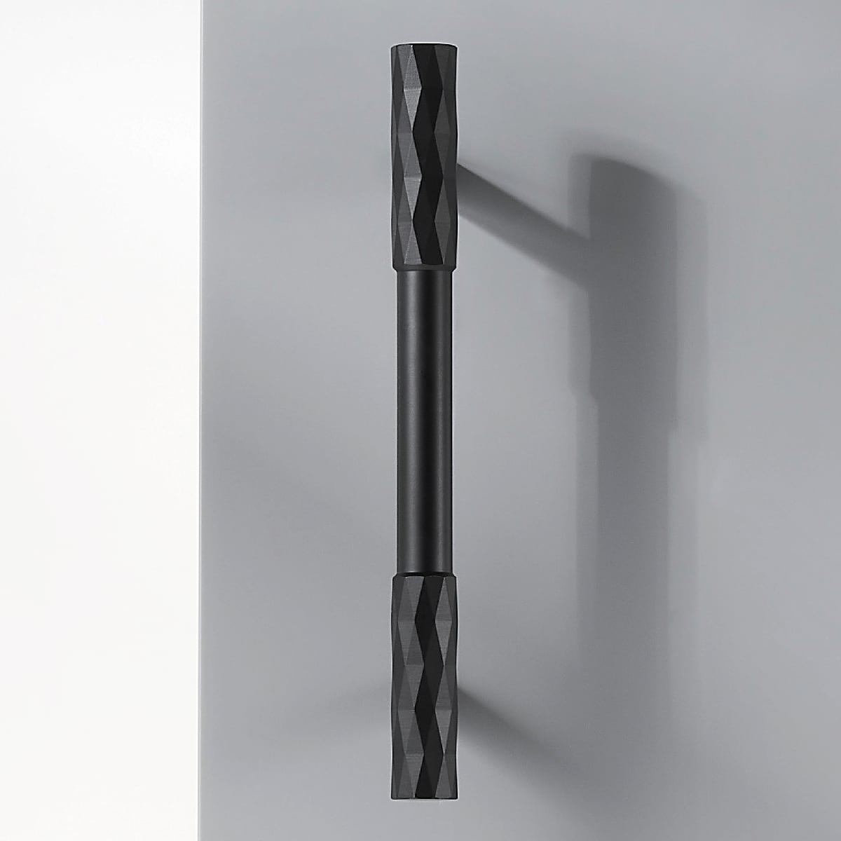 The ADAMAS handle takes the same diamond-cut pattern from the knob and stretches it across a full bar. The faceted surface runs the entire length of the grip, so the light play is more dramatic here than on the smaller knob.