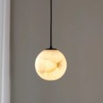 The ALMA Alabaster Sphere Pendant centres on a hand-finished sphere of natural Spanish alabaster, a translucent stone used in interior architecture since antiquity. Each sphere is hollowed from the inside so a single G9 LED bulb illuminates the stone from within, lighting the alabaster’s mineral veining from creamy-white to amber-streaked. No two spheres are identical: the patterning is unique to the block each one was cut from.