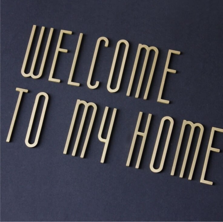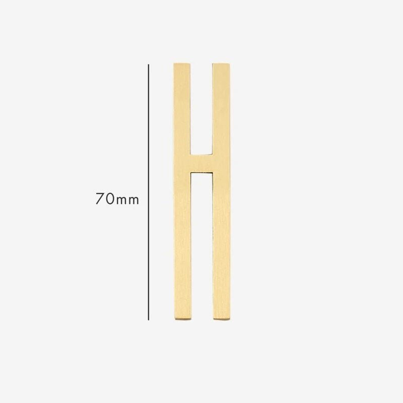 AMYTHUS house letters are individual solid brass characters, A through Z, in three sizes (6cm, 8cm, and 10cm). Designed for exterior use on front doors, walls, and gates.