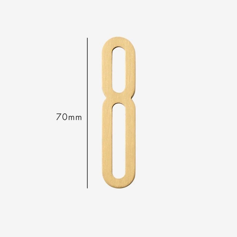 AMYTHUS house numbers are individual solid brass numerals, available in three sizes (6cm, 8cm, and 10cm) to suit different frontage scales and viewing distances.
