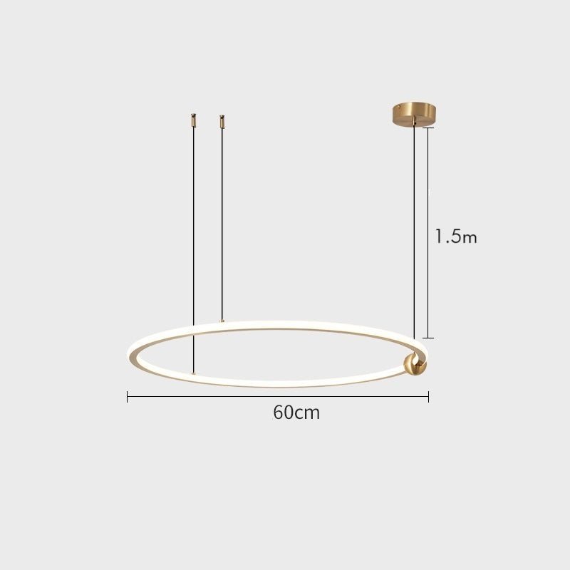 The ANELLI Circular Pendant is a thin brass ring suspended from cables, with integrated LED lighting around the inner circumference. The ring floats in space, casting even ambient light downward while the brass catches light from the room.