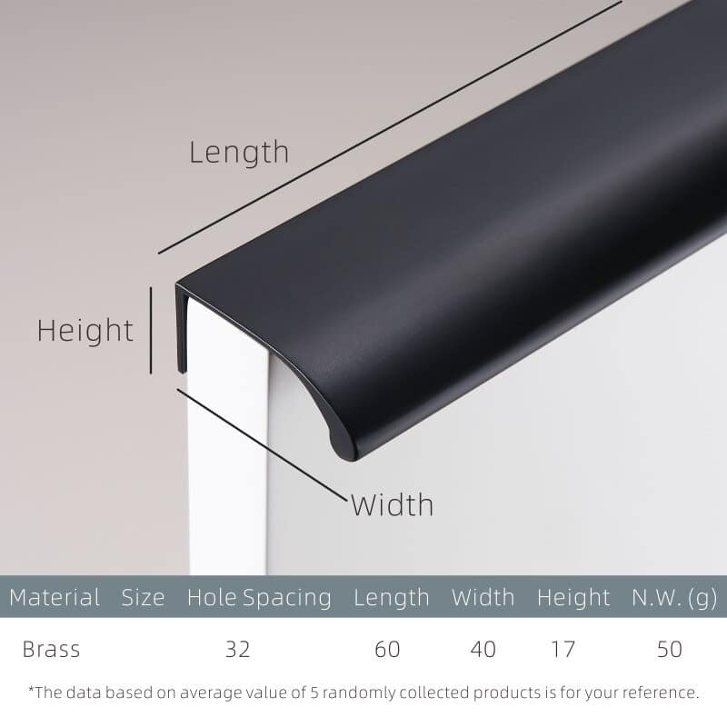 Available in matte black and satin brass. Three sizes: 60mm (32mm CC) for small drawers and cabinets, 150mm (128mm CC) for standard kitchen drawers, and 220mm (192mm CC) for larger doors and wider drawers. Solid brass throughout. Sold individually with fixings included.