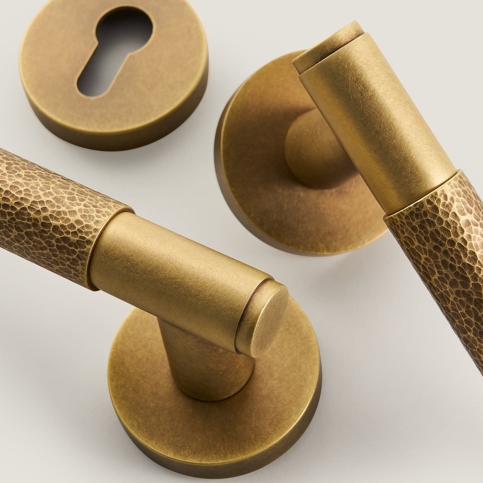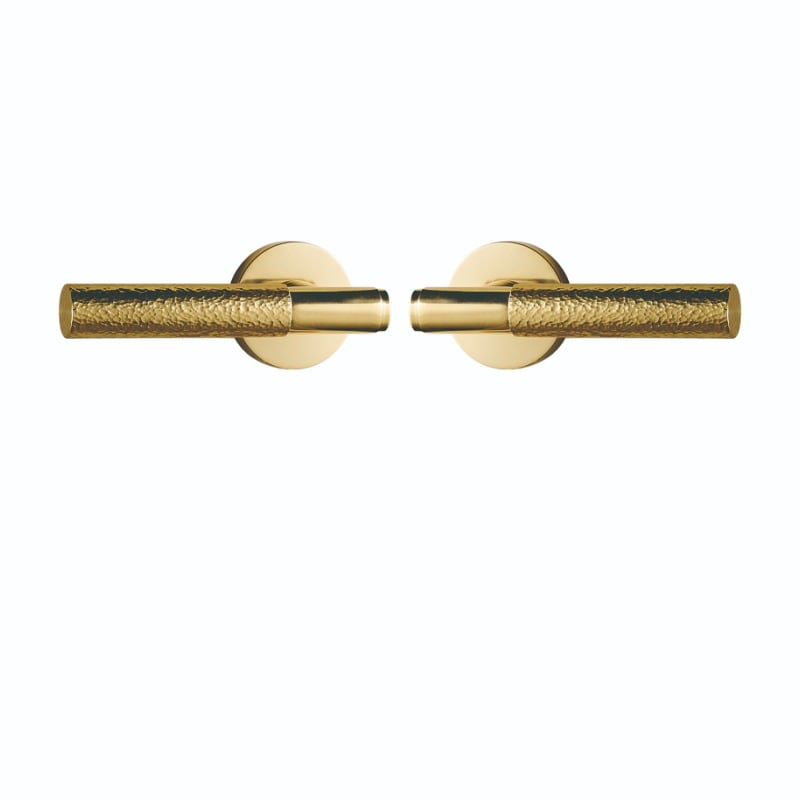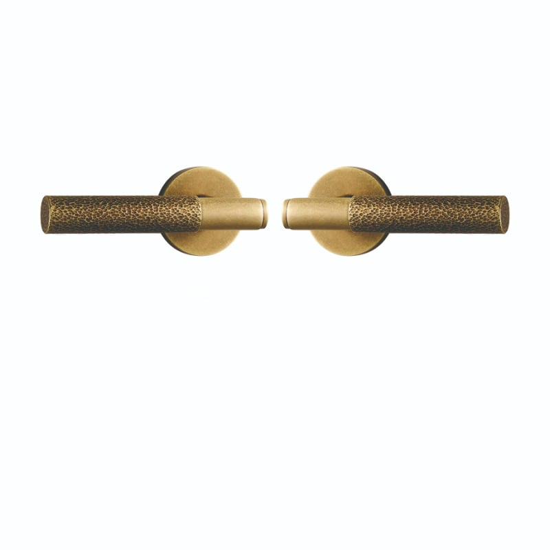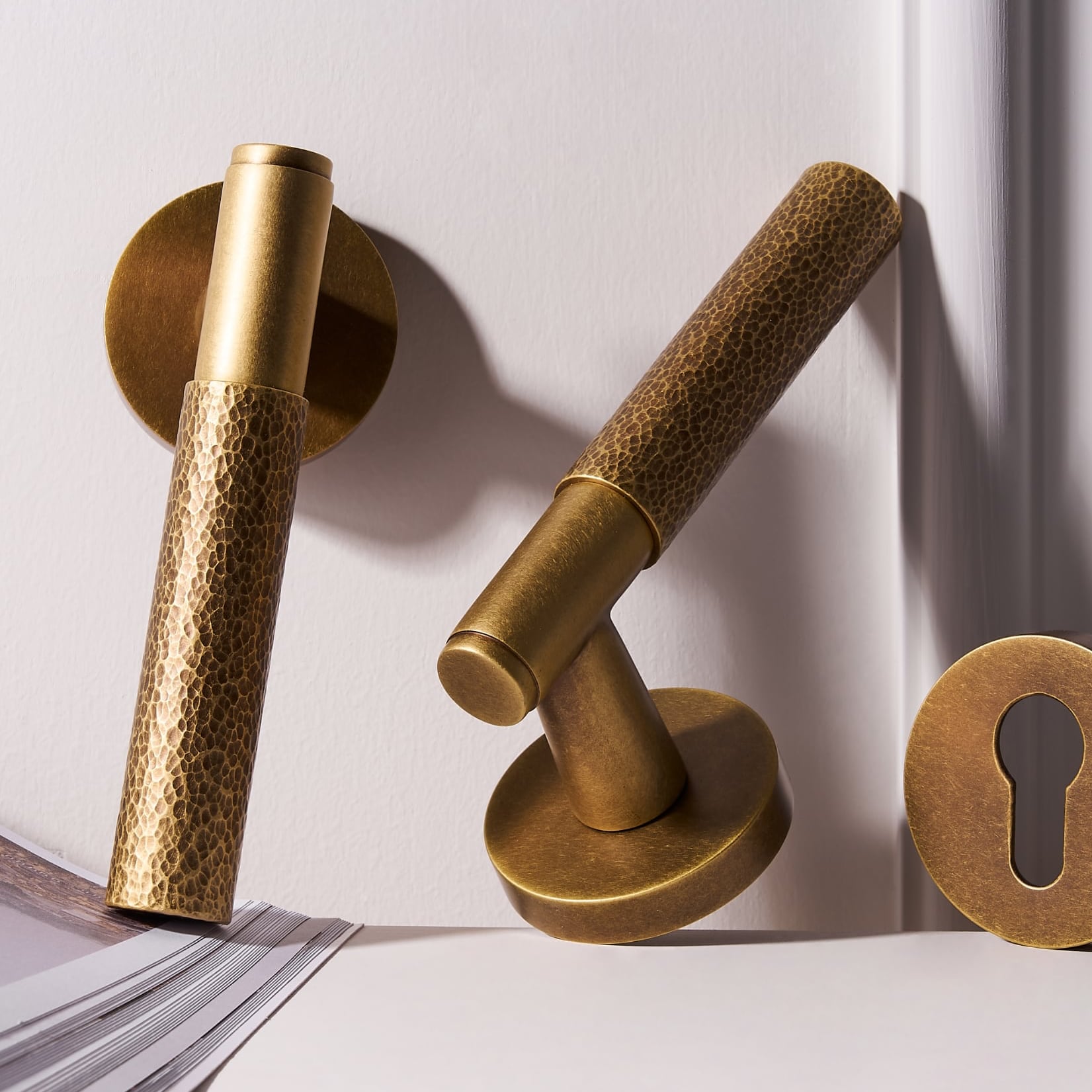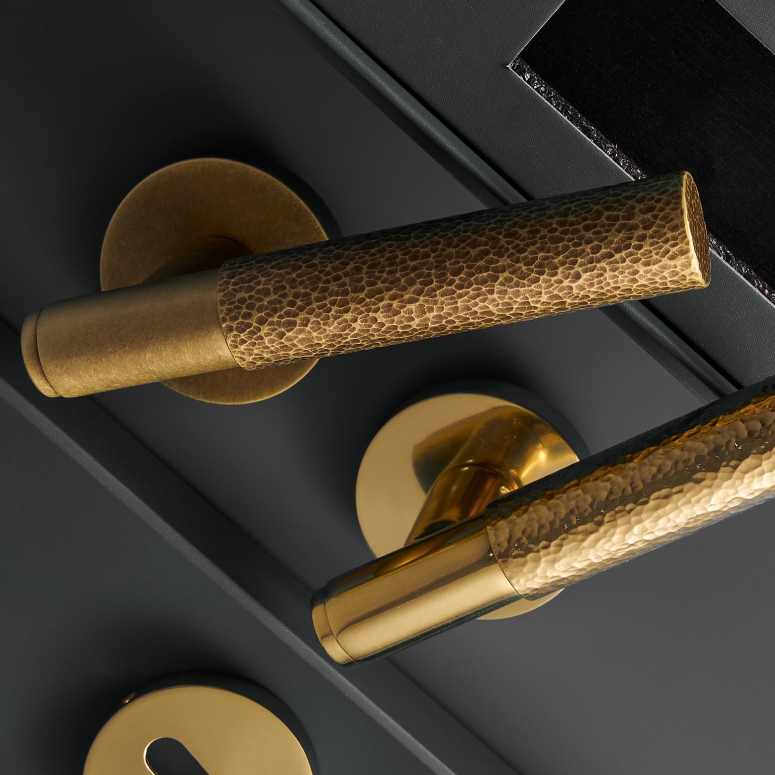 AURUM lever door handles bring the collection's warm brass finishes to the door. The lever form is solid brass on a round rose plate, proportioned for comfortable grip.