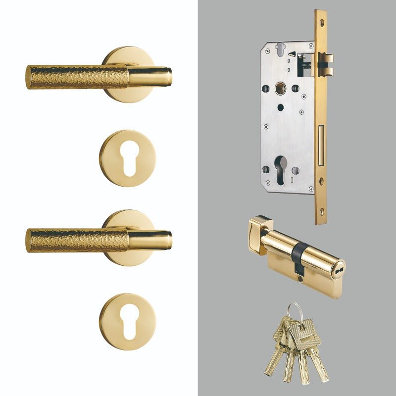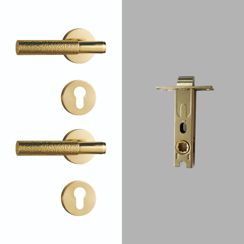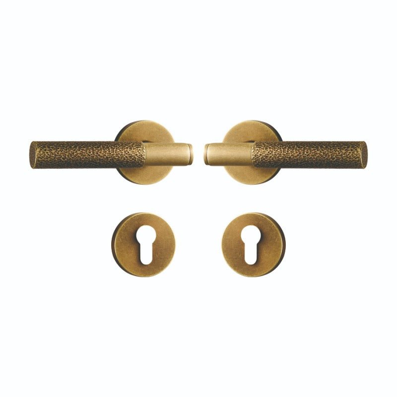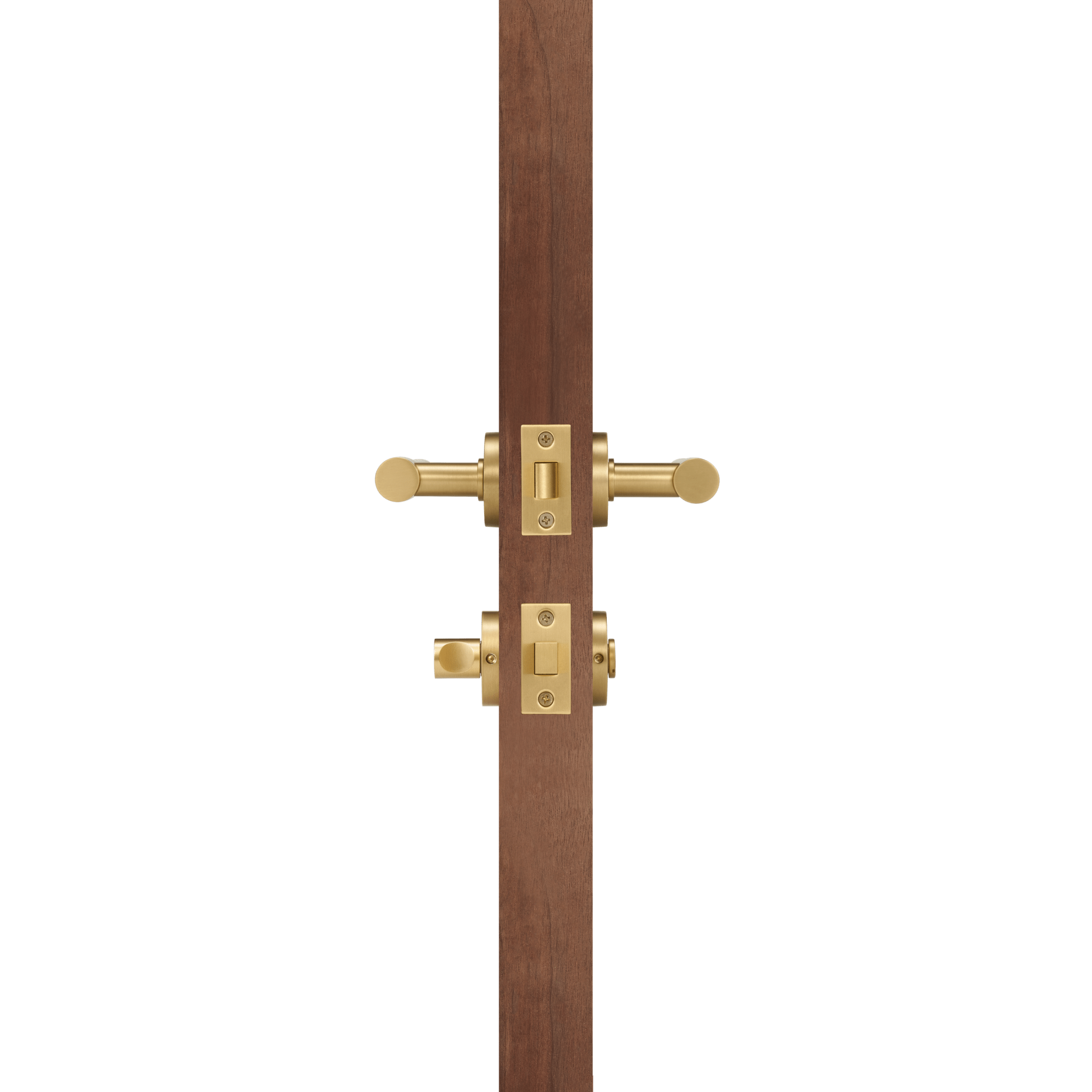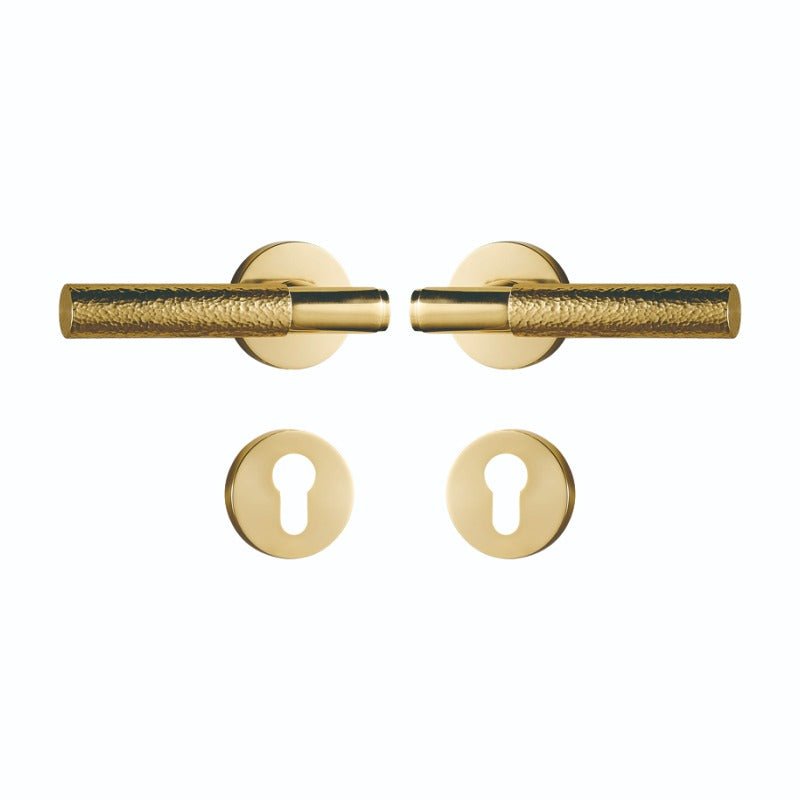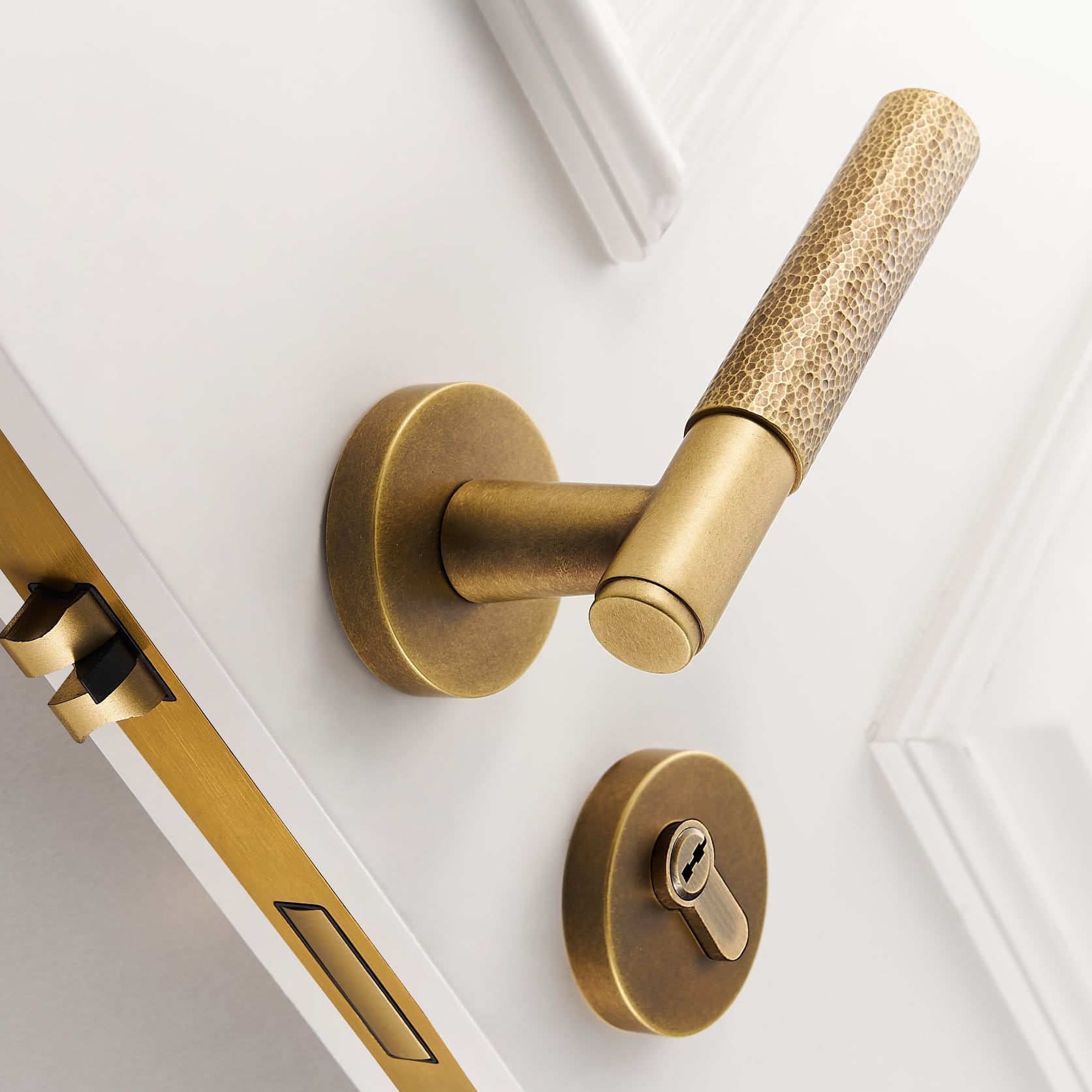AURUM lever door handles bring the collection's warm brass finishes to the door. The lever form is solid brass on a round rose plate, proportioned for comfortable grip.