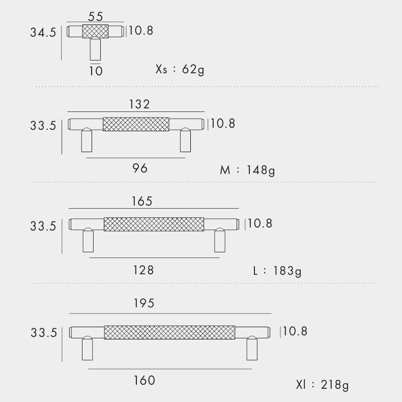 LengthDistance between holes (CC)Height/depthDiameter of handleDiameter of baseNet weight (g)