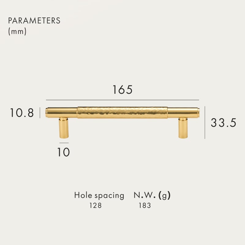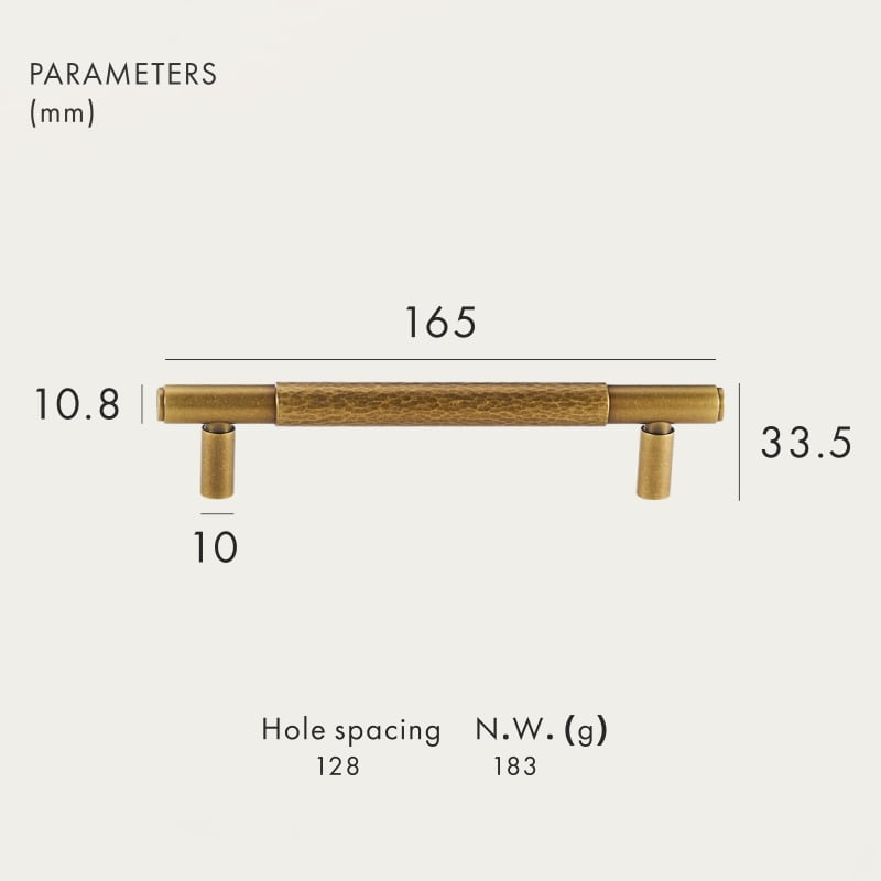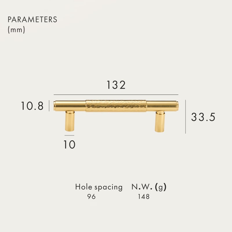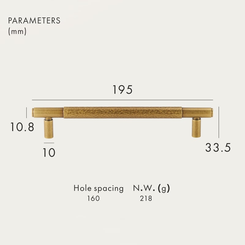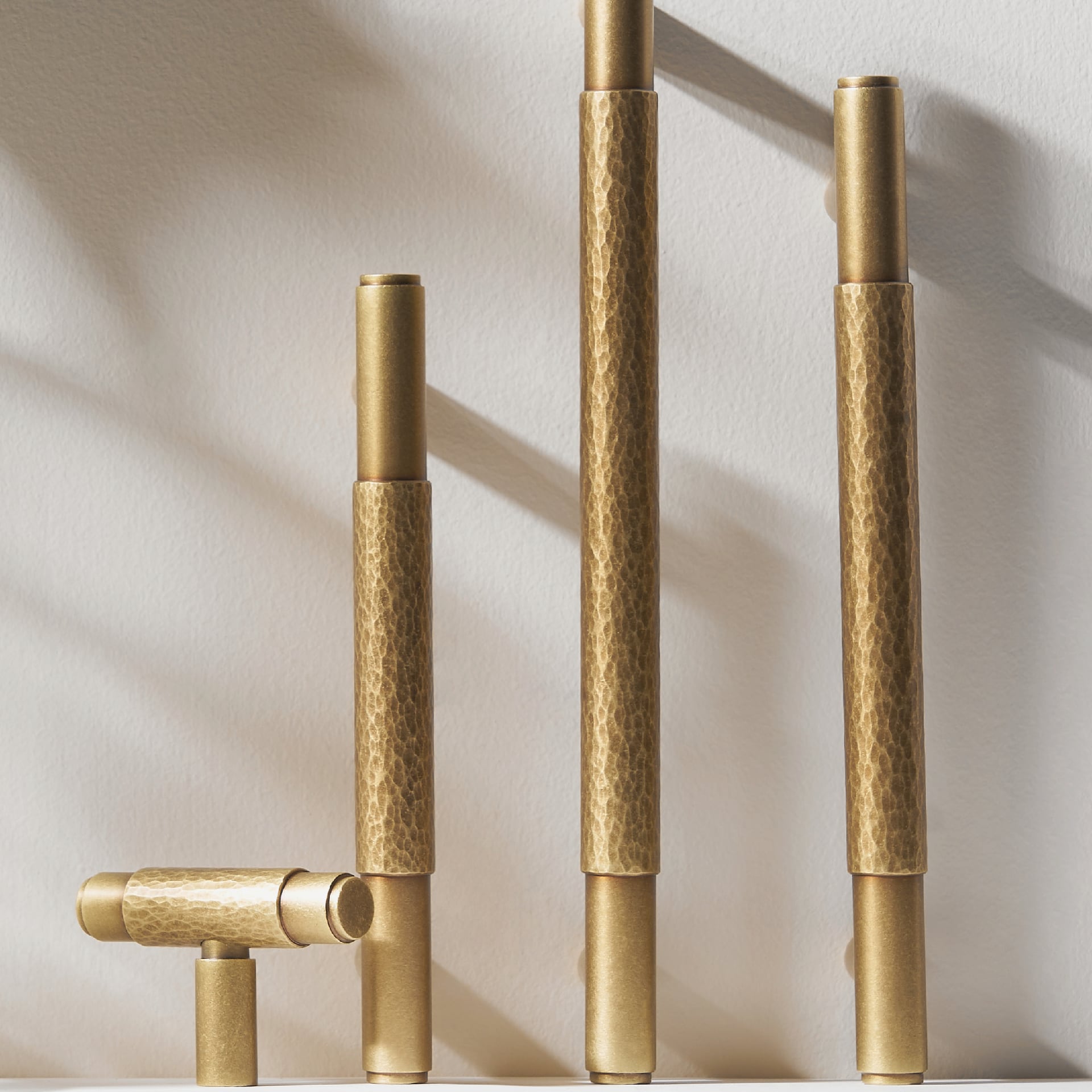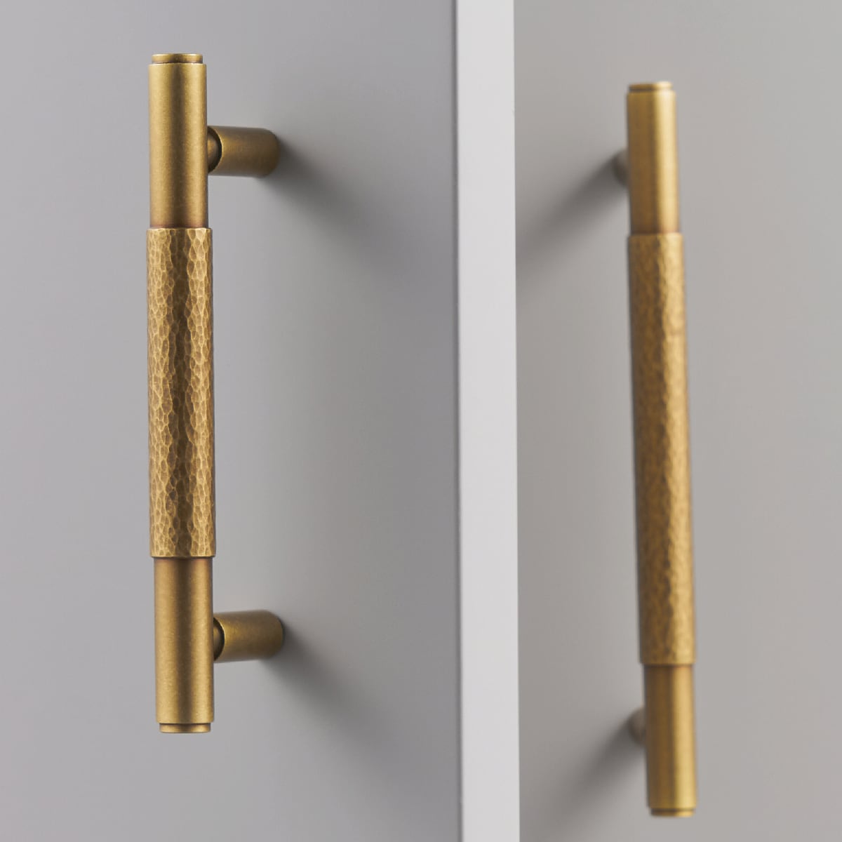 AURUM handles are solid brass bars with clean end posts, in two finishes that make the most of the material. Polished Brass (PVD) is bright and reflective. Vintage Brass is darker and patinated, giving the hardware an established, aged quality.