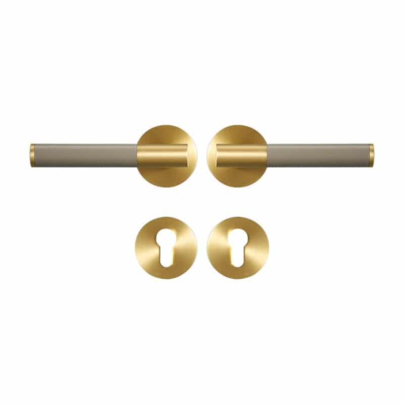 Solid brass with Italian leather. Includes levers, roses, and lock mechanism. Covered by a 10-year warranty.