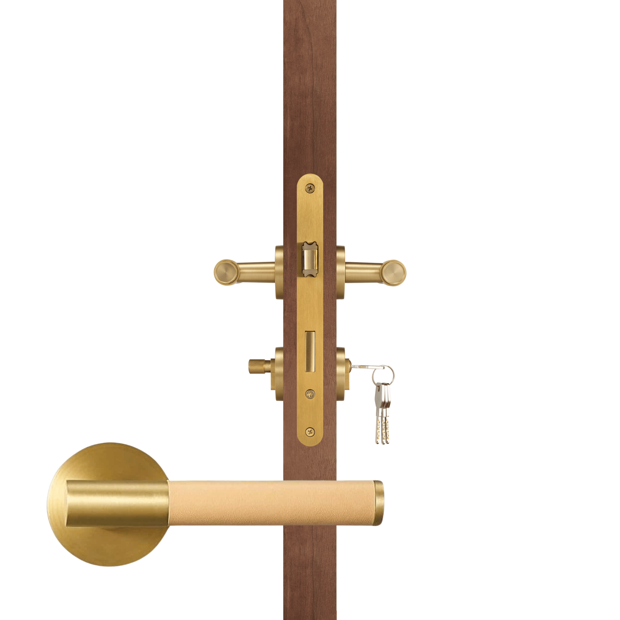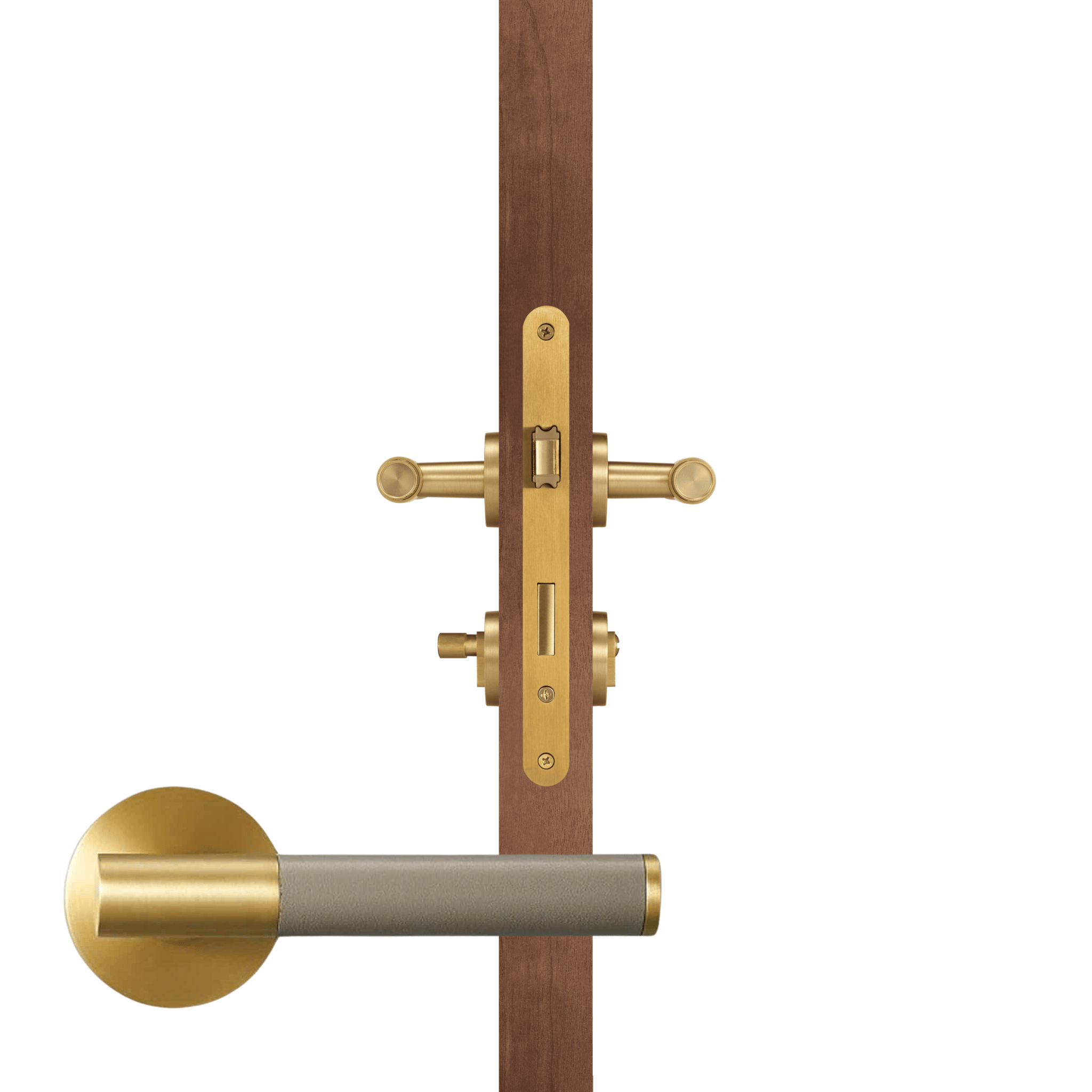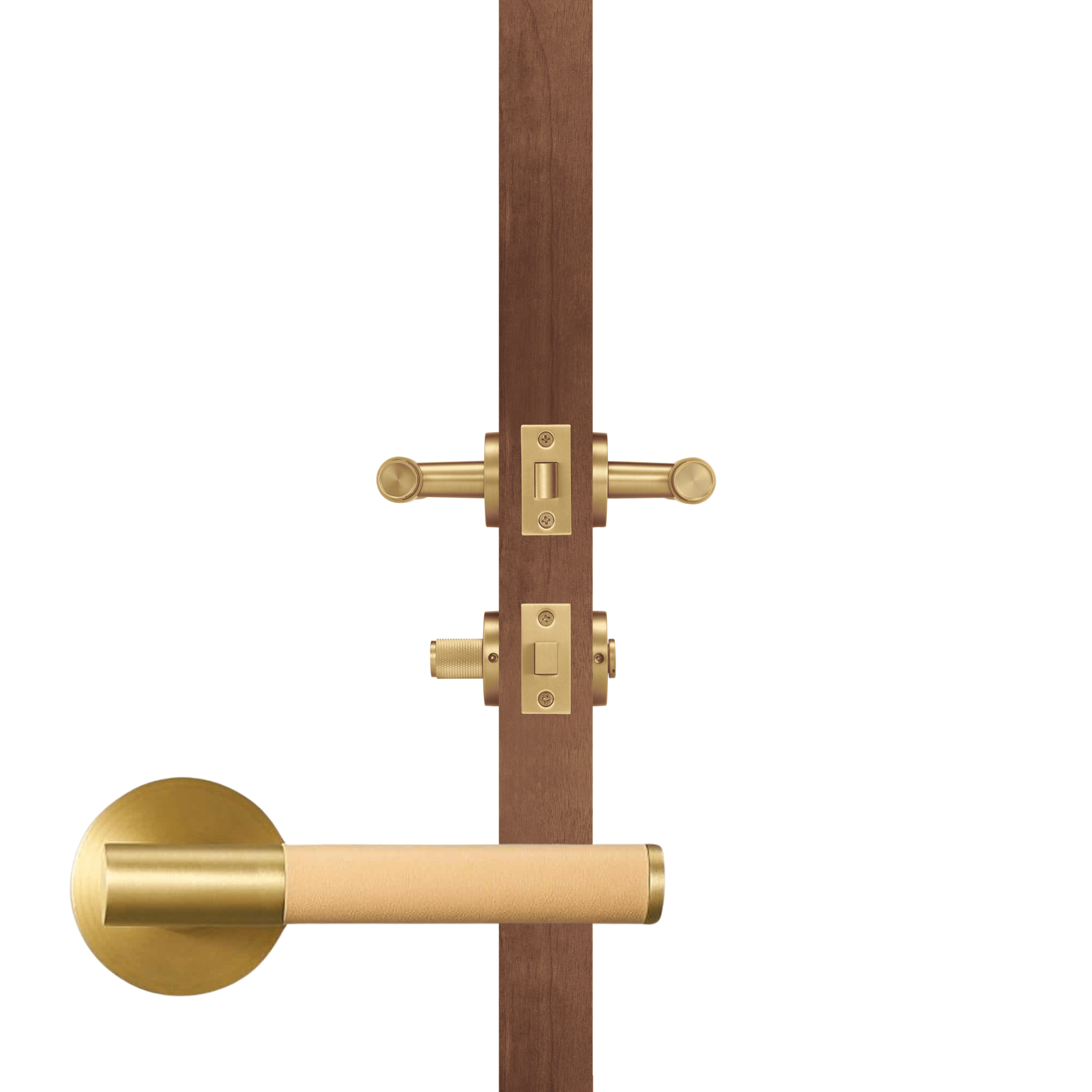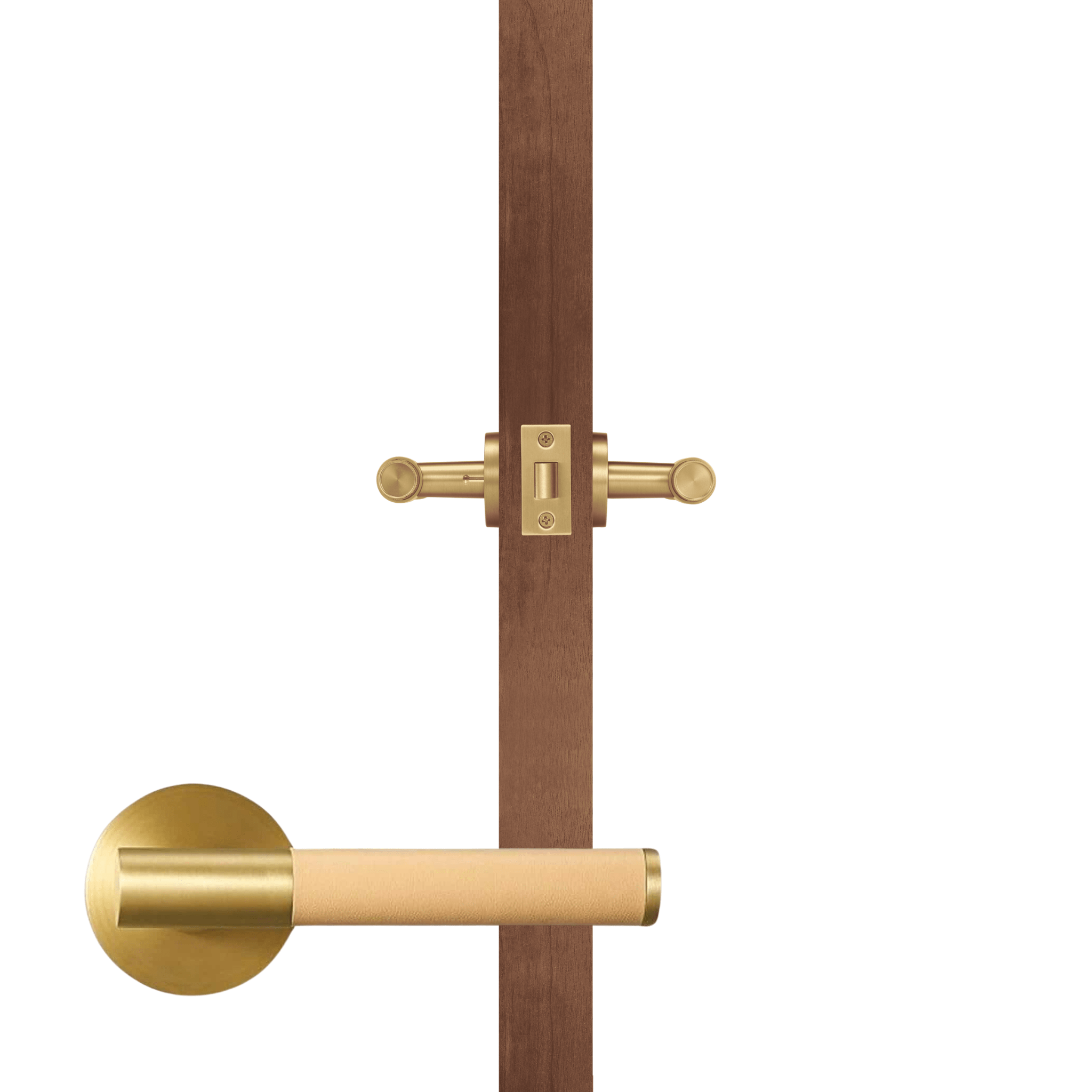 The BEETHAM lever door handle wraps a solid brass lever in Italian leather, bringing the collection's tactile quality to internal doors. The satin brass rose and mechanism frame the leather-wrapped lever for a warm, layered look.
