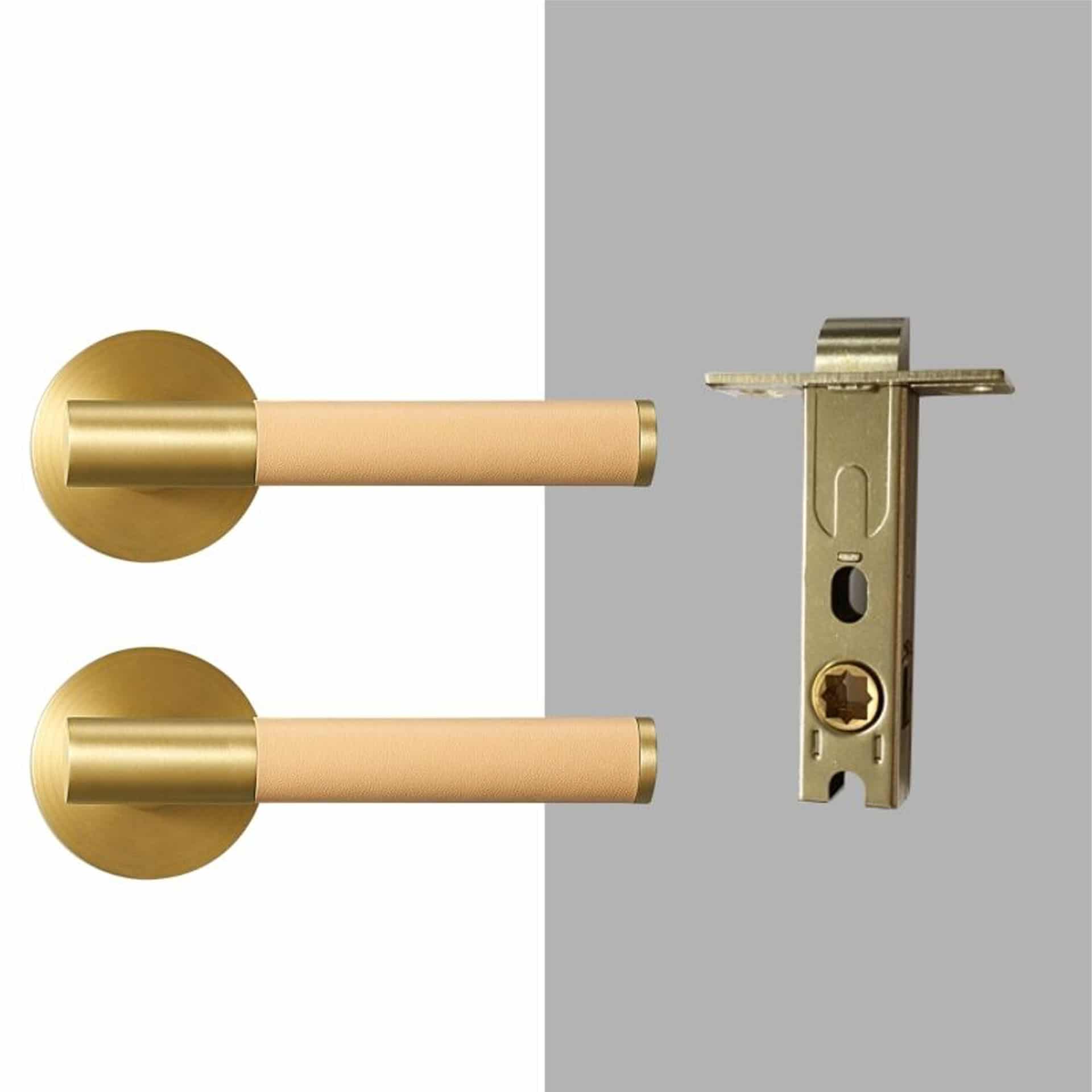 Five leather colours: Beige, Black, Green, Orange, and Taupe. Multiple lock configurations for bedrooms, bathrooms, living areas, and fixed applications. Compatible with UK/EU and North American door standards.
