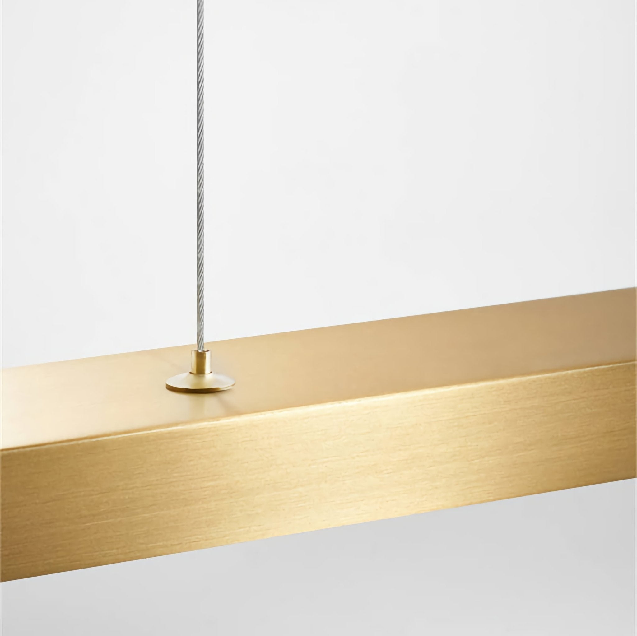 The BROCK is a linear pendant light with a clean rectangular brass profile and integrated downward-facing illumination. The form is deliberately minimal: a solid bar suspended from thin cables, with the light source concealed inside and directed downward through a diffused lens along the full length.