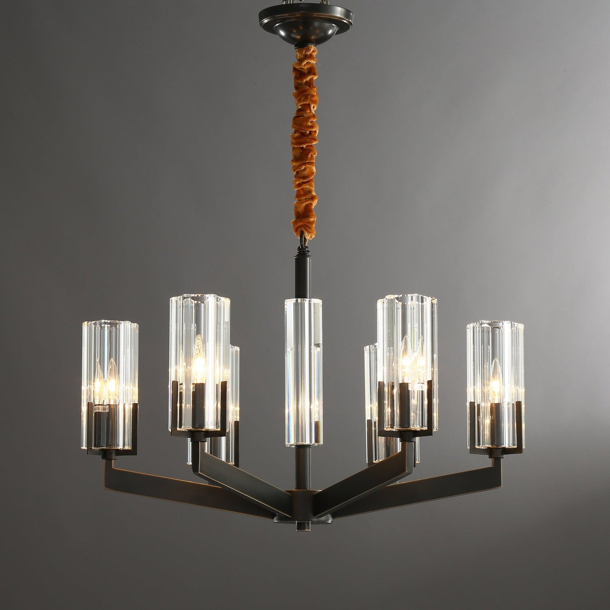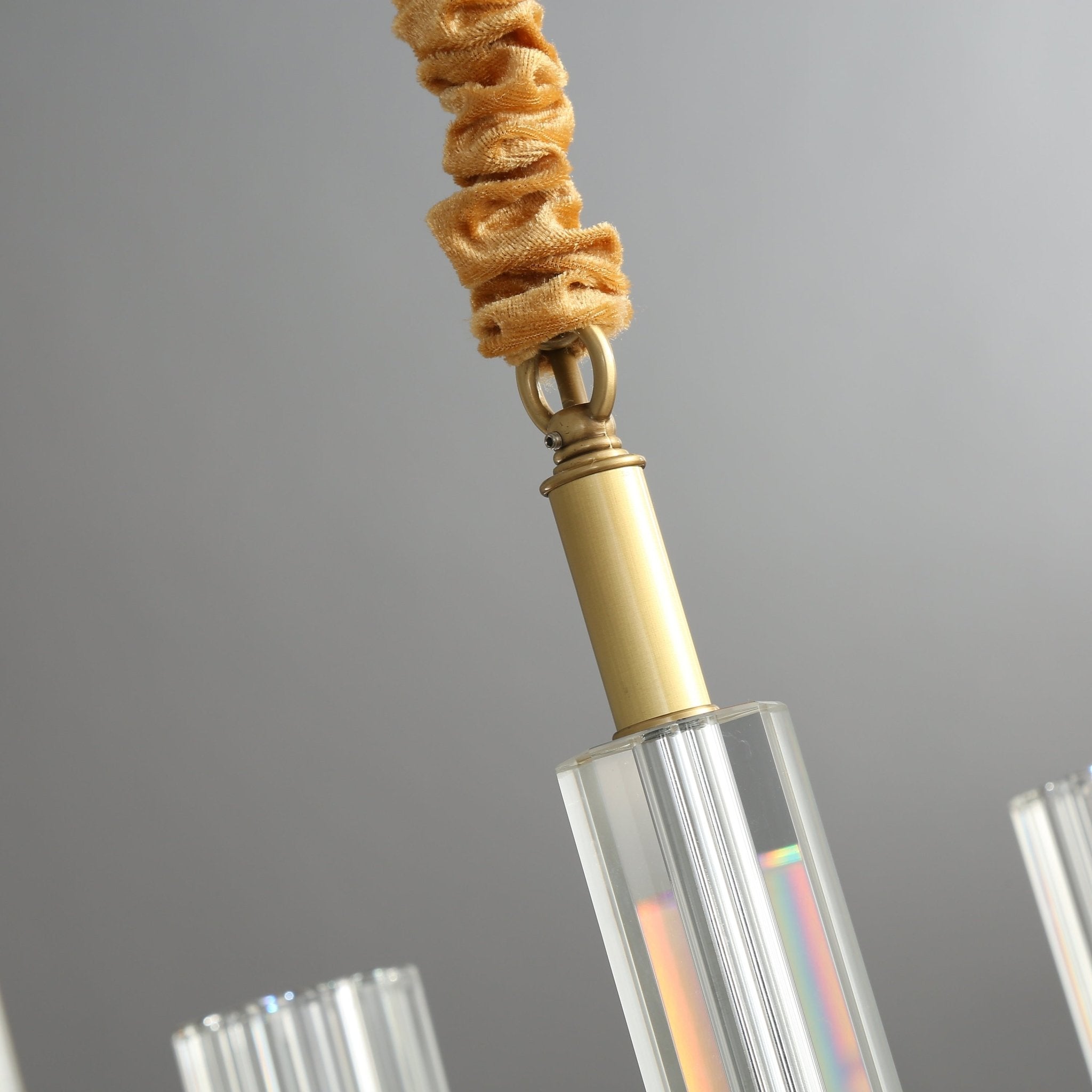 Four sizes are available: 6-sconce for smaller rooms, 8-sconce for standard dining areas, 10-sconce for larger spaces, and 14-sconce for statement installations. Each glass cylinder casts soft, ambient light while the brass frame adds warmth and substance.