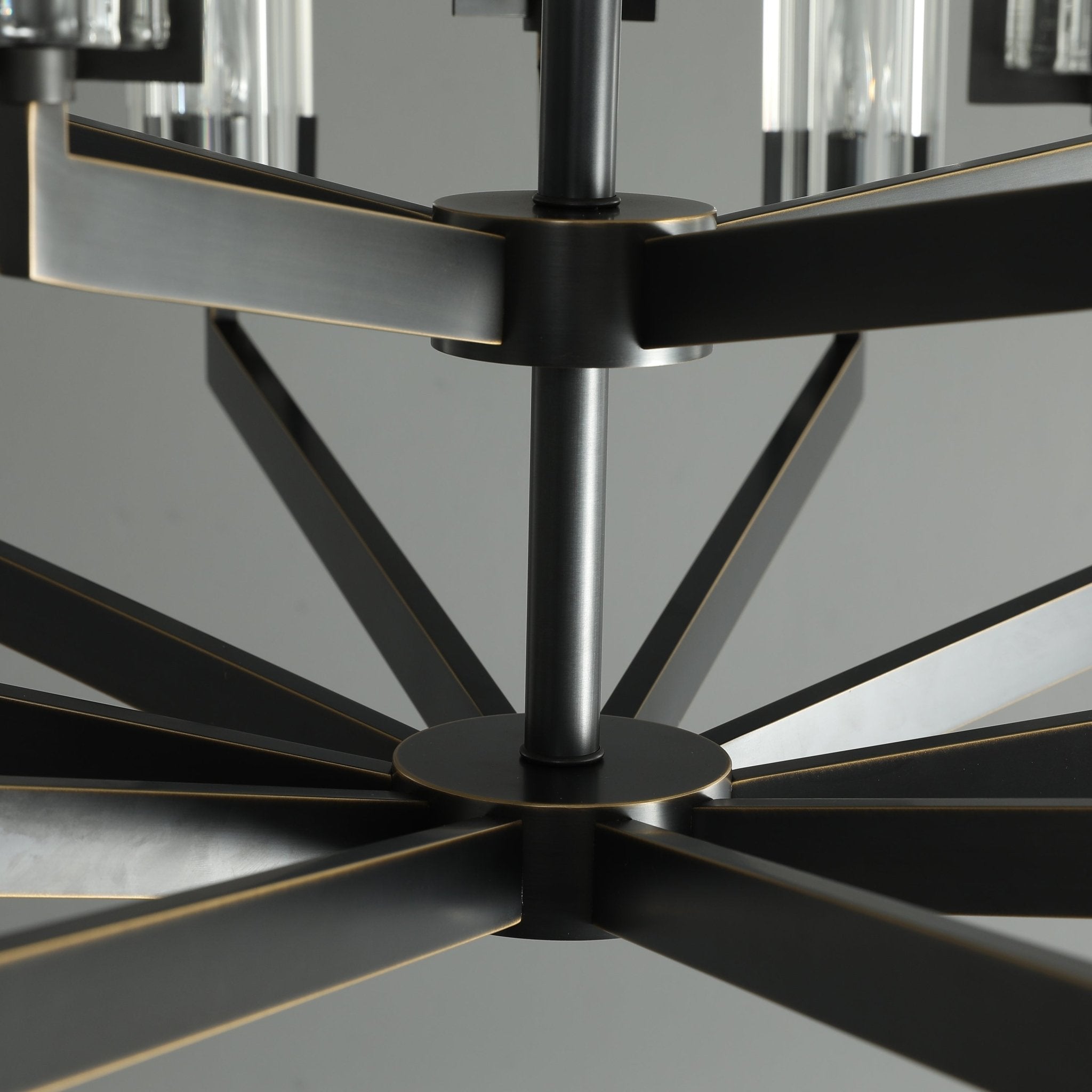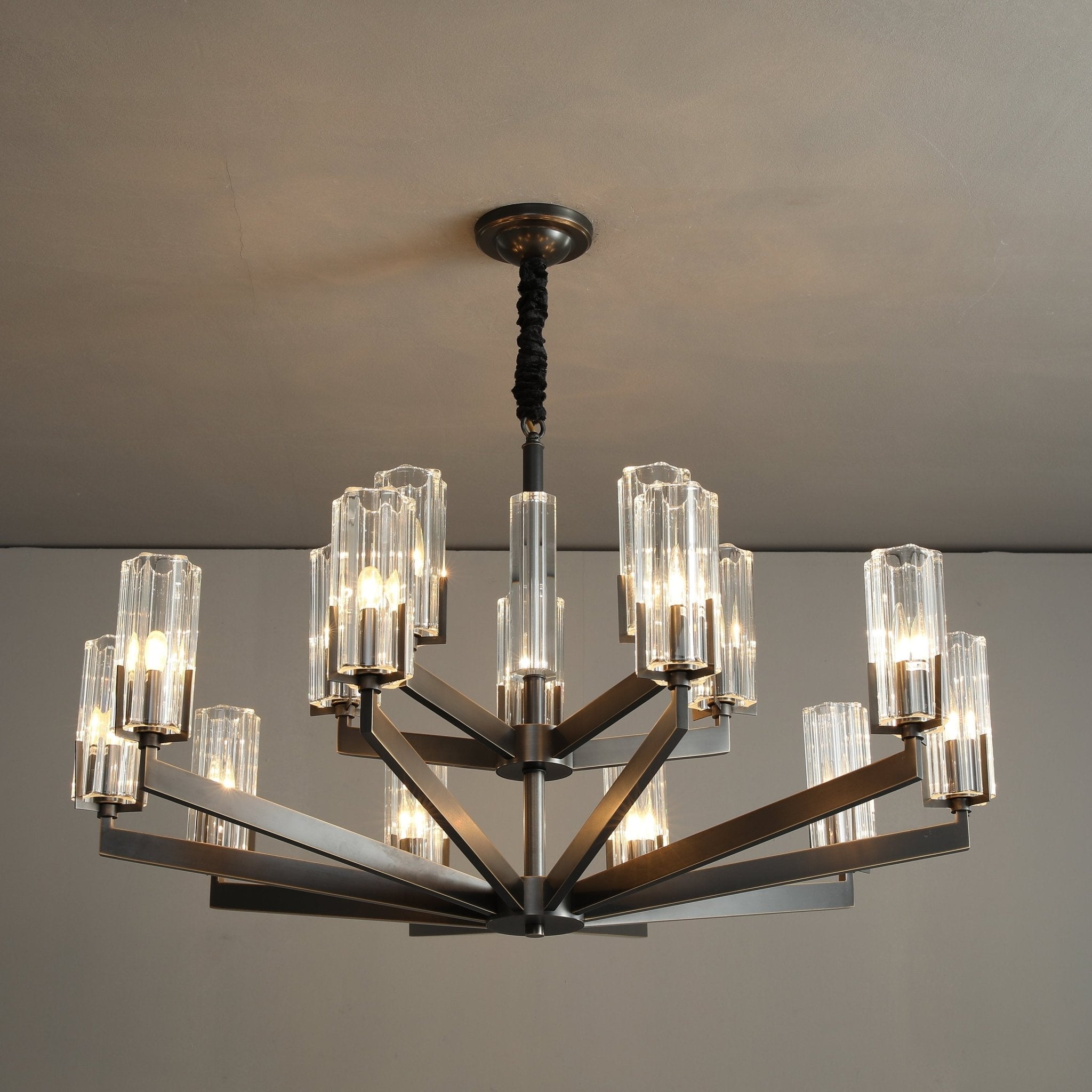 The CELESTE round chandelier arranges clear glass cylinders in a circle, creating a centrepiece that works above dining tables, in hallways, and in double-height spaces.… View product details