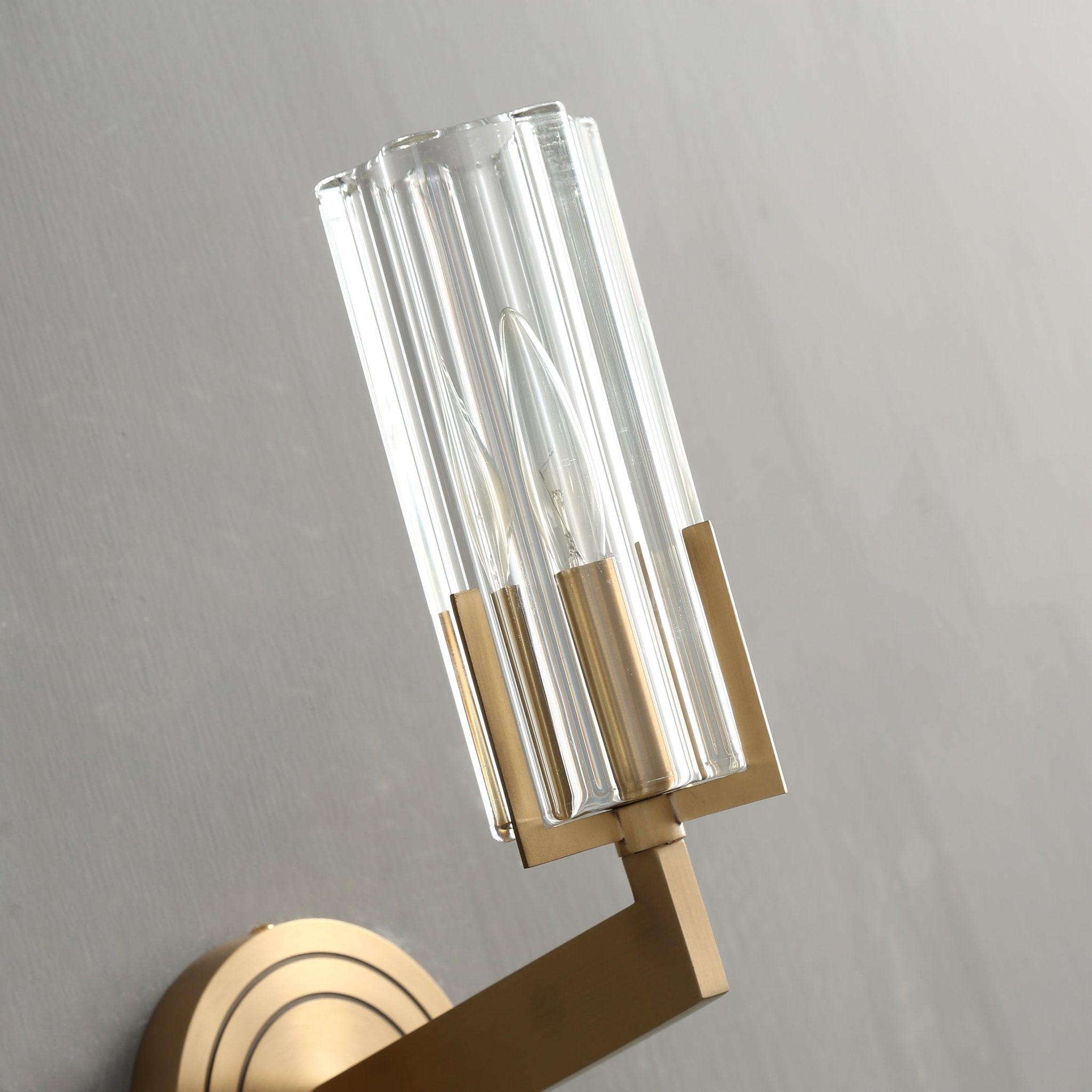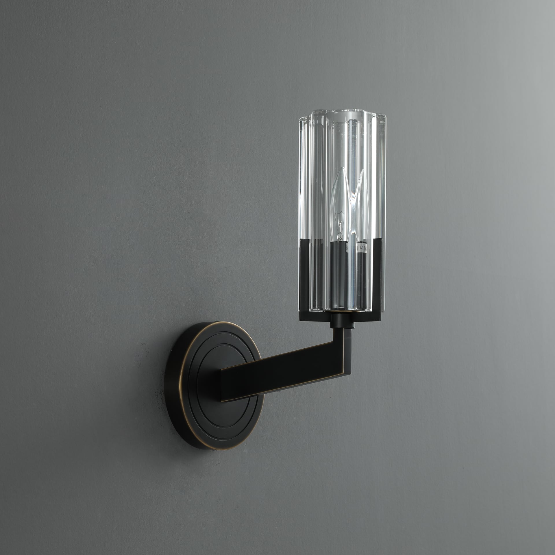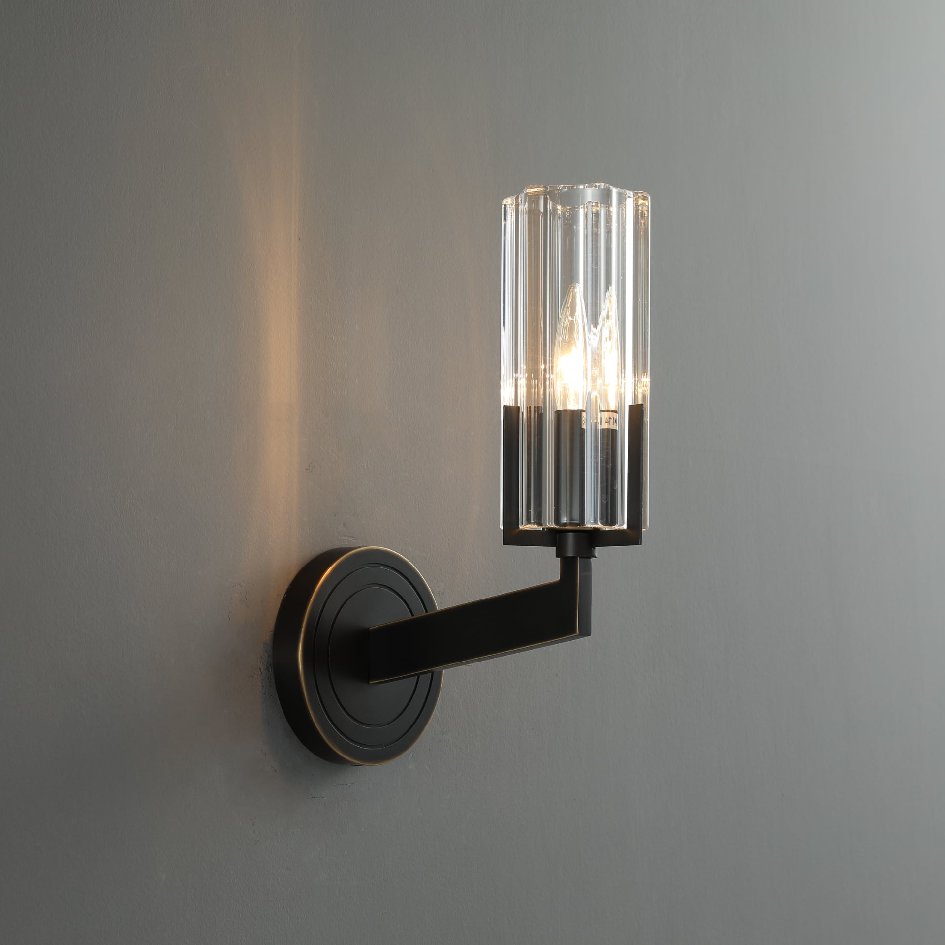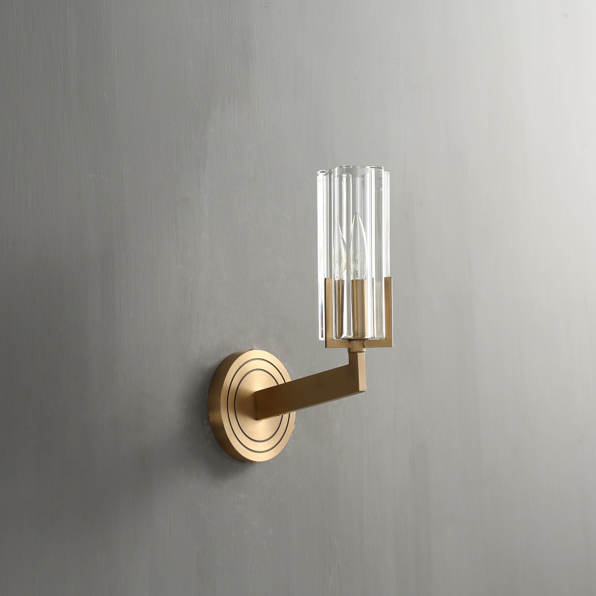 CELESTE as a wall light brings the collection's brass-and-glass language to a smaller, more focused format. A single solid brass arm holds a clear glass cylinder that diffuses light softly while still showing the bulb filament.
