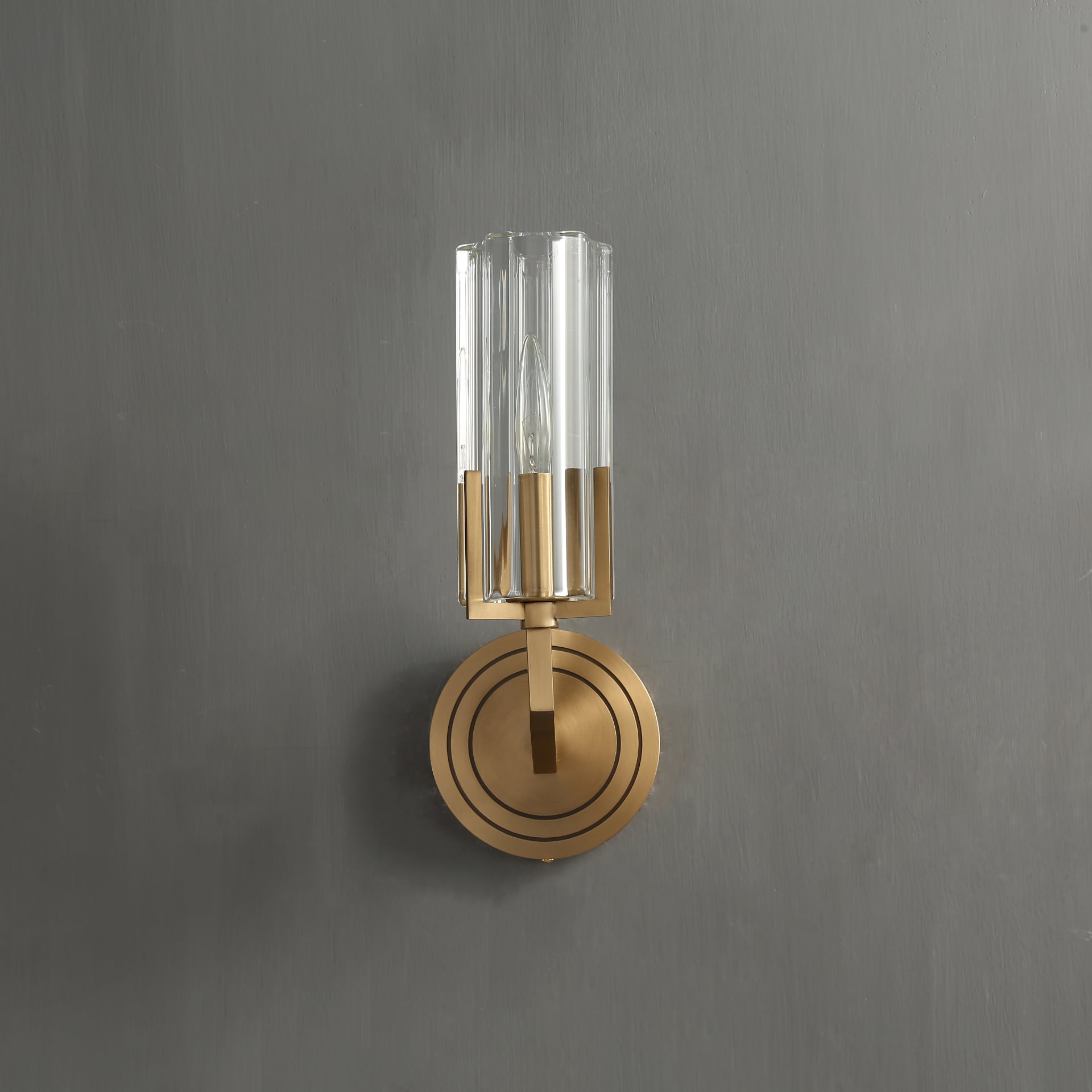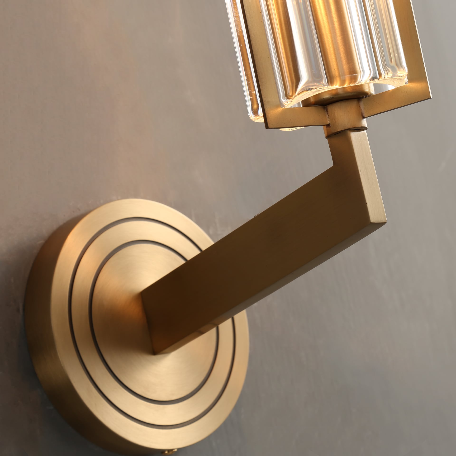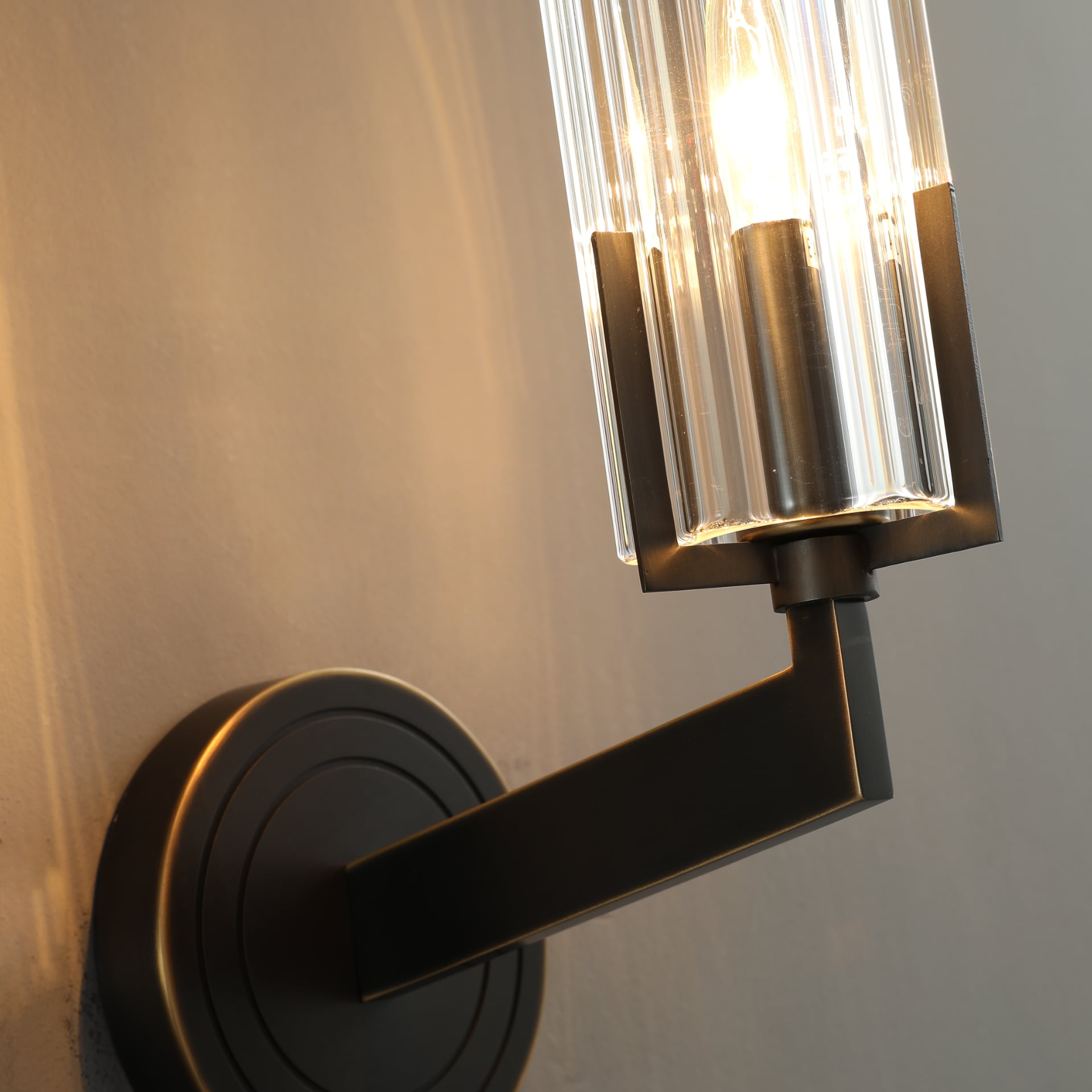 CELESTE as a wall light brings the collection's brass-and-glass language to a smaller, more focused format. A single solid brass arm holds a clear glass cylinder that diffuses light softly while still showing the bulb filament.