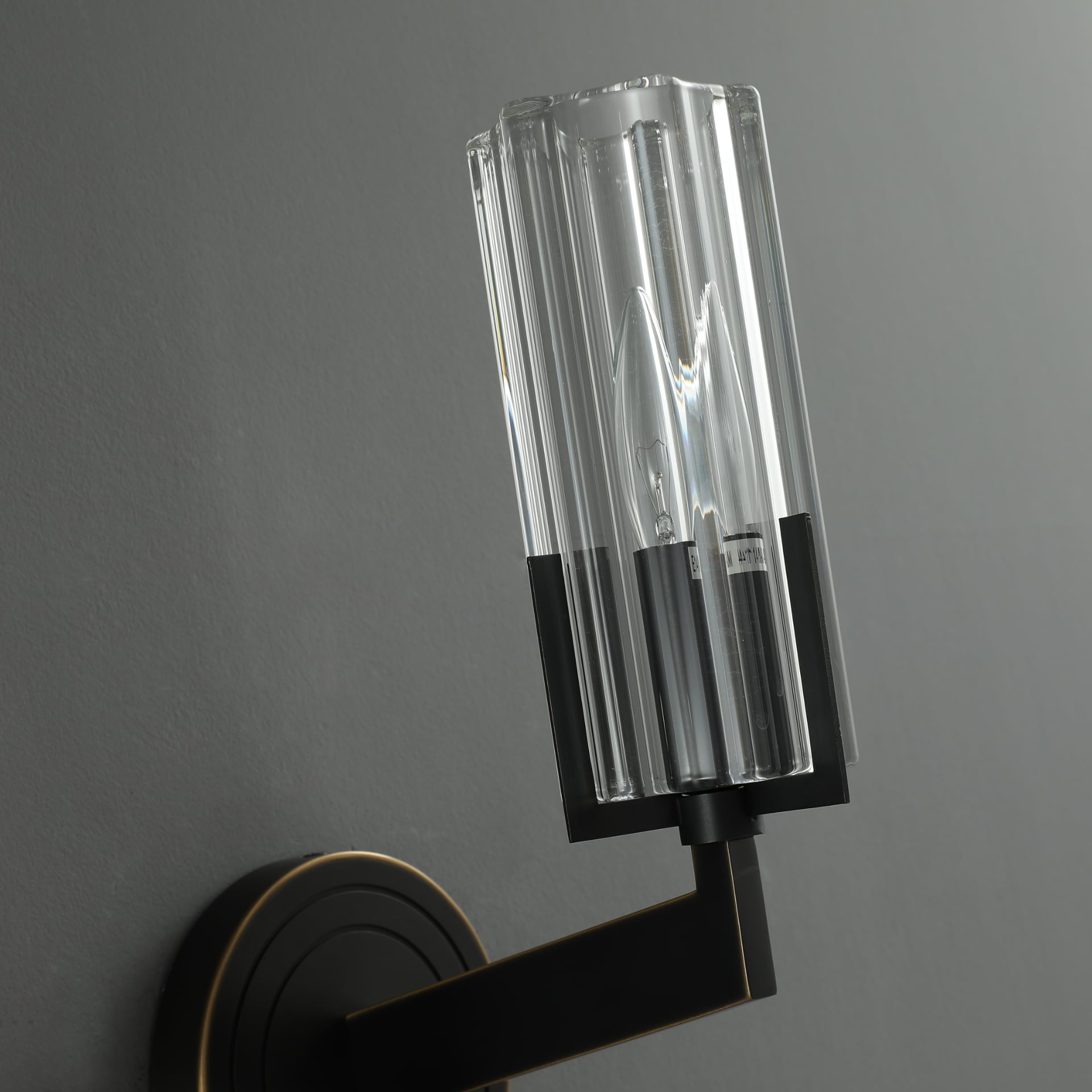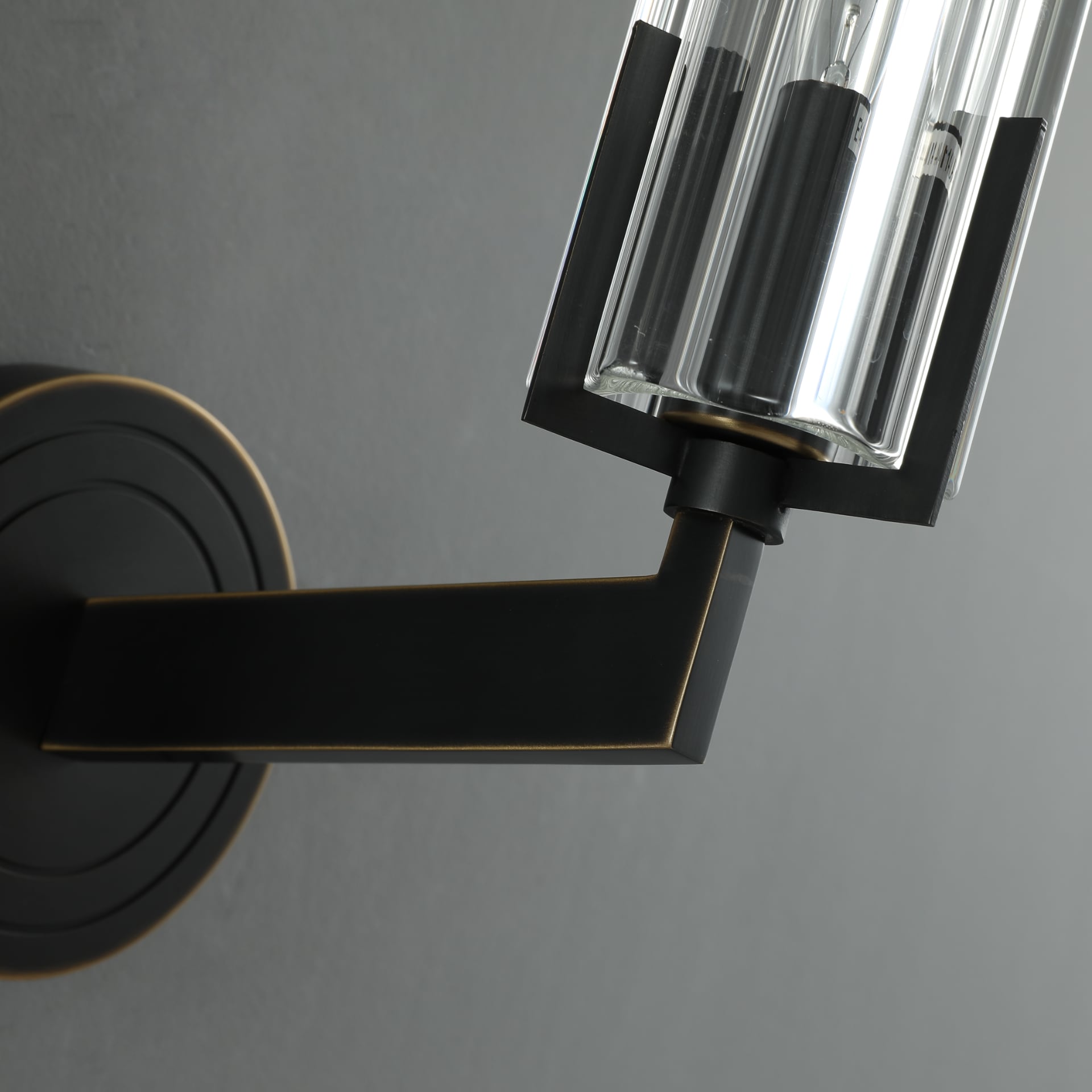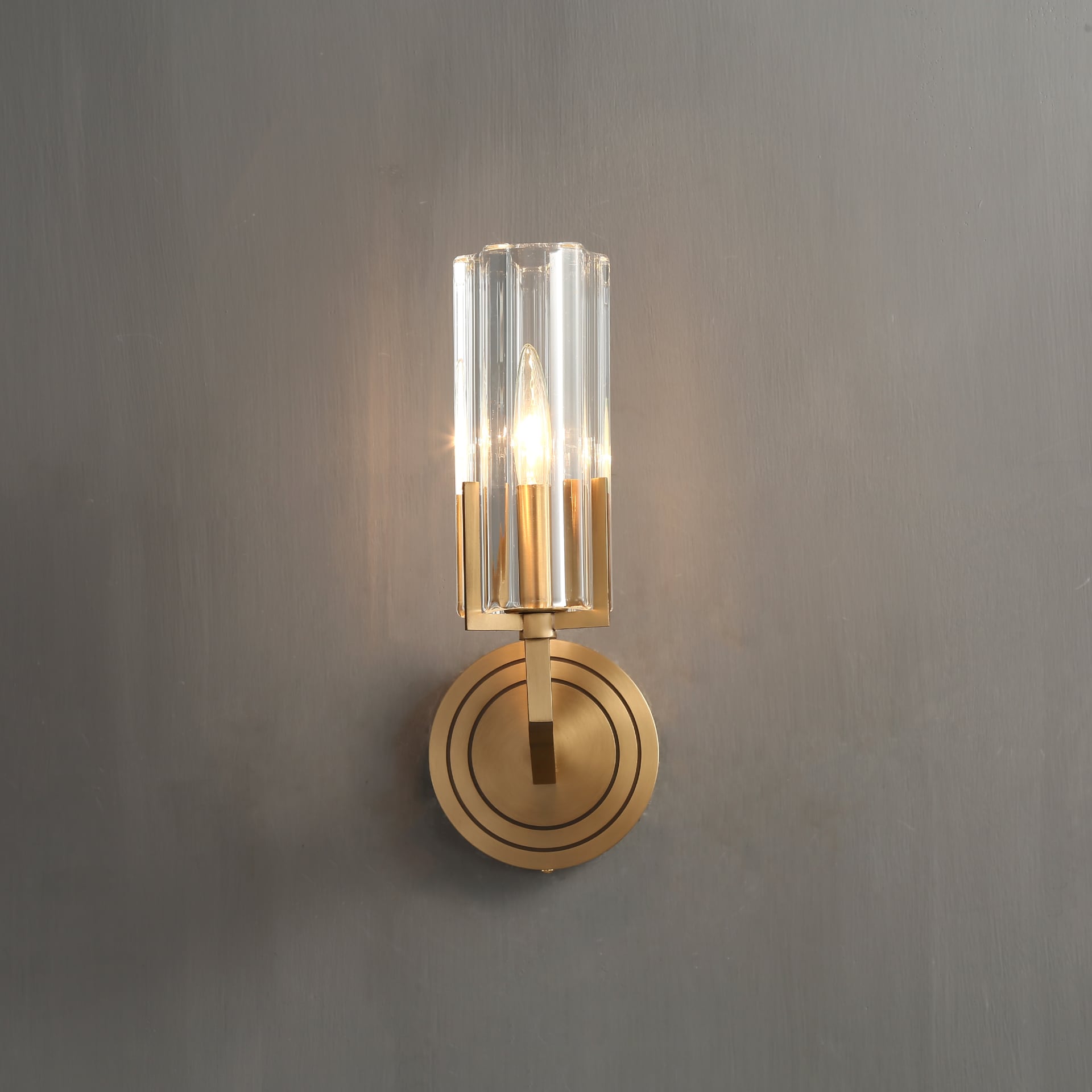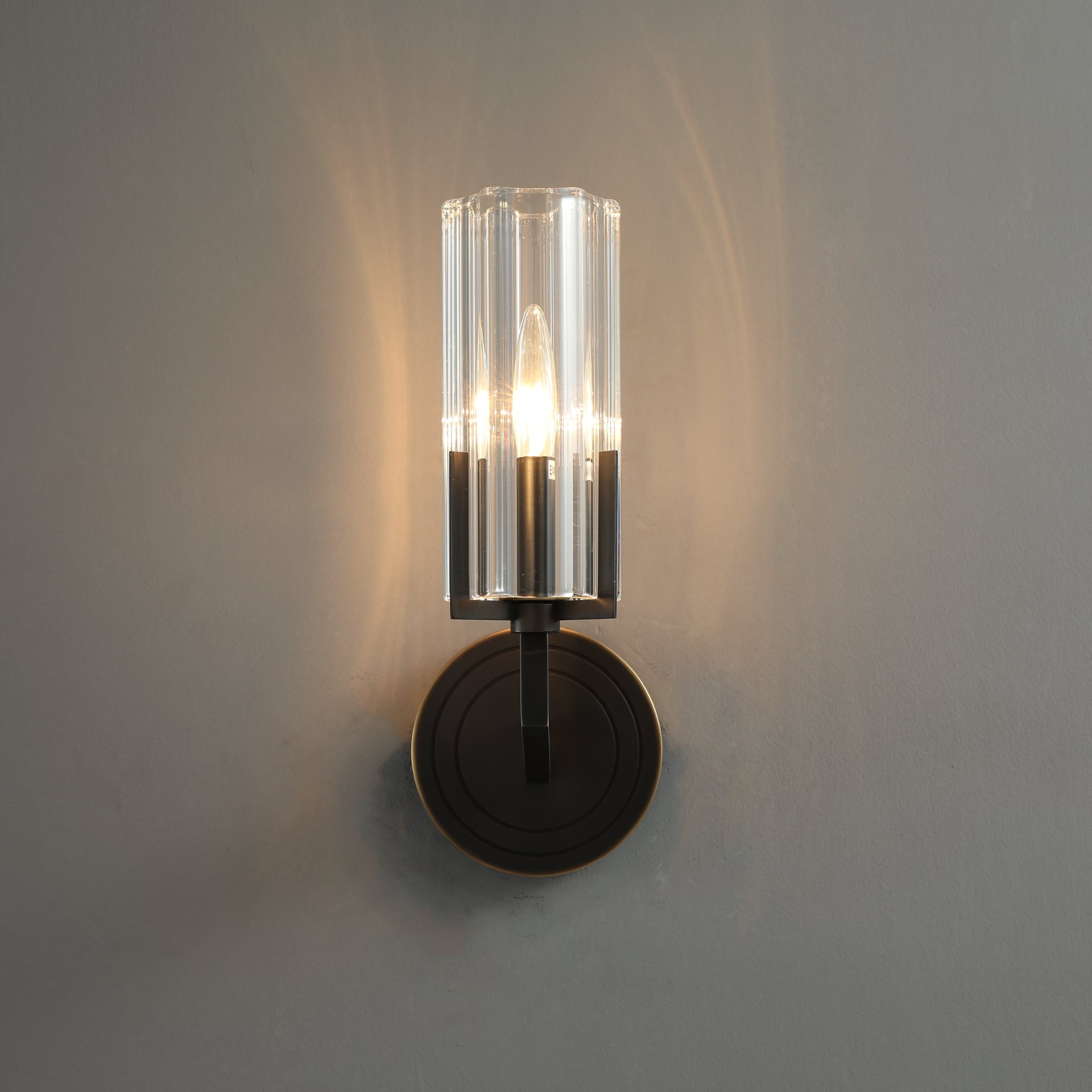 CELESTE as a wall light brings the collection's brass-and-glass language to a smaller, more focused format. A single solid brass arm holds a clear glass cylinder that diffuses light softly while still showing the bulb filament.