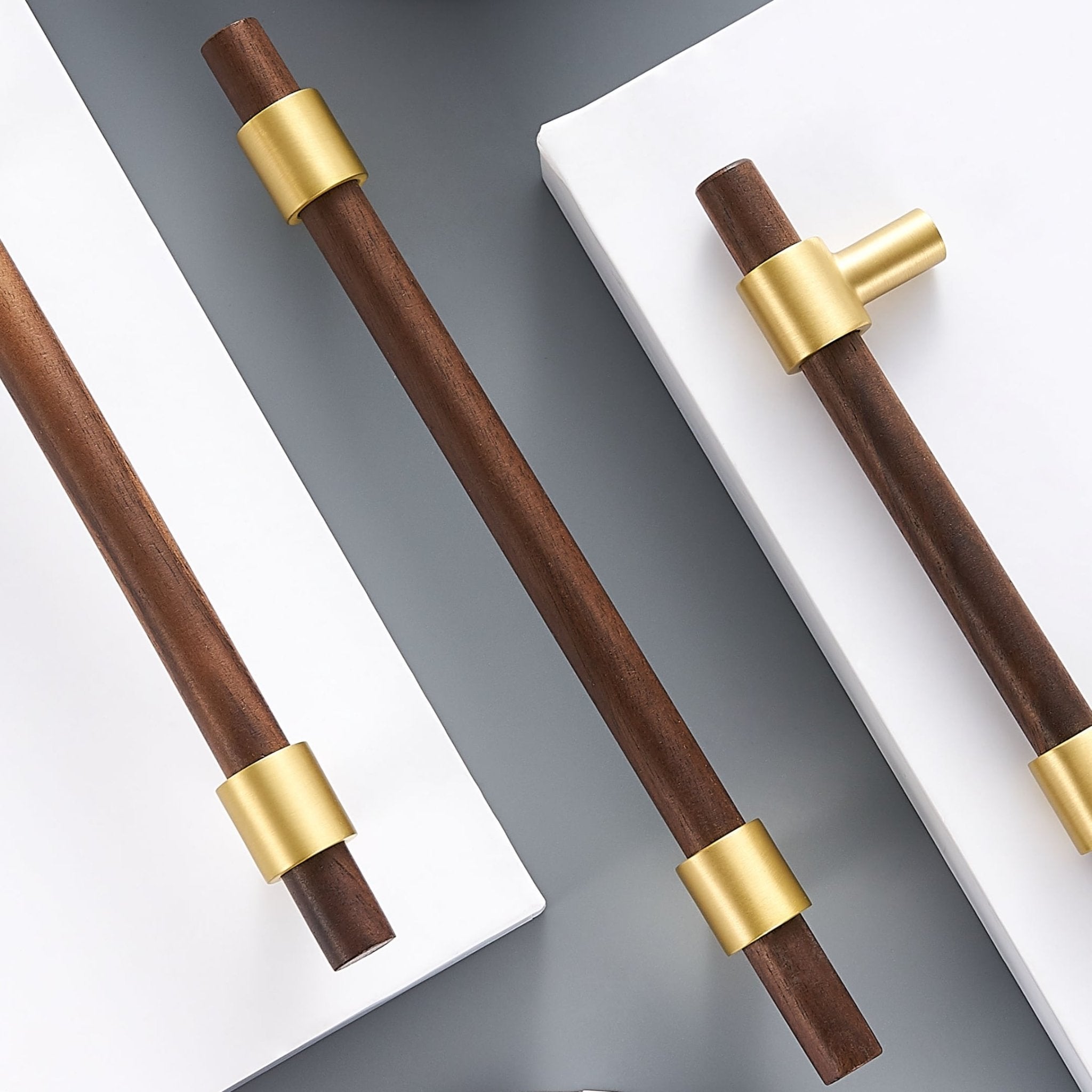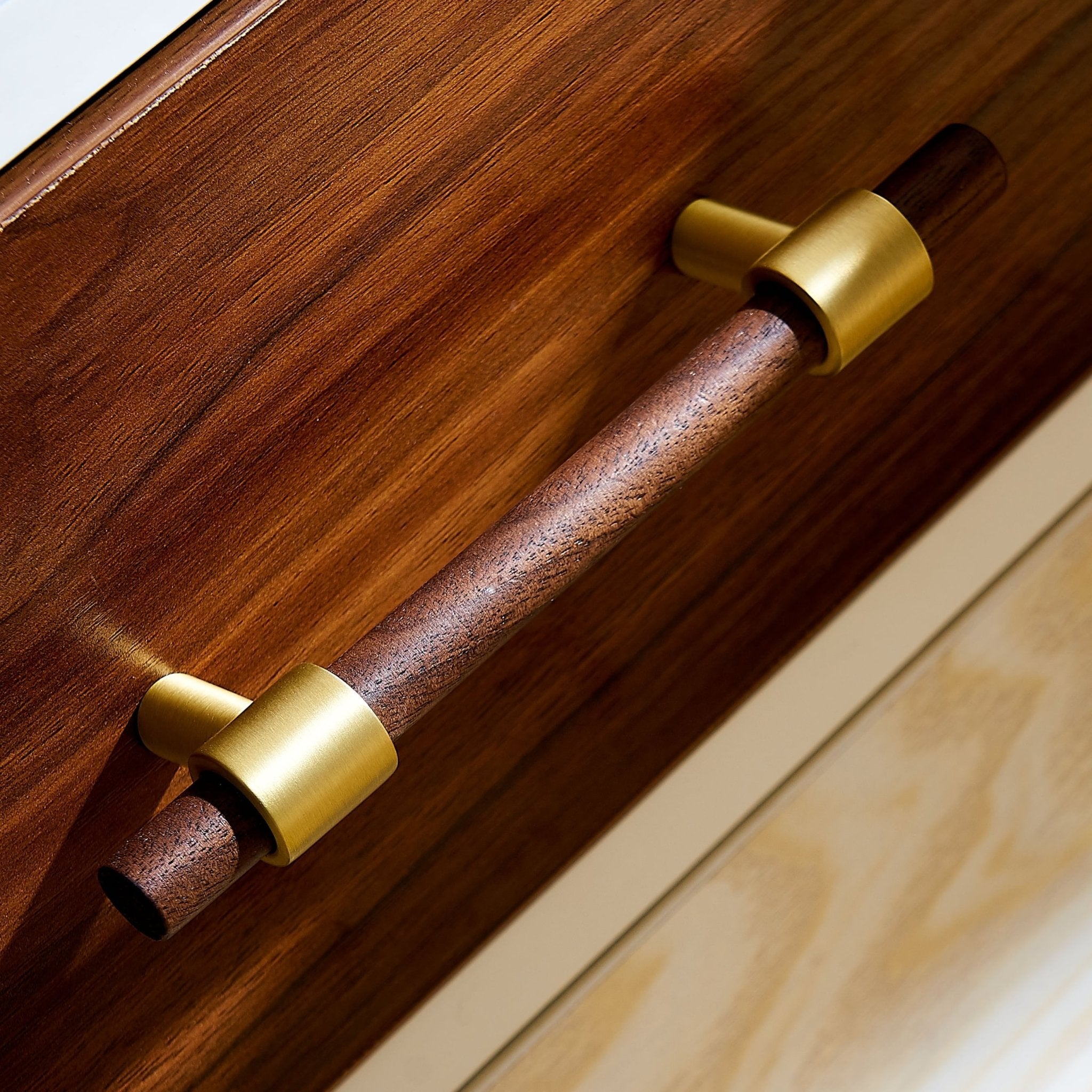 Walnut and brass is a natural pairing. The dark timber grain sits well against the warm brass tones, creating hardware that feels handmade without being overly rustic.