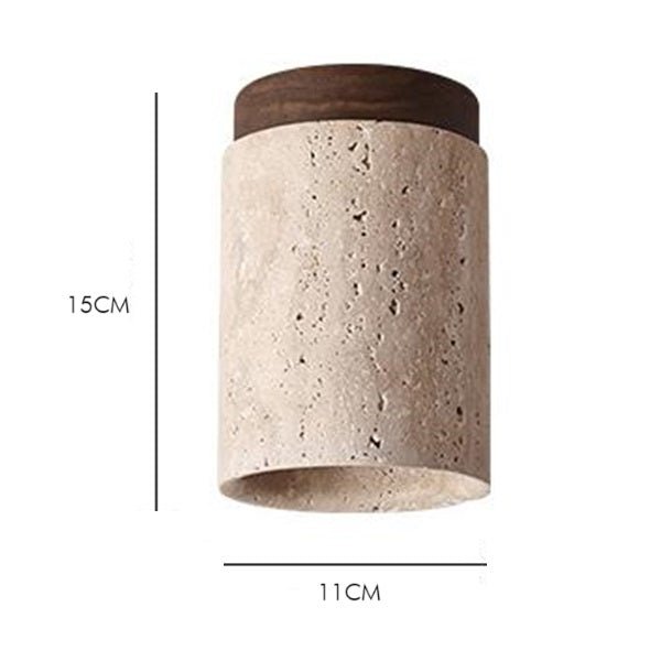 Natural stone and timber construction. The travertine provides textural shade while the wood base adds organic warmth. Suitable for bedrooms, hallways, or living areas requiring refined ceiling lighting.