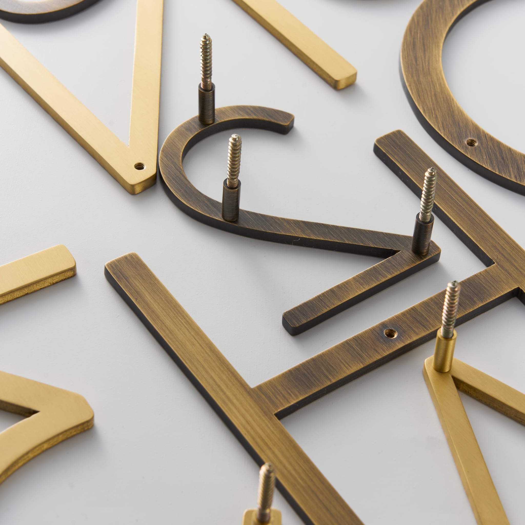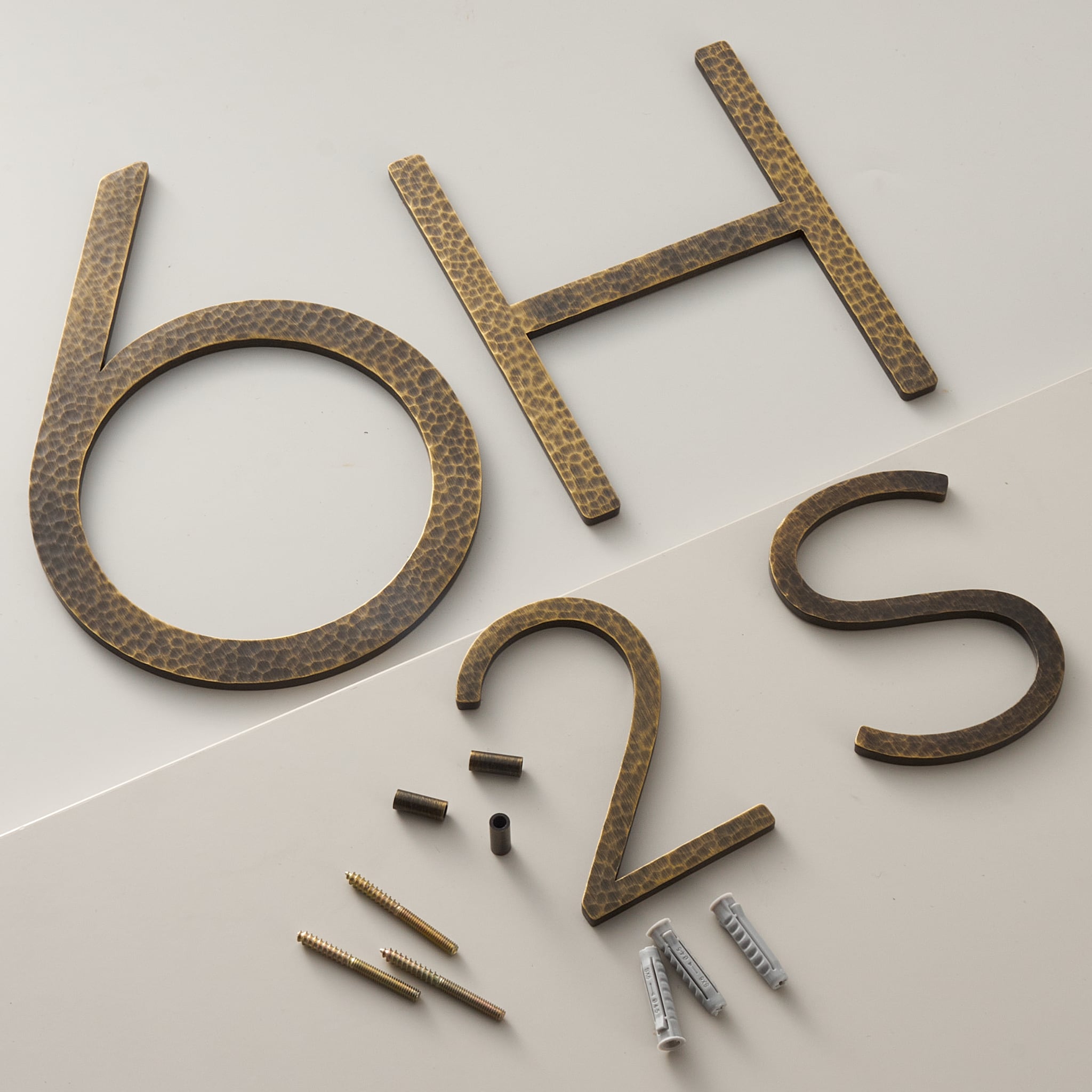 EZRA characters in hammered antique brass layer two textures: the dimpled, hand-hammered surface of the hammered range and the darker patina of the antique finish.… View product details