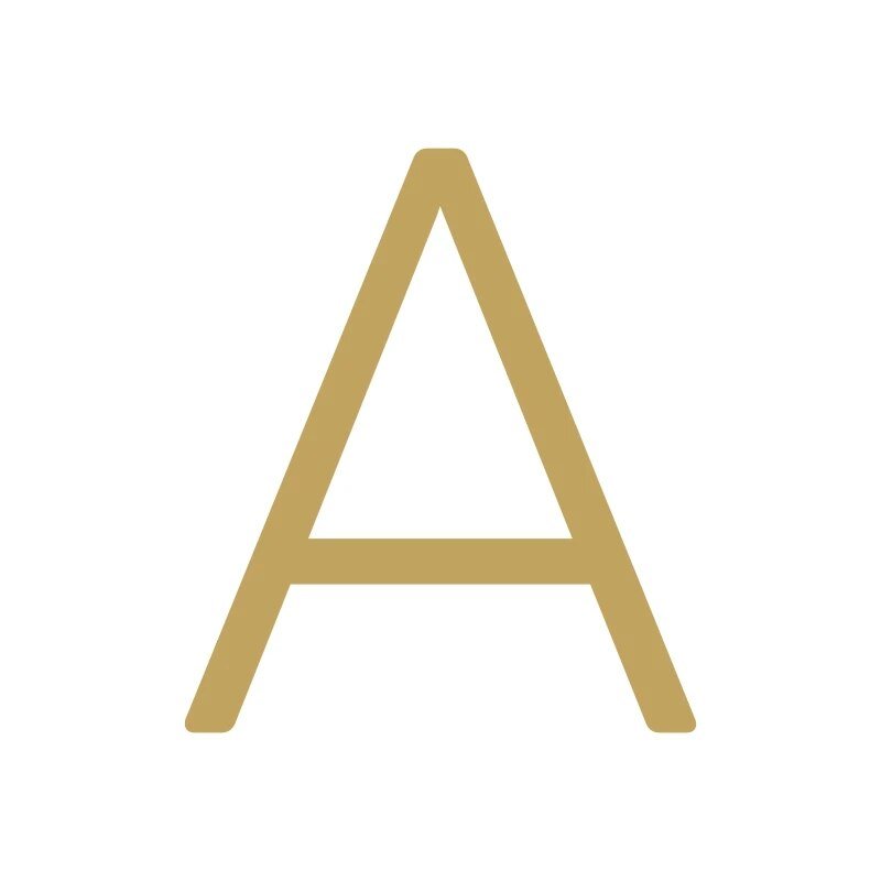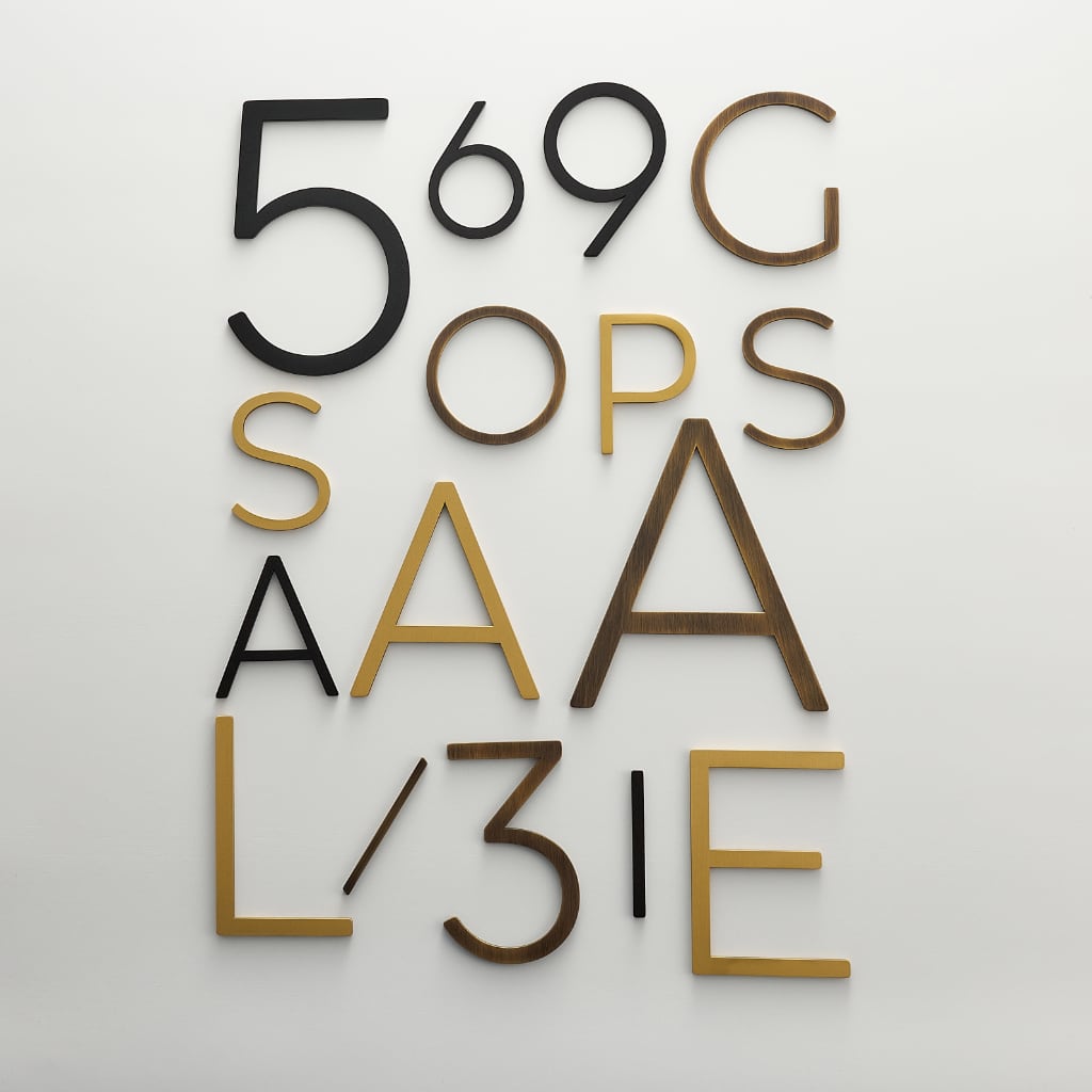 EZRA characters in satin brass pair the collection's geometric sans-serif typeface with a warm, brushed brass finish. Letters and numbers share the same proportions, so addresses that mix both read as a single, considered piece of signage.