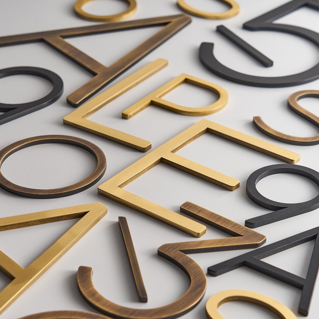 EZRA numbers in antique brass have a warm, heritage tone that suits period properties and homes with traditional character. The smooth surface lets the serif letterforms speak cleanly.