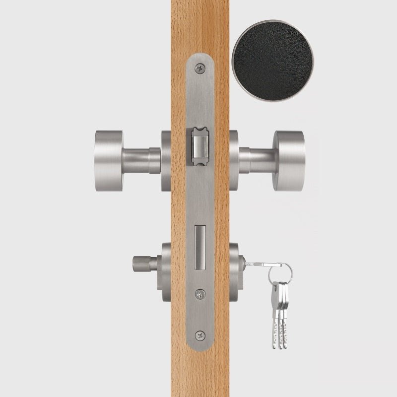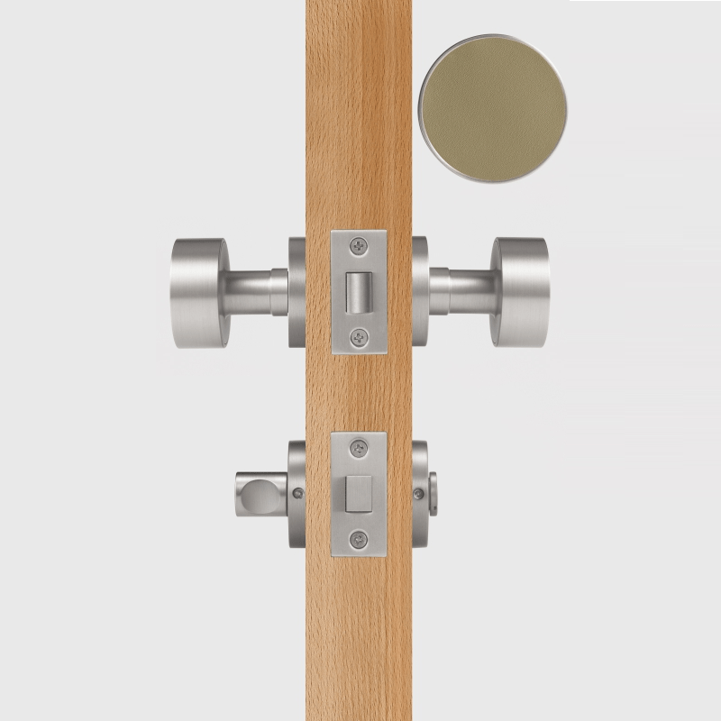 Solid brass with Italian leather. Includes knobs, roses, and lock mechanism. Covered by a 10-year warranty.