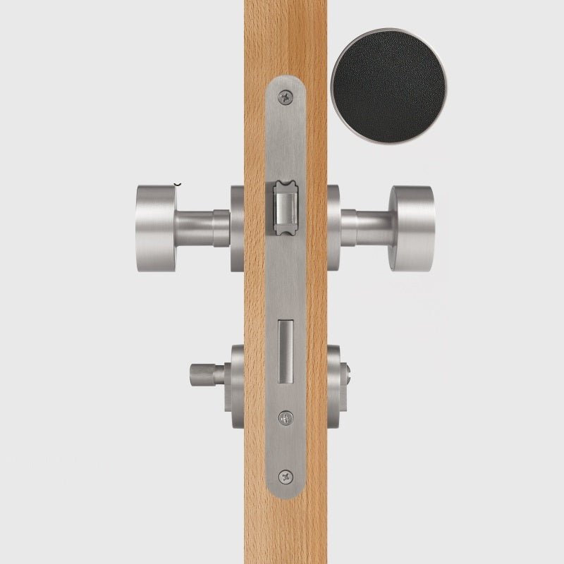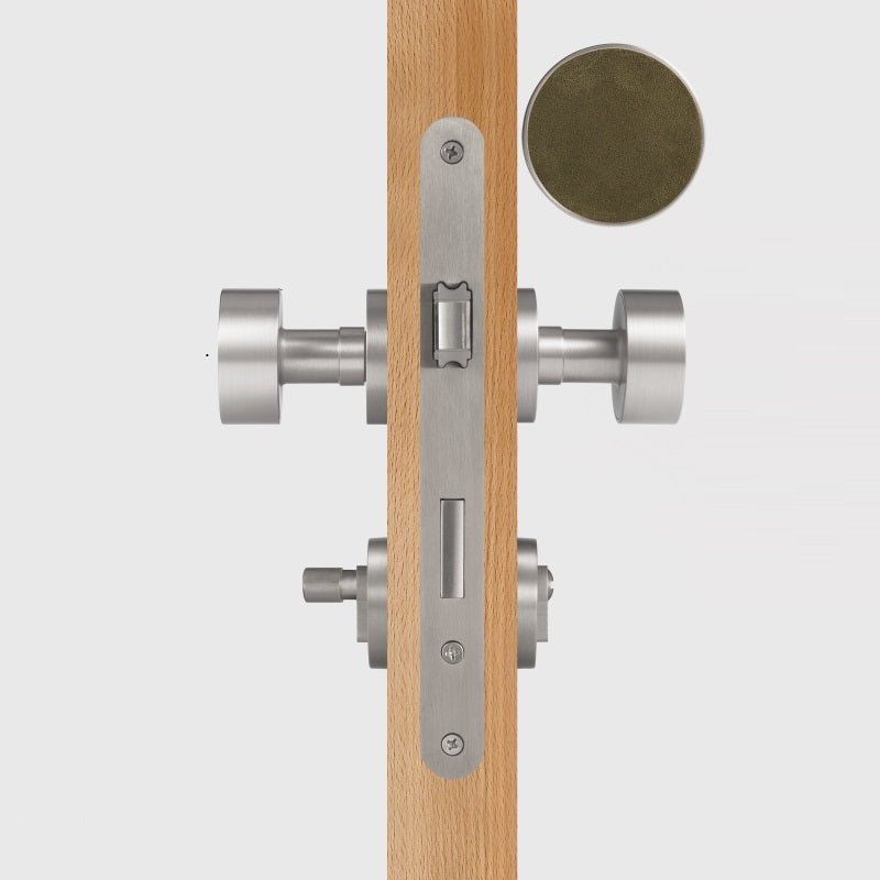 Six leather colours: Cuoio Siena, Grigio Milano, Nero Roma, Pesca Verona, Rosa Firenze, and Verde Umbria. Multiple lock configurations for bedrooms, bathrooms, living areas, and fixed applications.