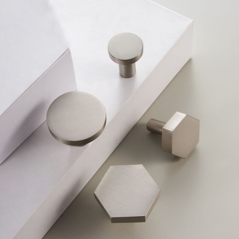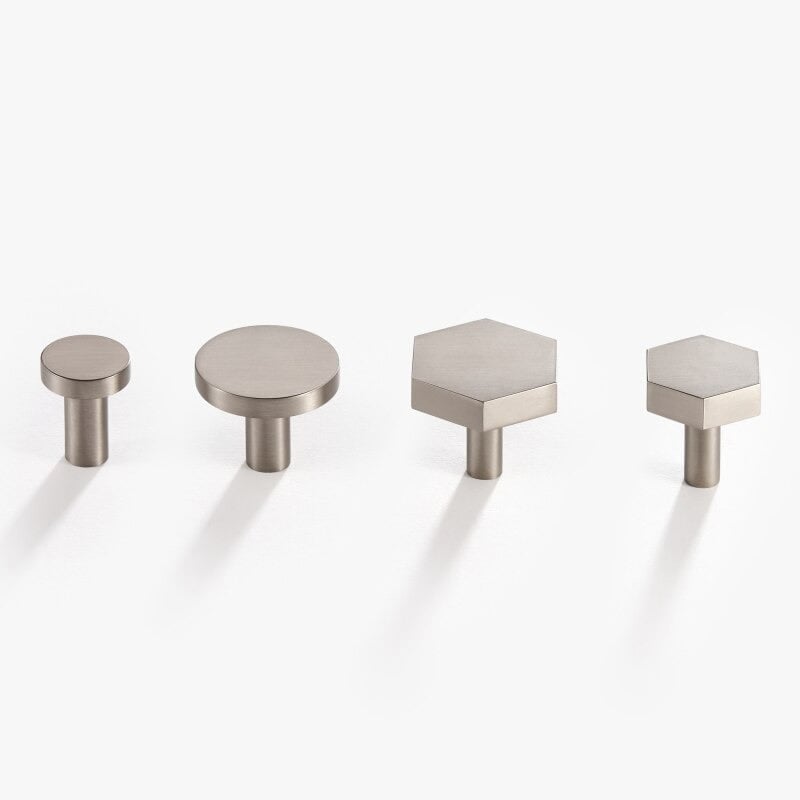GESTALTE brings architectural geometry to everyday hardware. The hexagonal profile creates six flat surfaces that catch and reflect light differently throughout the day, adding subtle visual movement to otherwise static cabinetry. For those who prefer softer forms, a round option offers the same material quality in a more traditional silhouette.