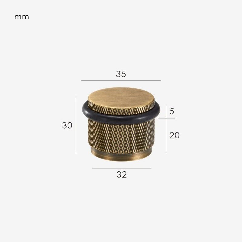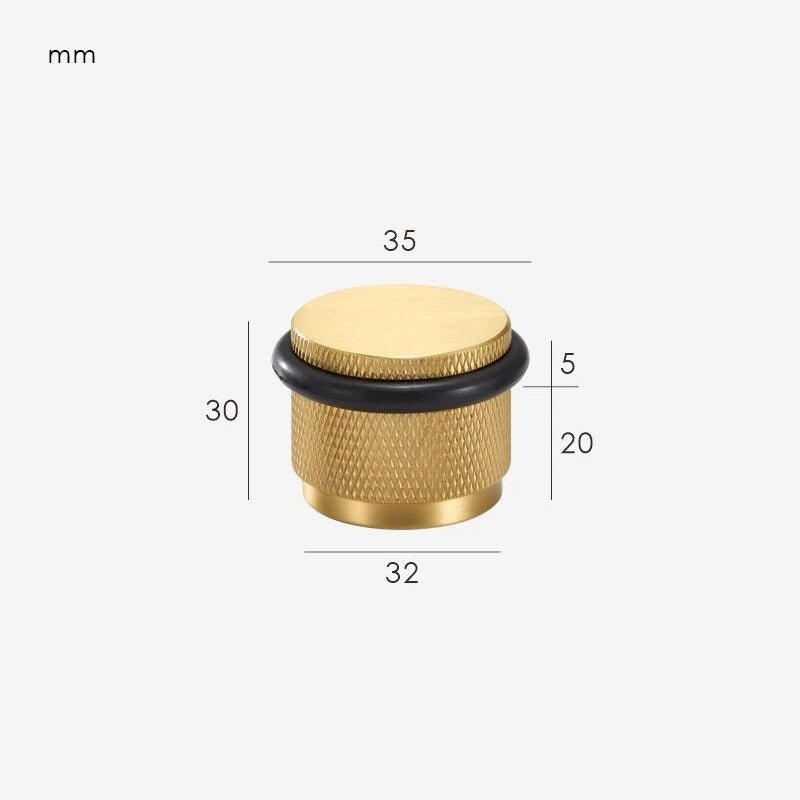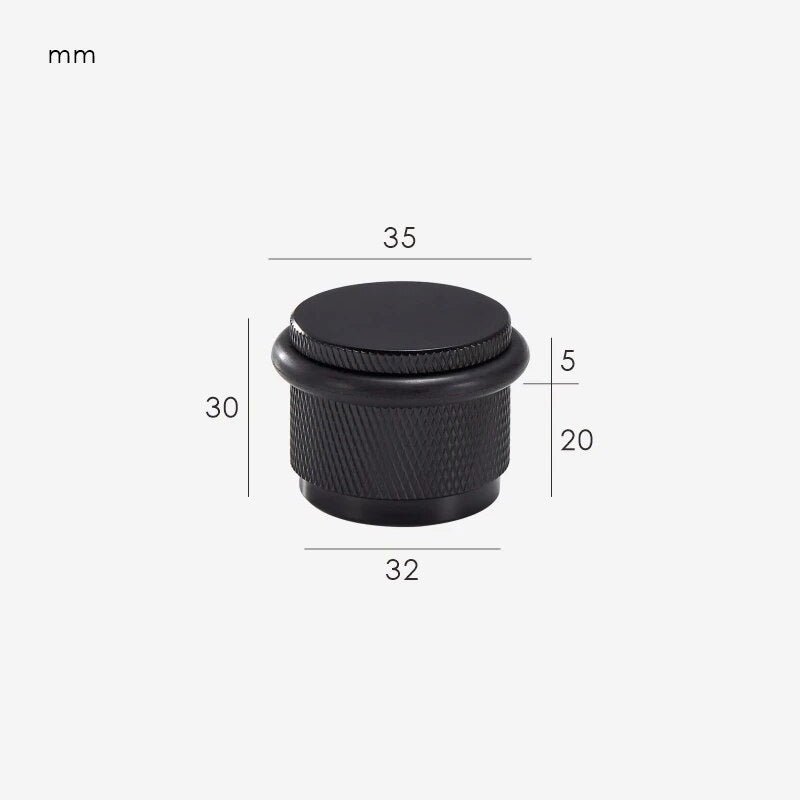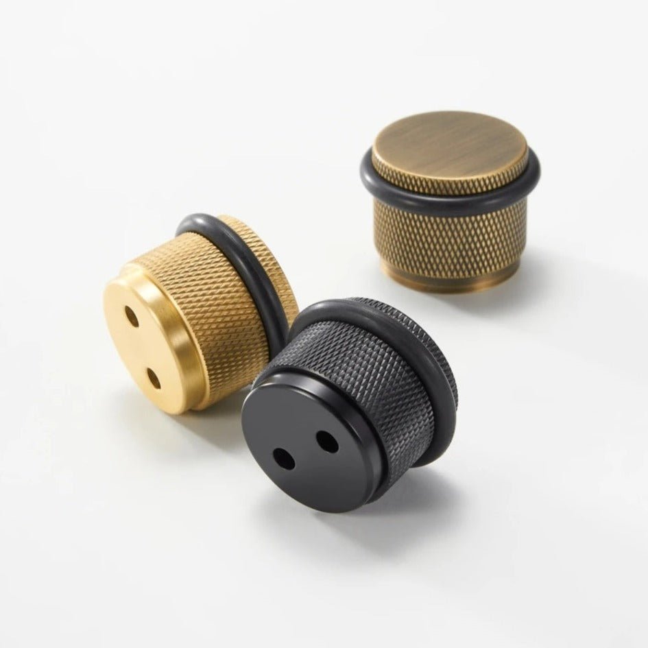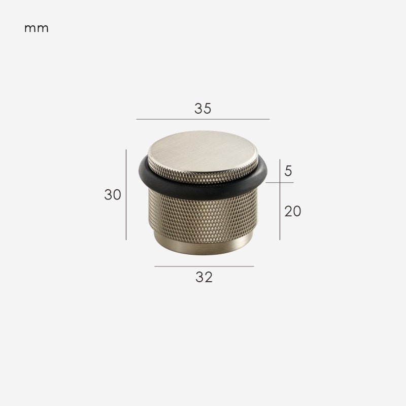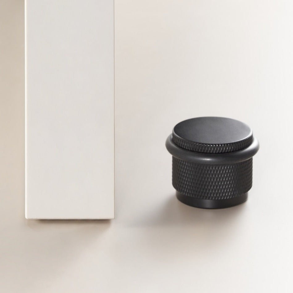The GUM is a compact, floor-mounted door stop with a knurled cylindrical body and an integrated rubber bumper ring that protects both the door and the stop itself. The proportions are deliberately chunky, giving it enough visual presence to sit alongside substantial door hardware without looking like an afterthought.