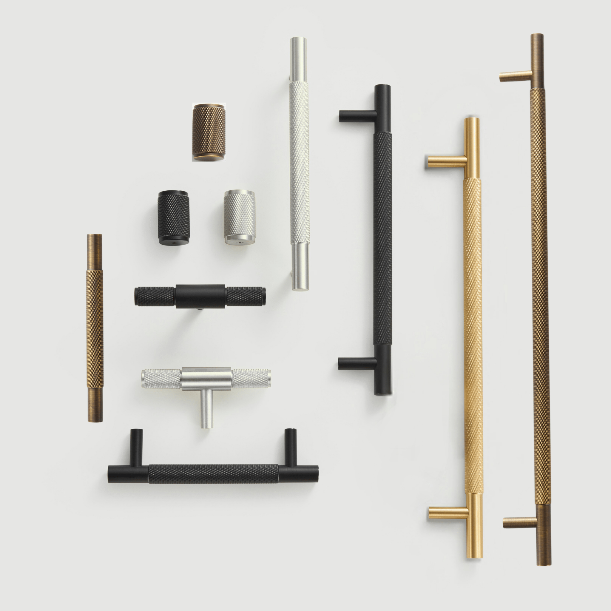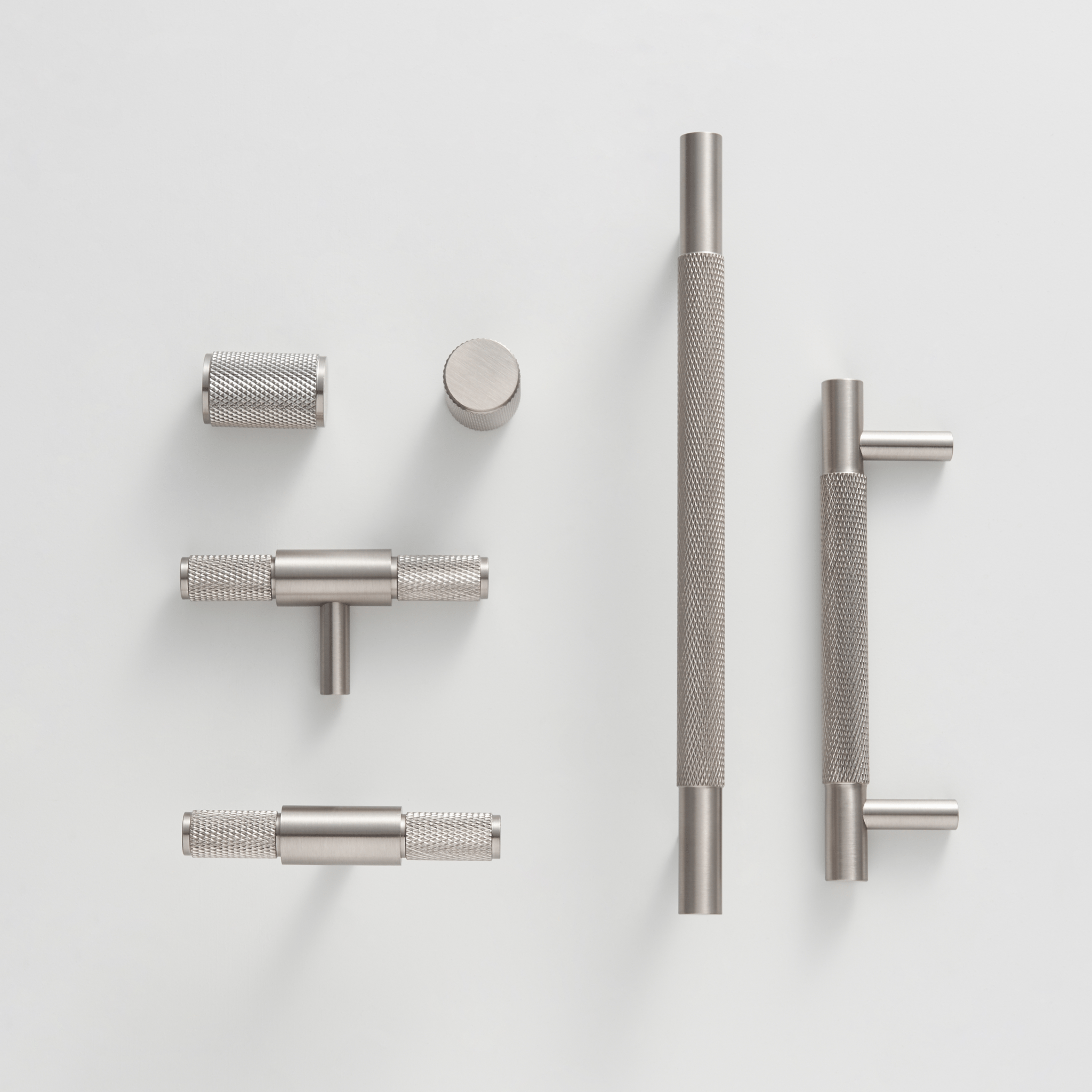 HART handles carry the same diamond-knurled texture as the lever door handles and knobs, extended into a longer bar for drawers and wider cabinet doors. Using HART across door hardware and cabinetry gives a room a unified, considered feel.