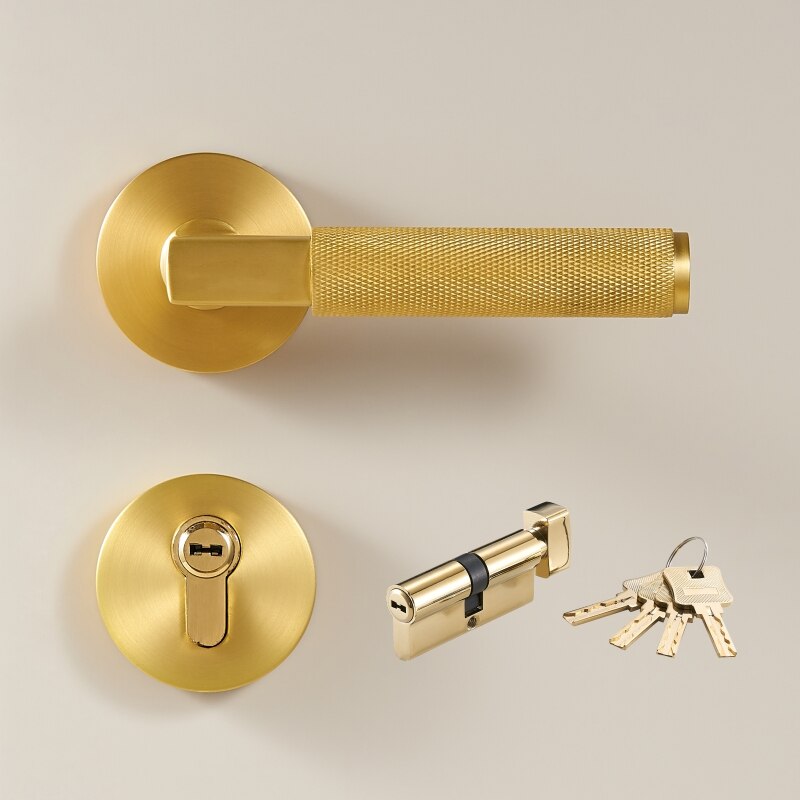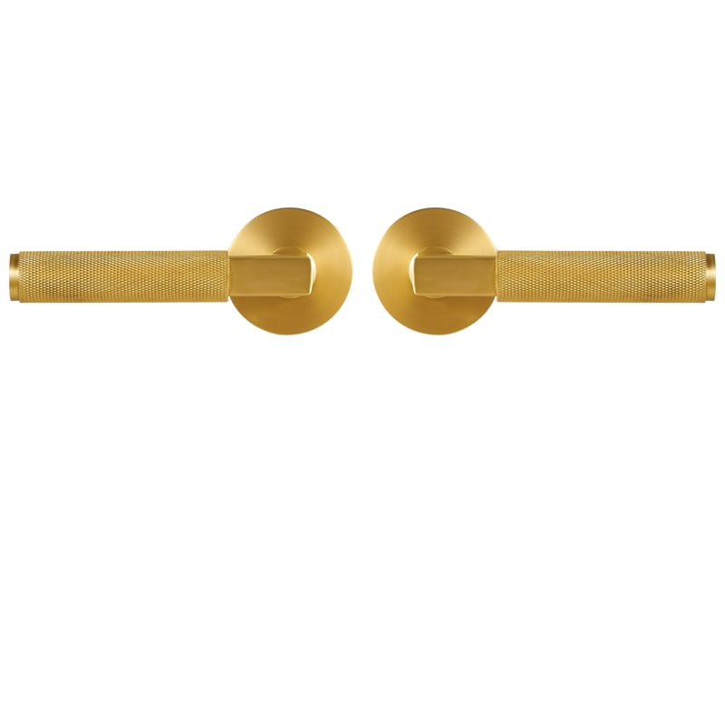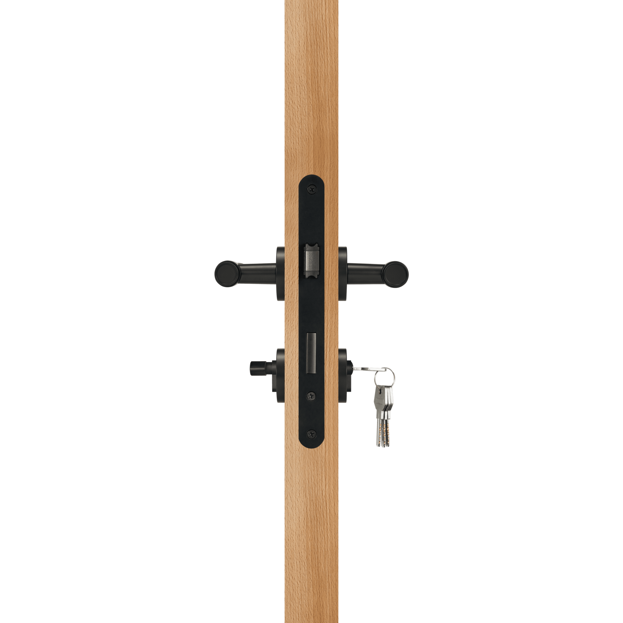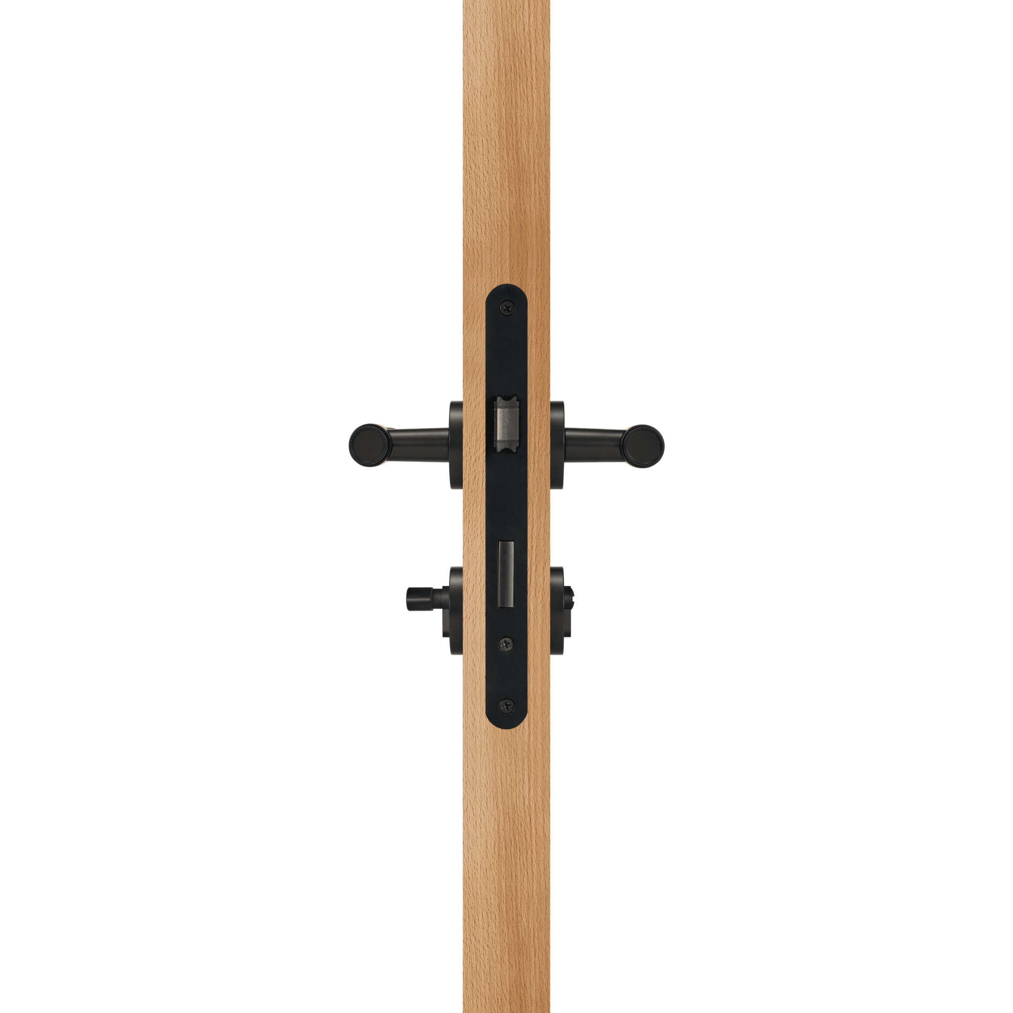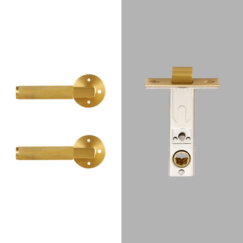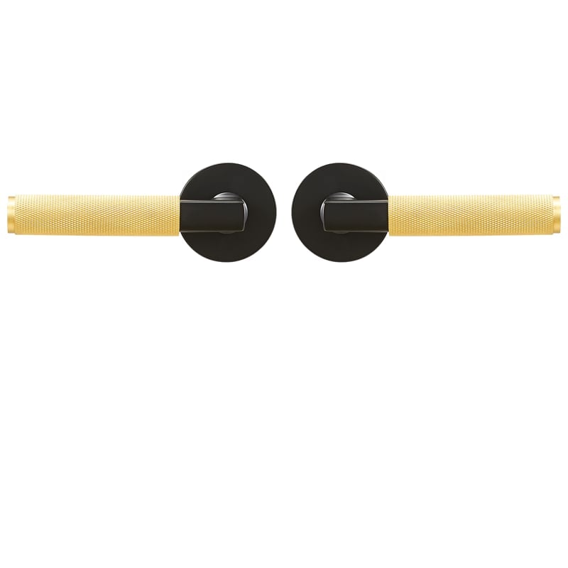 Available in matte black, satin brass and a two-tone satin brass with matte black combination. Lock configurations include dummy (fixed), passage, privacy (with snib or rose button) and entry sets with key or thumbturn mortice locks. Compatible with UK/EU and North American door standards. Sold as a pair with all fixings included.