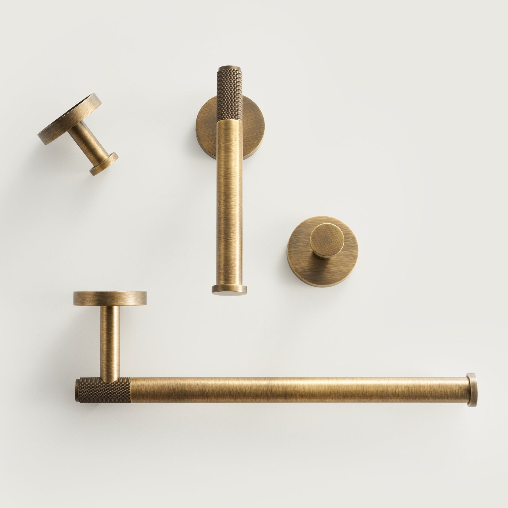 Solid brass construction. Available in satin brass, matte black, satin nickel, and antique brass. Wall-mounted with concealed fixings. Part of the KRAM bathroom range, which includes matching robe hooks and towel rails.