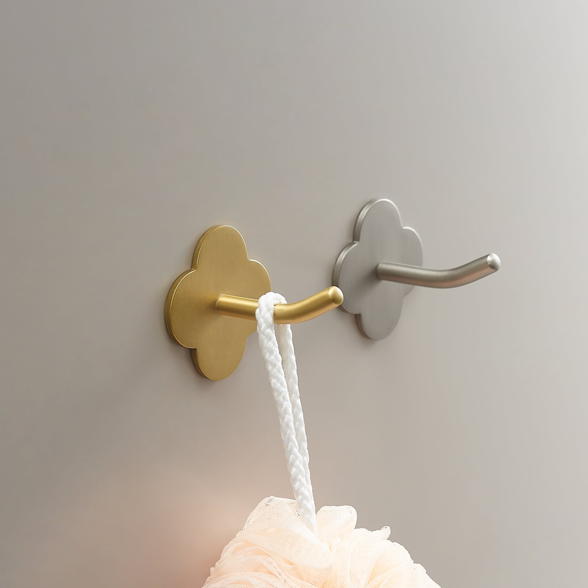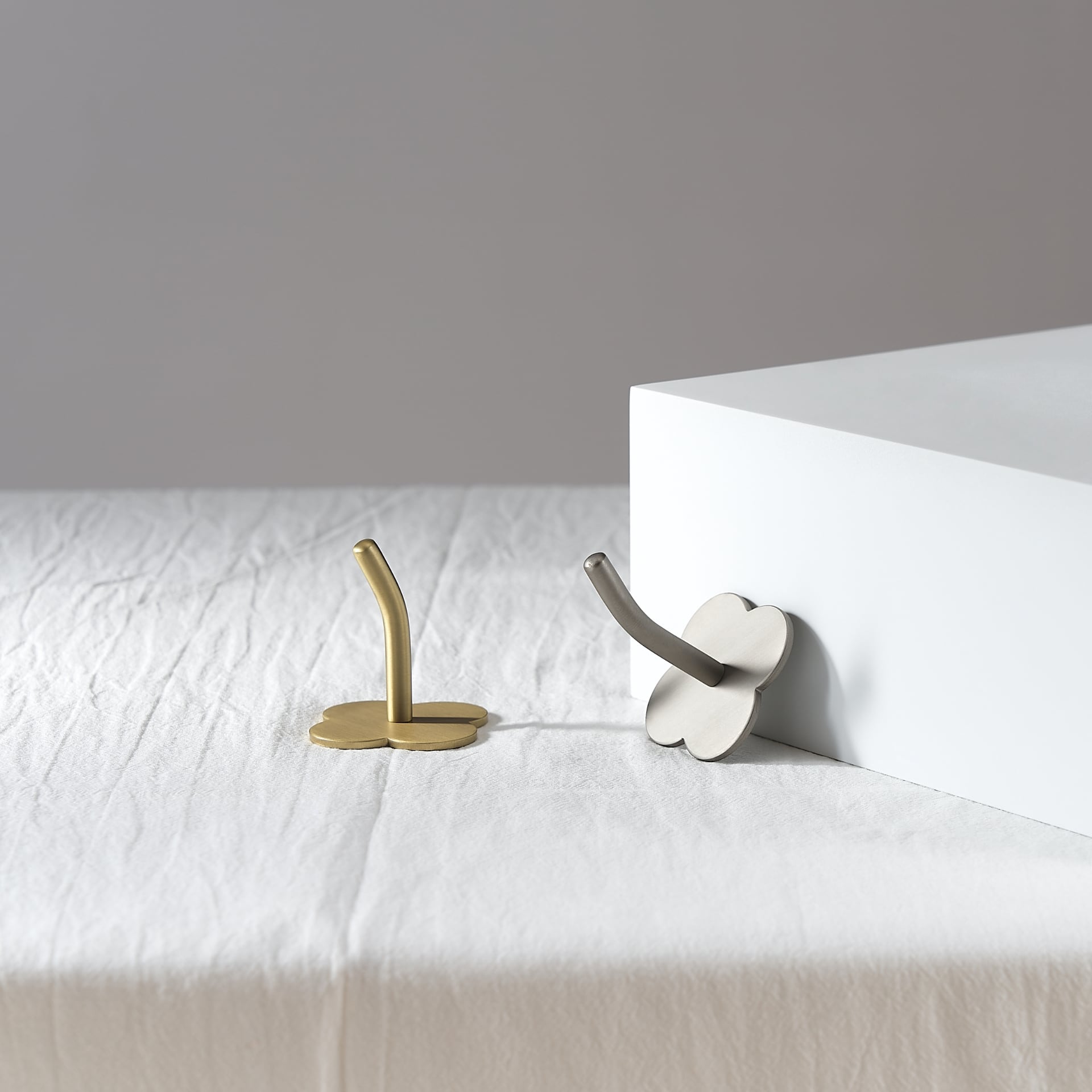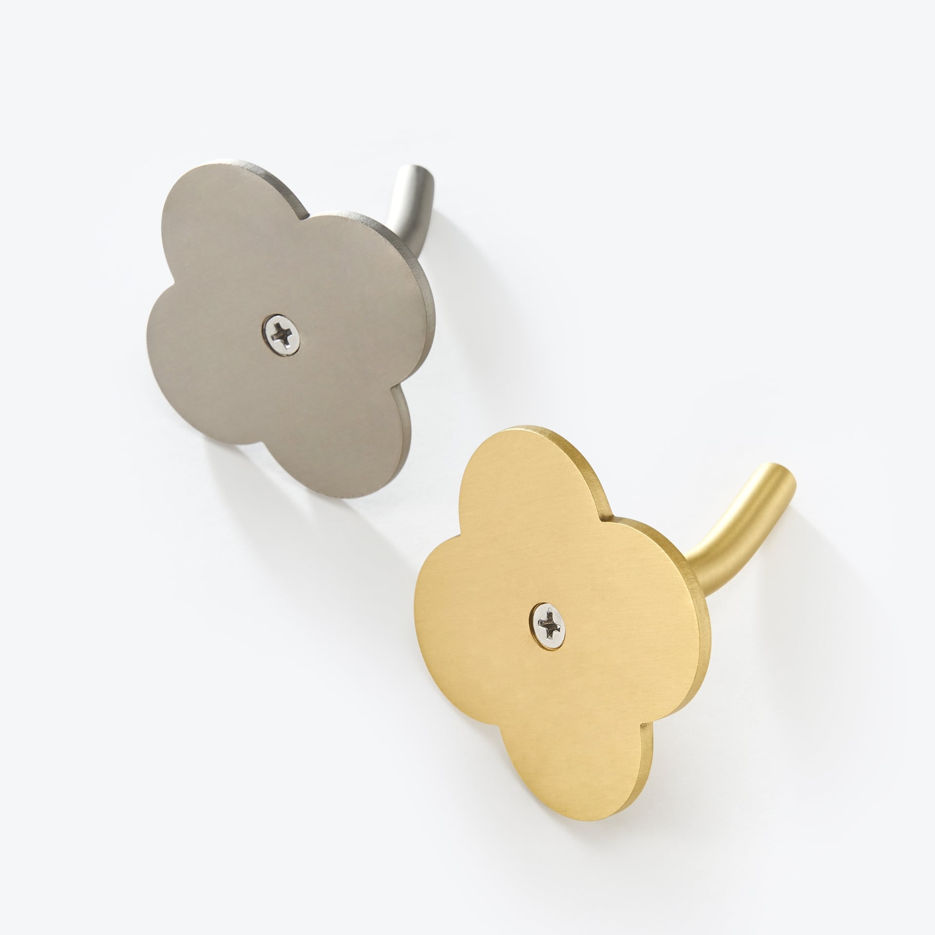 The LAMO hook takes its shape from a four-petal flower, giving it a playful, sculptural quality that stands apart from standard wall hooks. It is solid brass throughout, wall-mounted on a concealed fixing plate, and strong enough for coats, bags, and towels.
