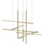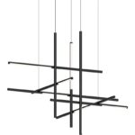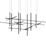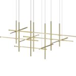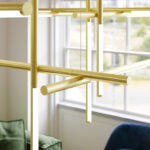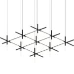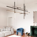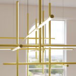 The LINEA Chandelier reduces the chandelier form to its essentials: a precise iron lattice and milled-edge cylindrical shades that read as drawn lines in space. The crossed-bar frame is electroplated to a satin brass or matte black finish, with PMMA acrylic shades that diffuse the integrated LED into a soft, even glow.