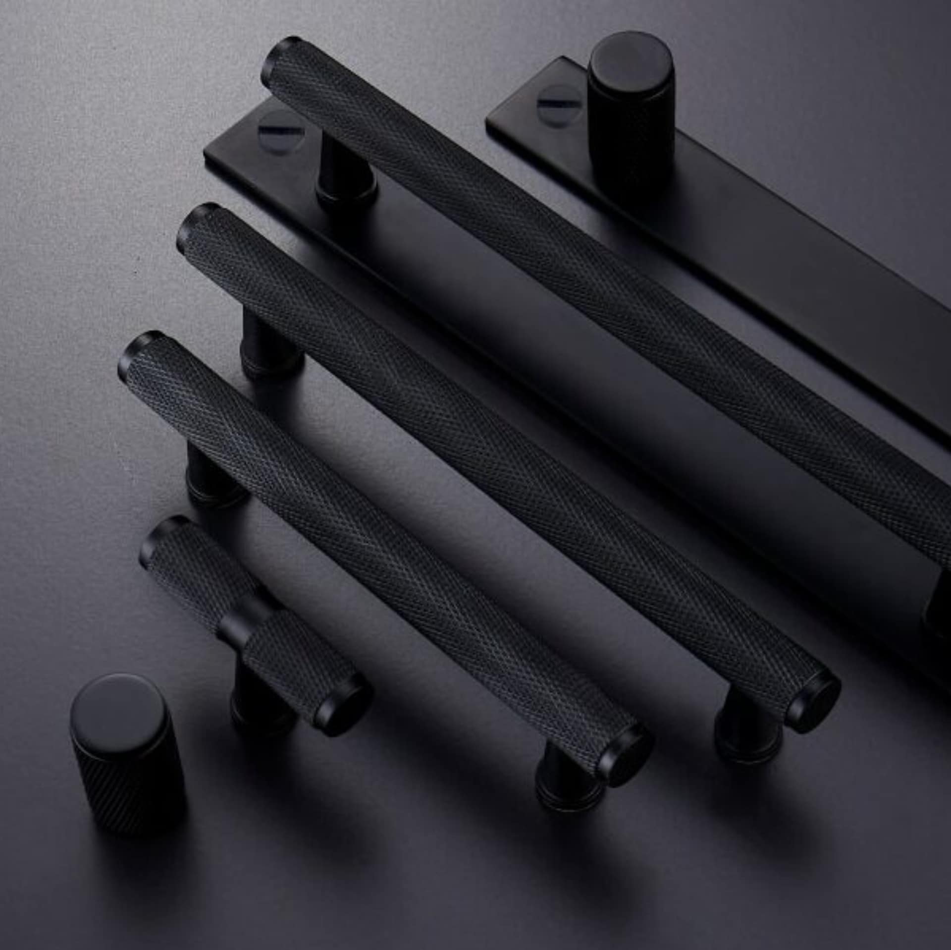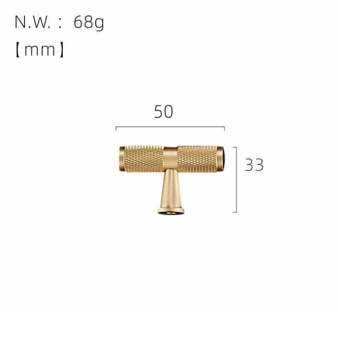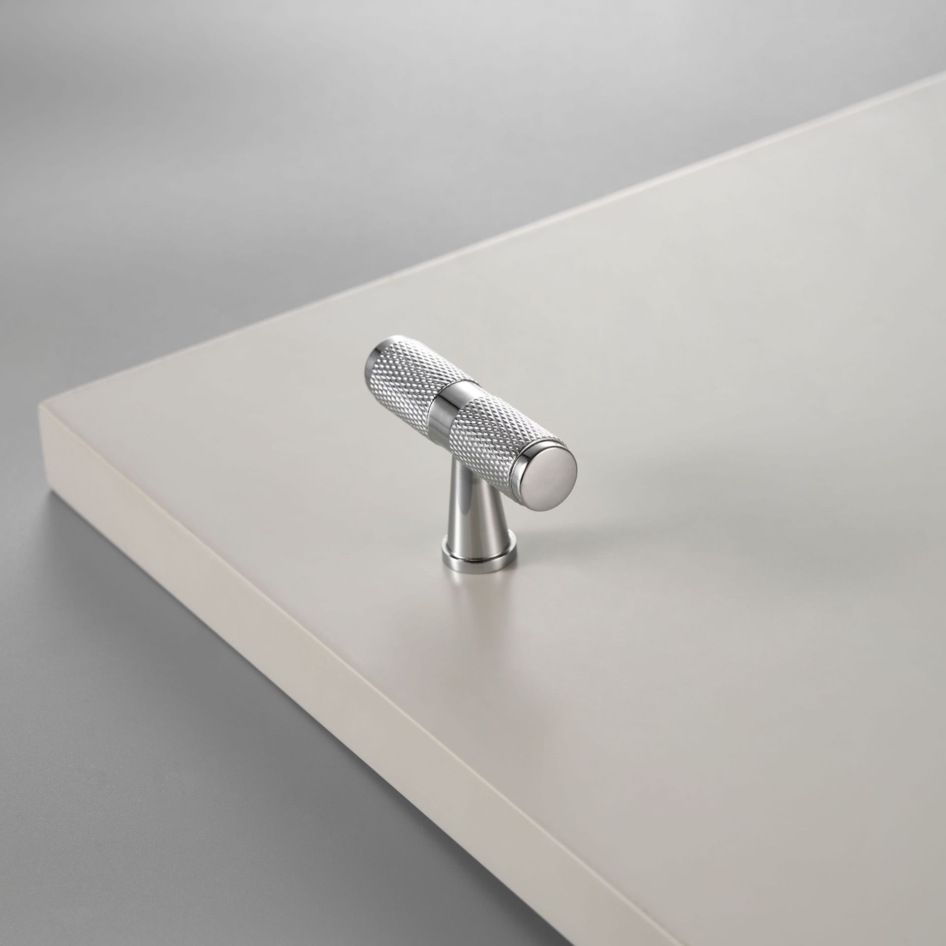 The LUX T-bar brings the collection's fine knurled texture to a compact pull format. The diamond-pattern grip is machined into solid brass, giving the small piece a tactile, purposeful quality.