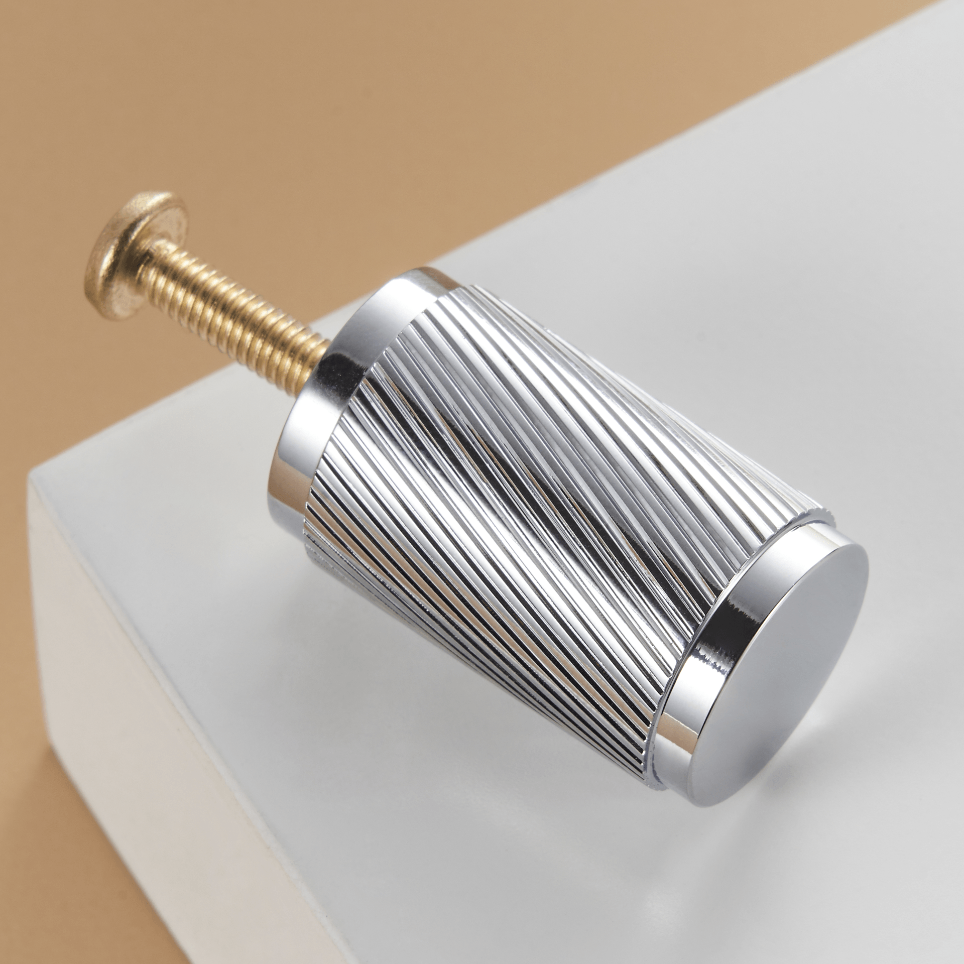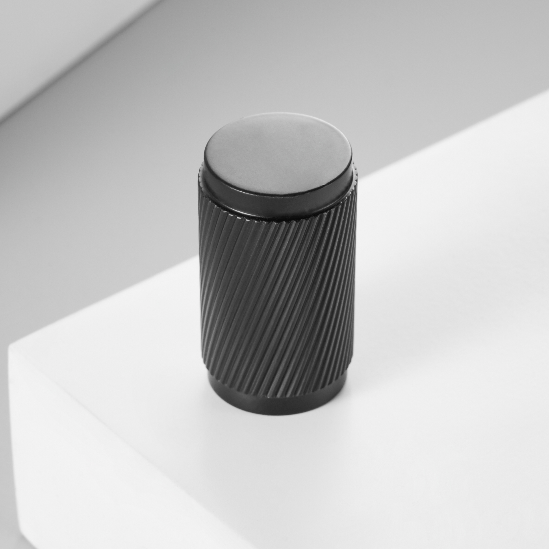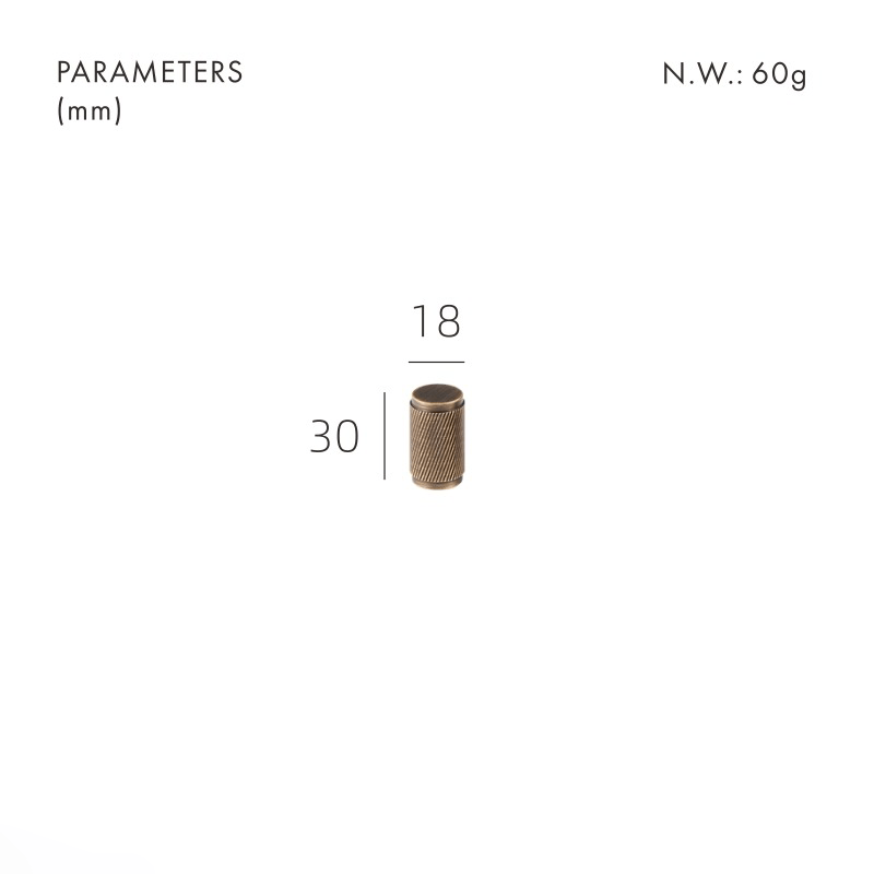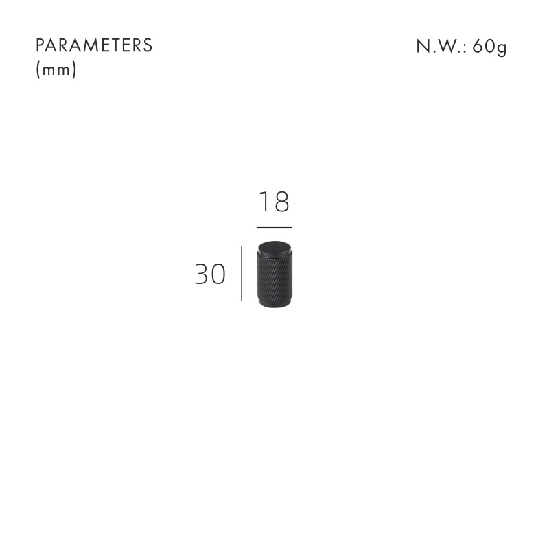 The MAURITZ knob is the smallest piece in the collection: a compact cylinder fully covered in diamond-knurled texture. It suits smaller drawers, upper cabinets, and anywhere you want the knurled look without the footprint of a bar or handle.