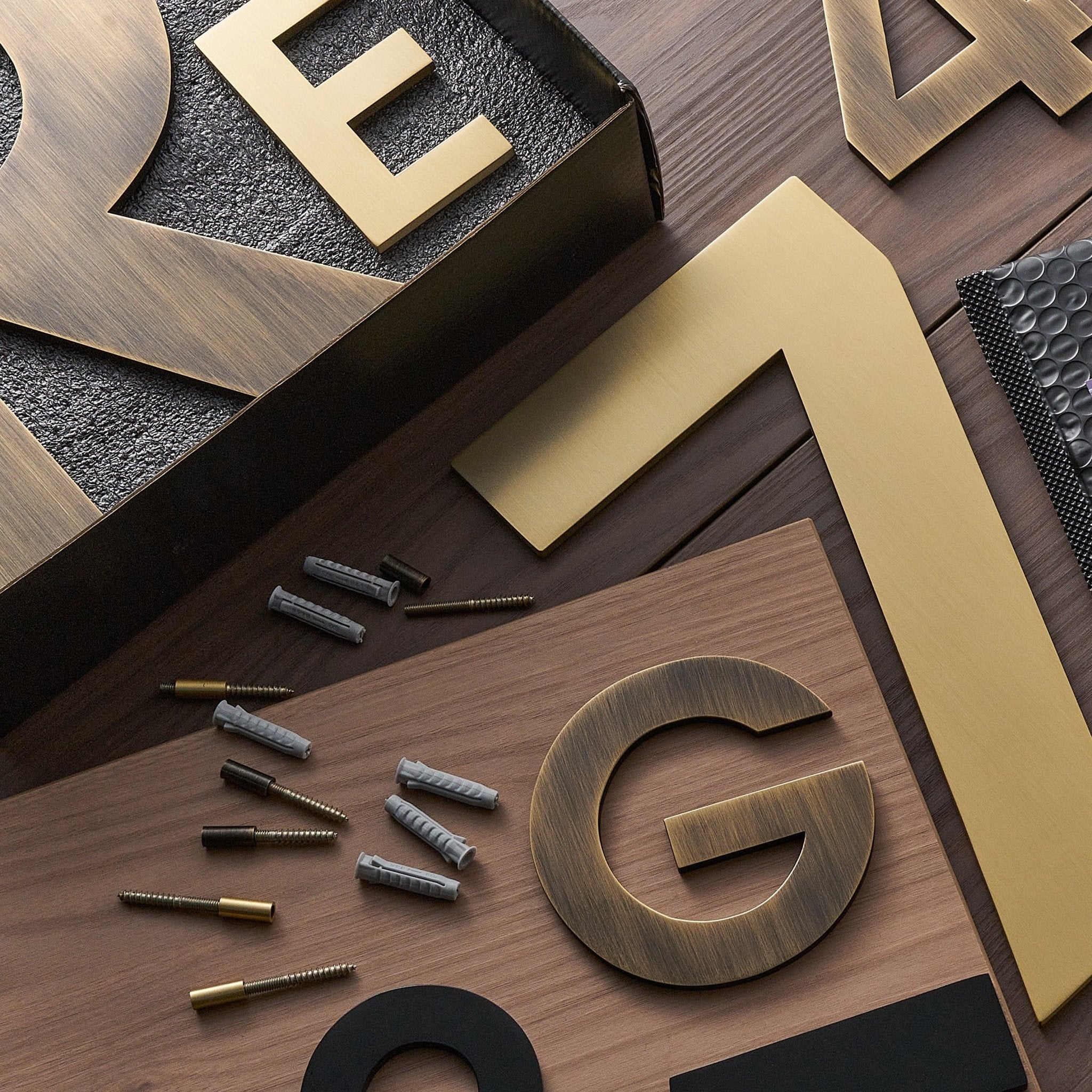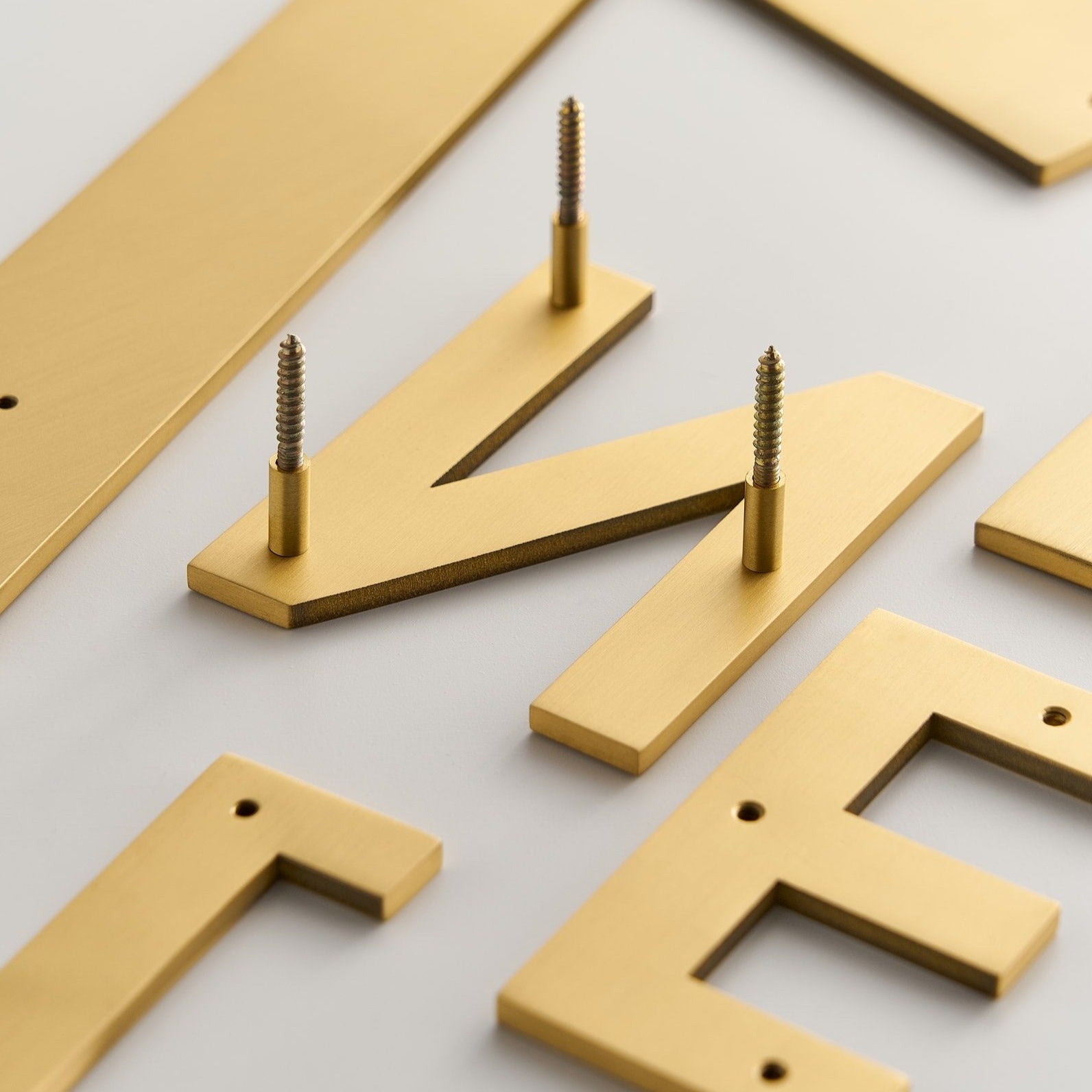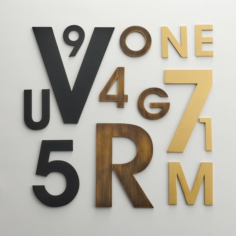 METRO letters match the numbers in scale and style, so you can spell out a house name or add a letter suffix to your number. The same bold, architectural proportions in satin brass with a warm, polished surface.
