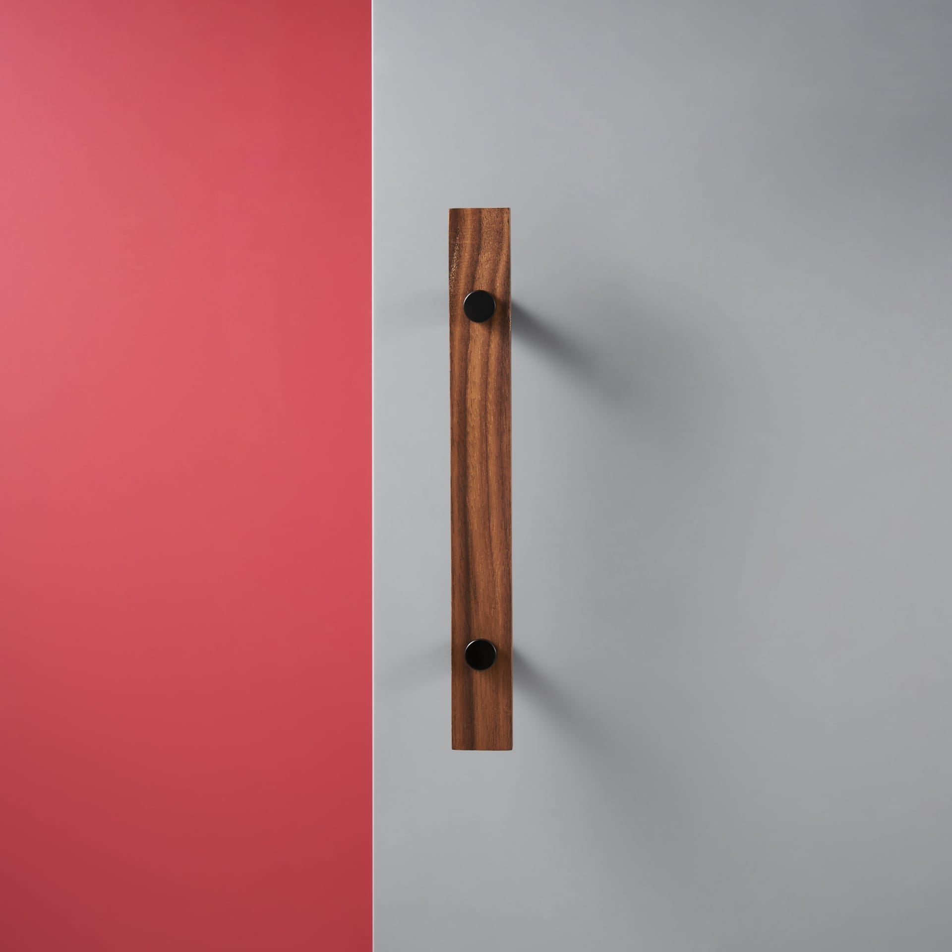 NUX handles pair a solid walnut bar with brass end posts, combining natural timber with metal hardware. The walnut has visible grain and a warm, organic quality that softens the look of a kitchen or bathroom. Available as a T-bar or as a longer handle, in multiple sizes.
