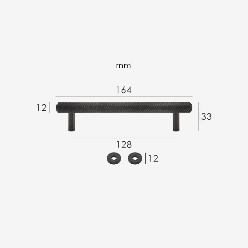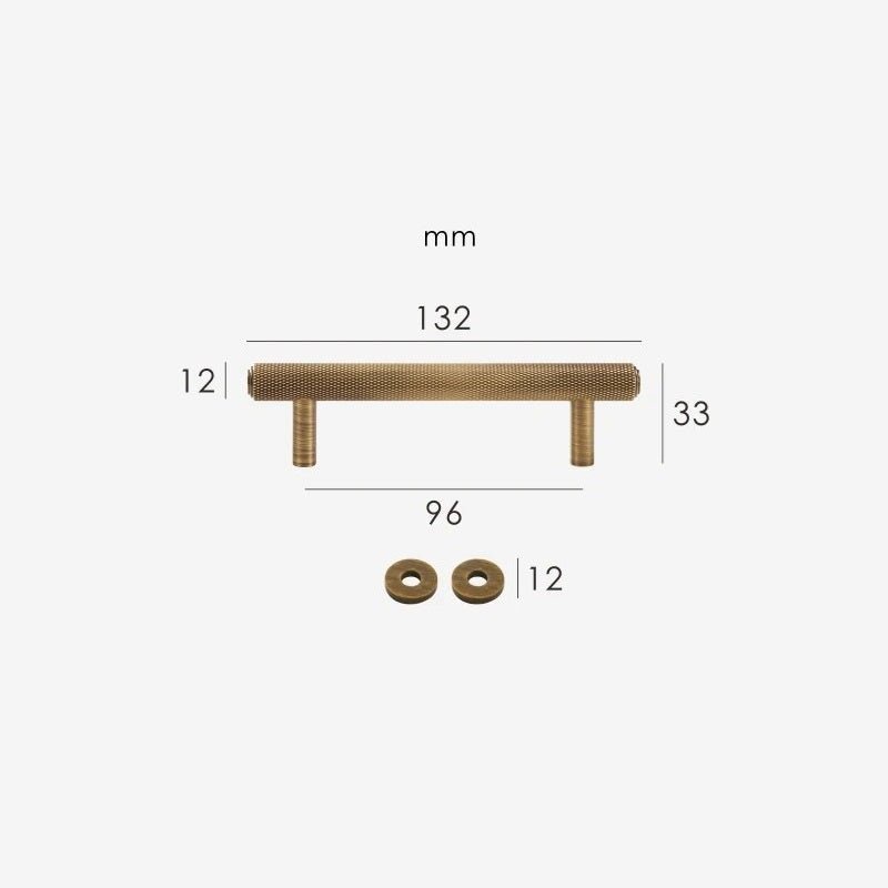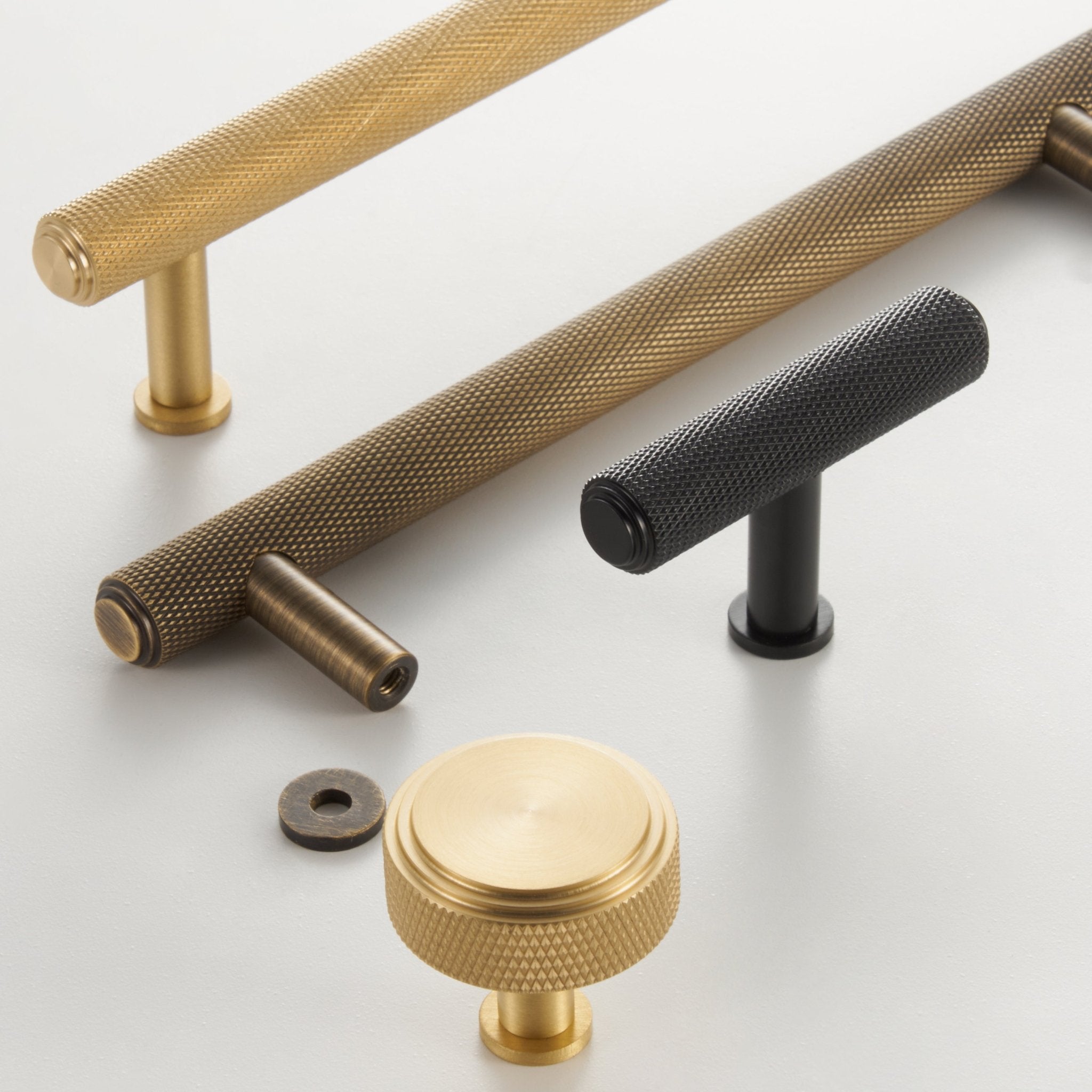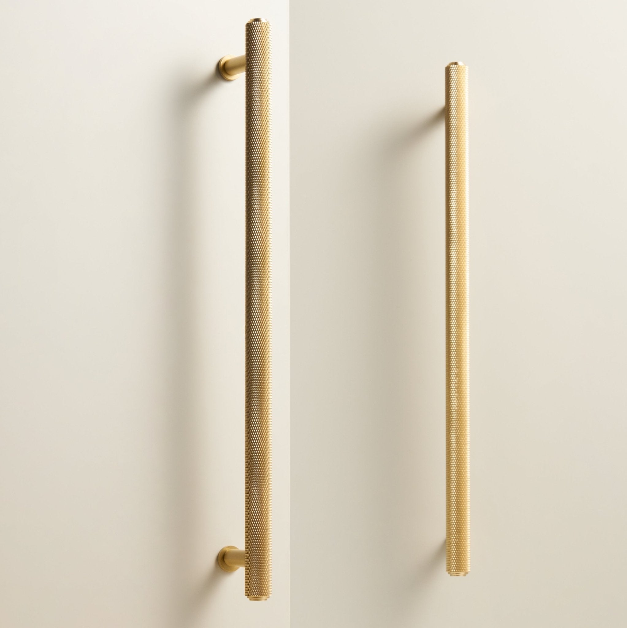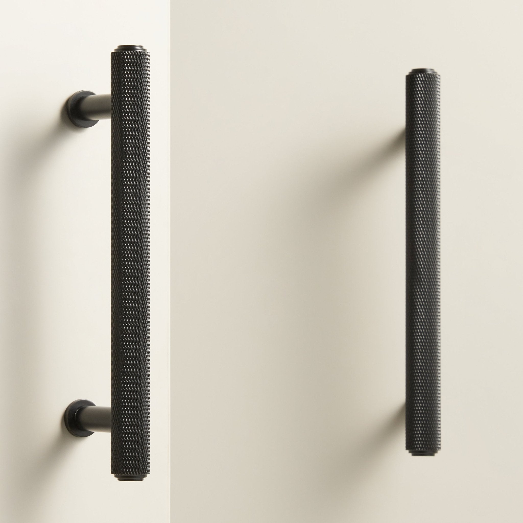 PLAKA handles are the longest form in the collection, fully knurled with the same diamond-pattern texture as the knobs and T-bars. The longer bar provides a comfortable grip and makes a visual statement across wider drawers and wardrobe doors.
