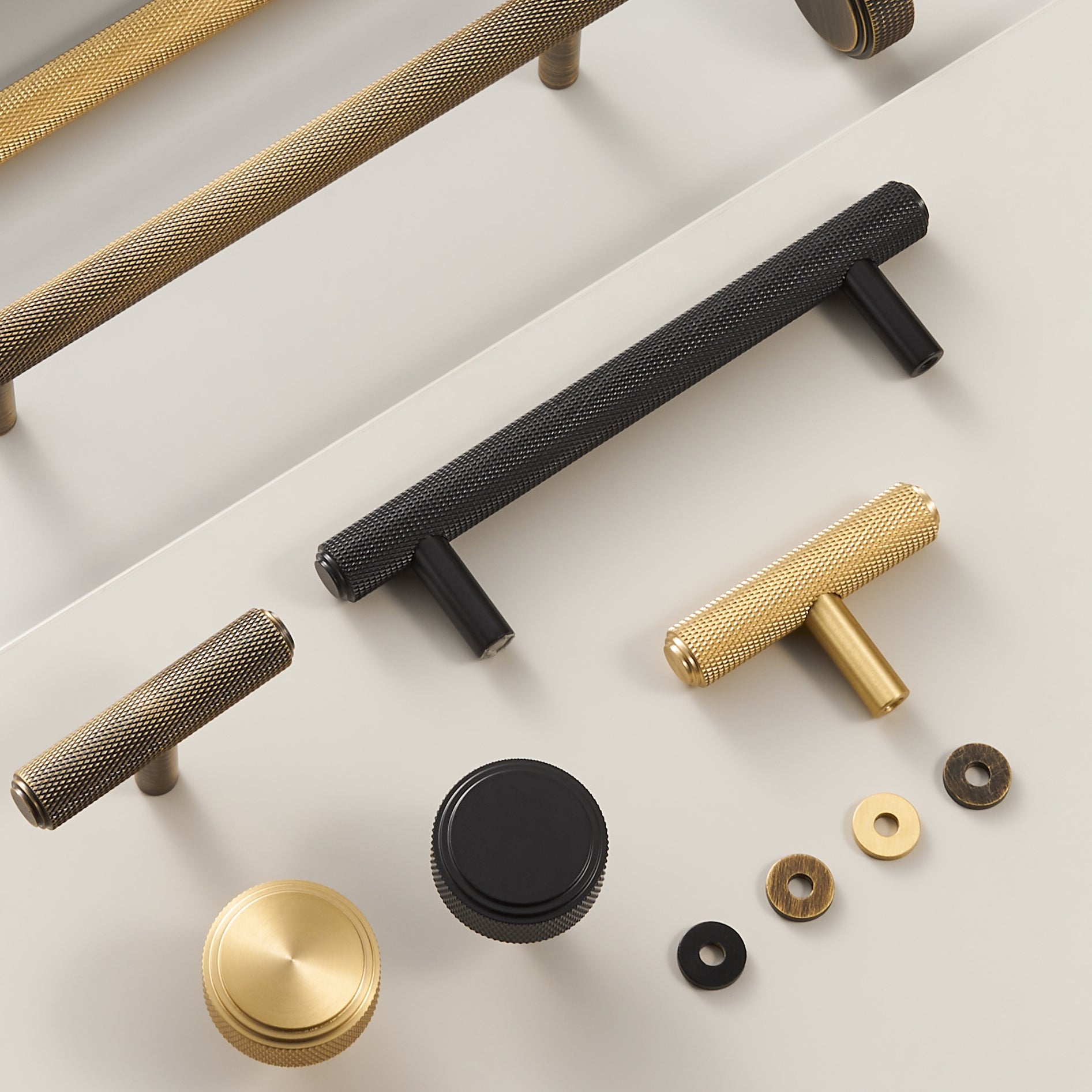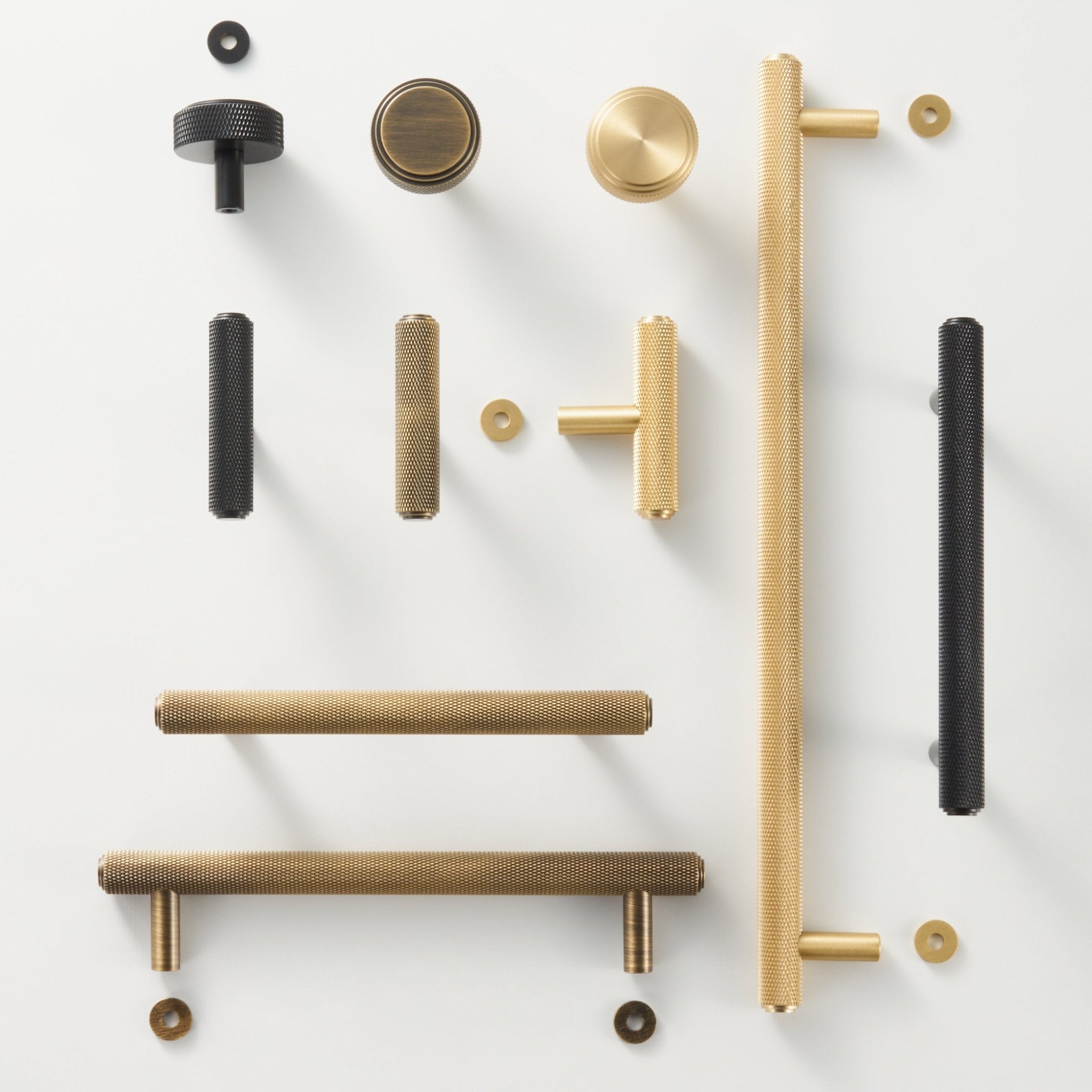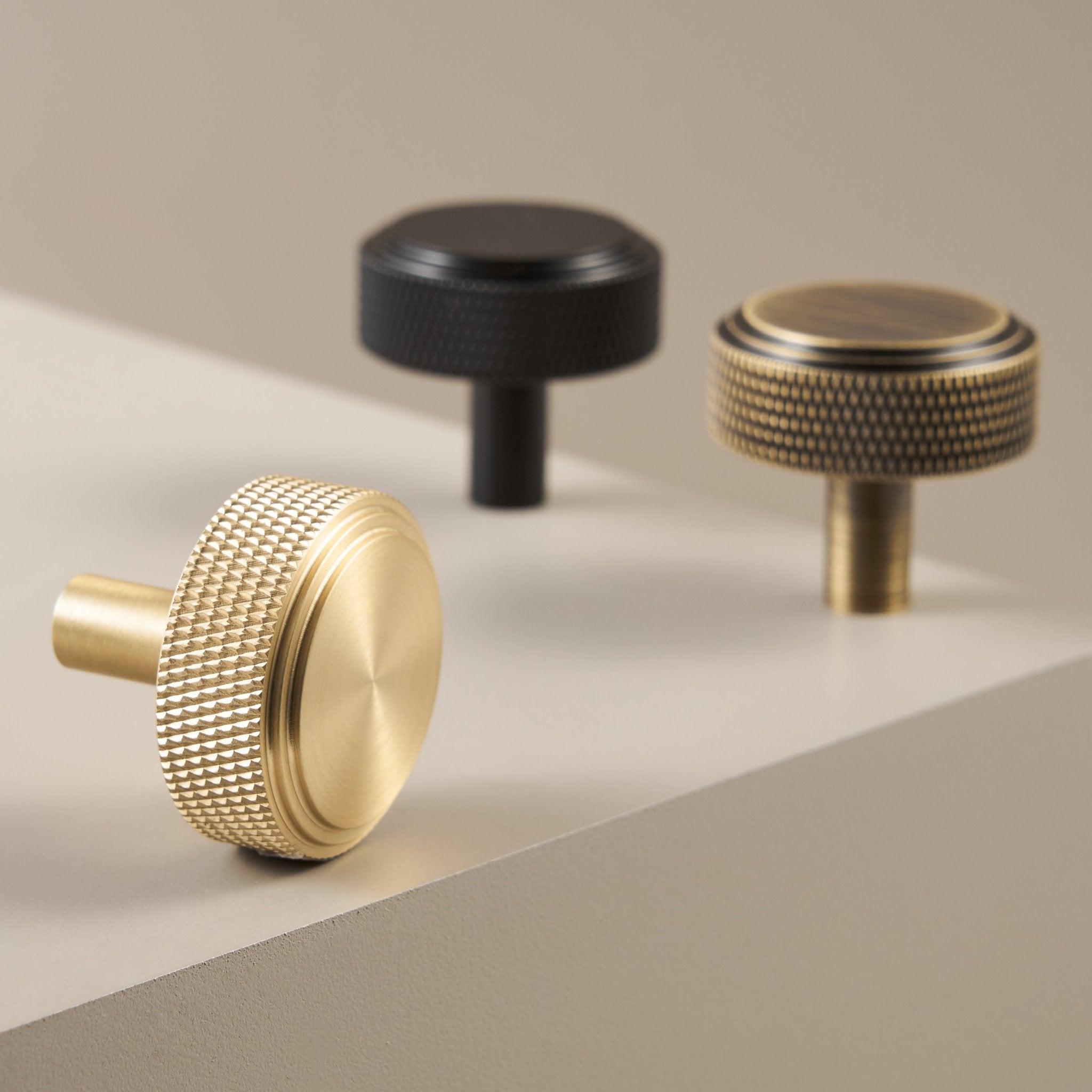 PLAKA knobs are fully knurled from top to bottom, with a flat face and diamond-pattern texture across the cylindrical body. The result is a knob with strong grip and a bold, industrial presence on cabinet doors and drawers.