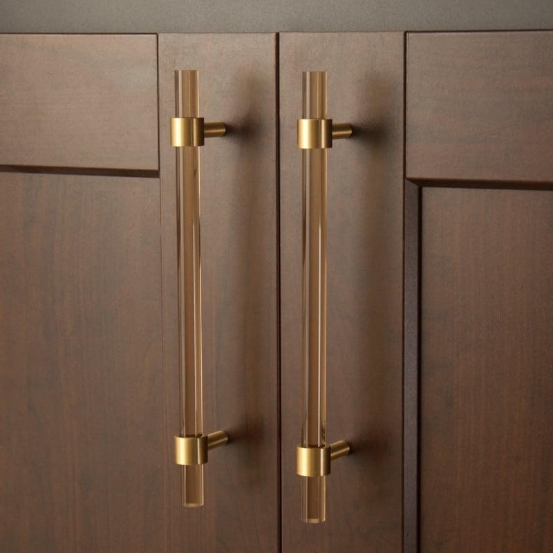 Solid brass end posts in a choice of finishes anchor the transparent bar. Multiple sizes available for kitchen drawers, bathroom vanities, and bedroom furniture.