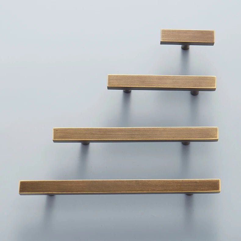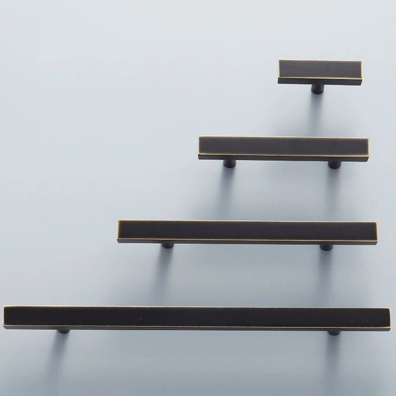 The profile is intentionally bold. A flat horizontal bar sits perpendicular to a squared vertical stem, creating hardware that reads as a small architectural element rather than a traditional pull. The proportions are carefully considered to balance visual weight with practical grip.