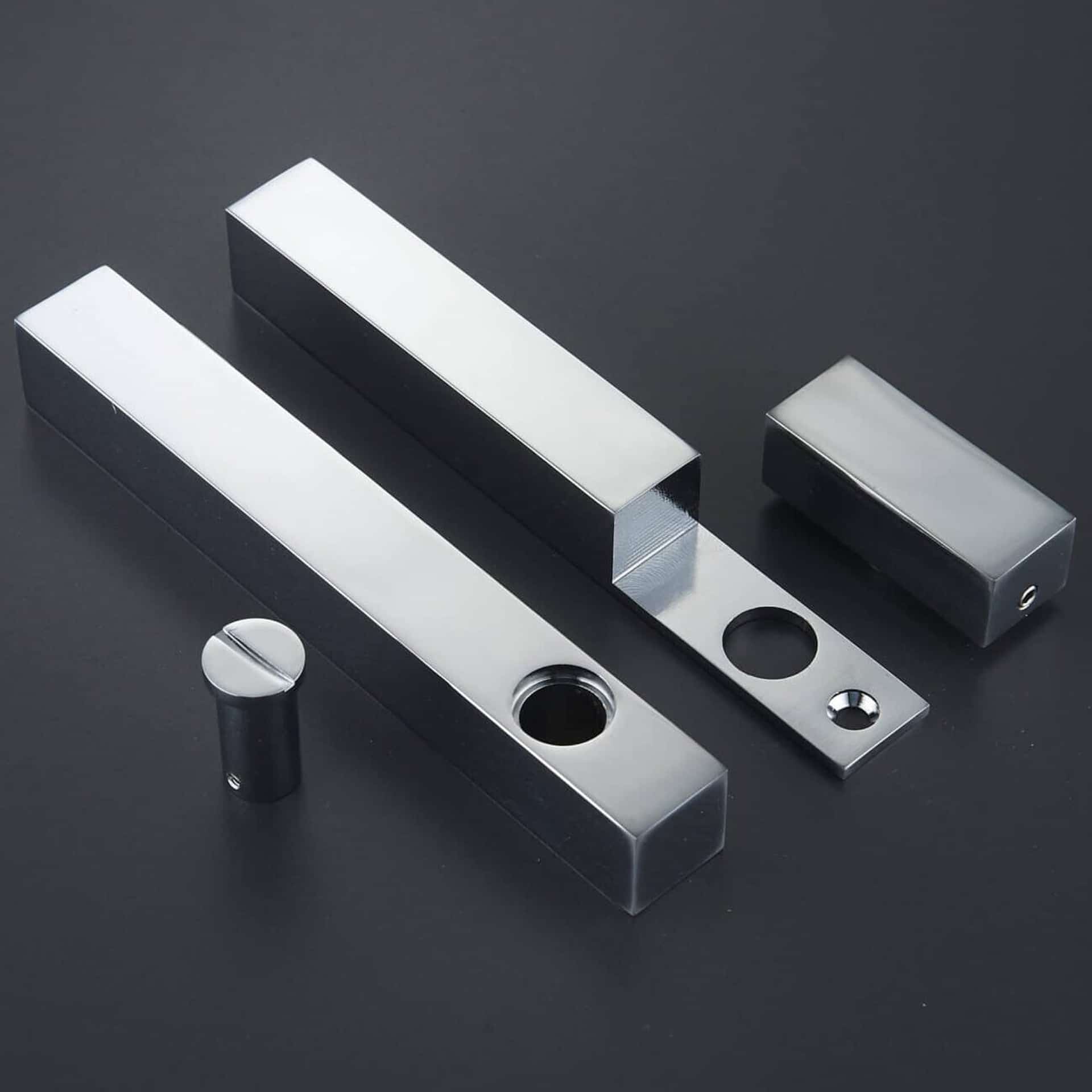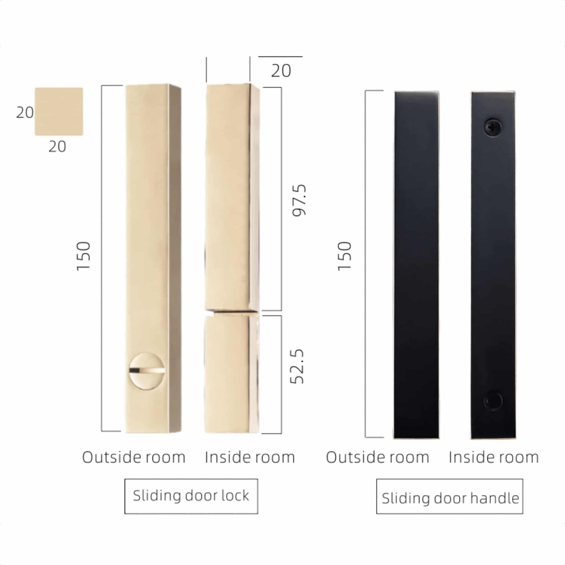 Available in two configurations: handles alone for standard sliding doors, or with an integrated privacy lock for bathroom applications. The lock variant features a discreet thumbturn on the interior side for locking, with a coin-release mechanism on the exterior for emergency access. This ensures privacy while maintaining safety.