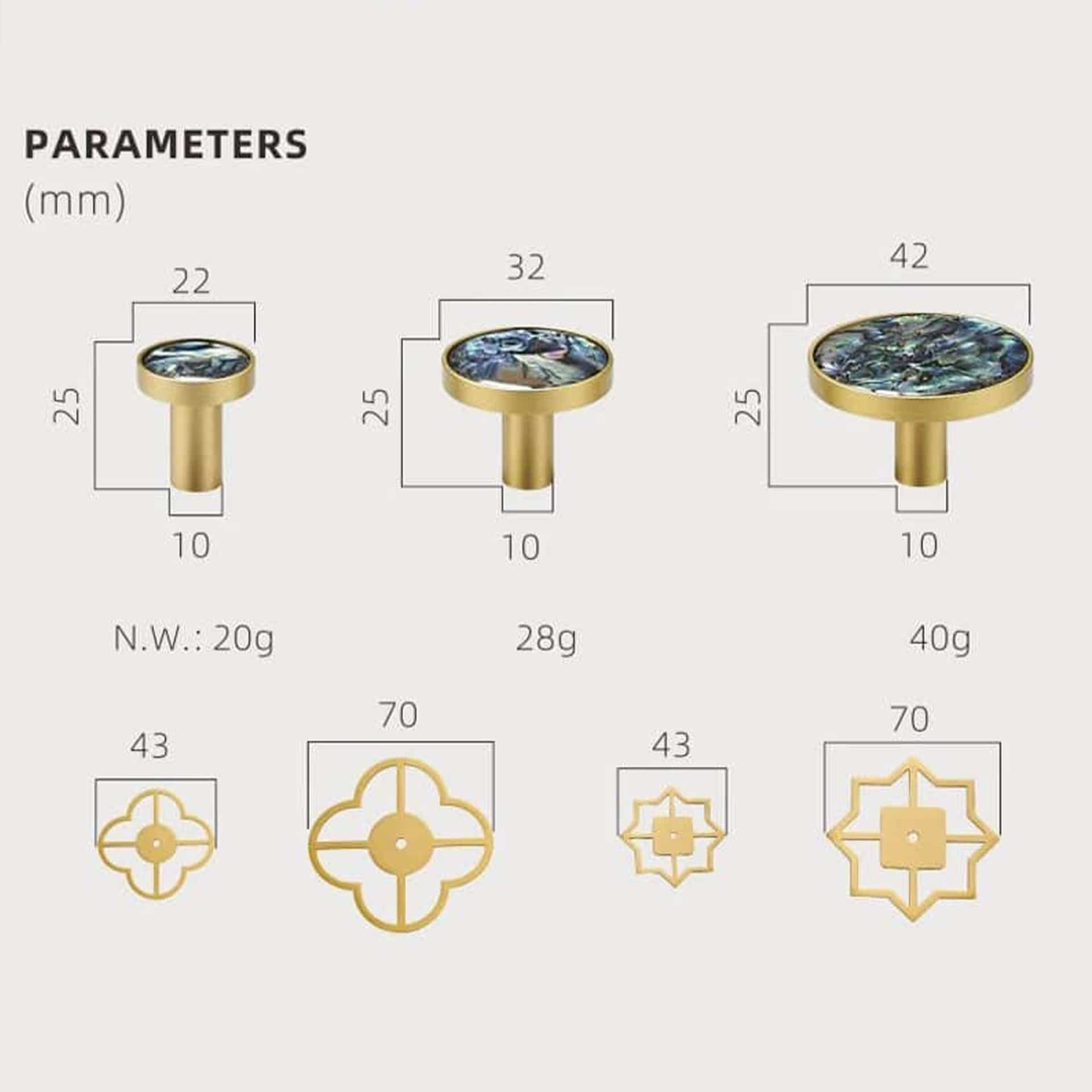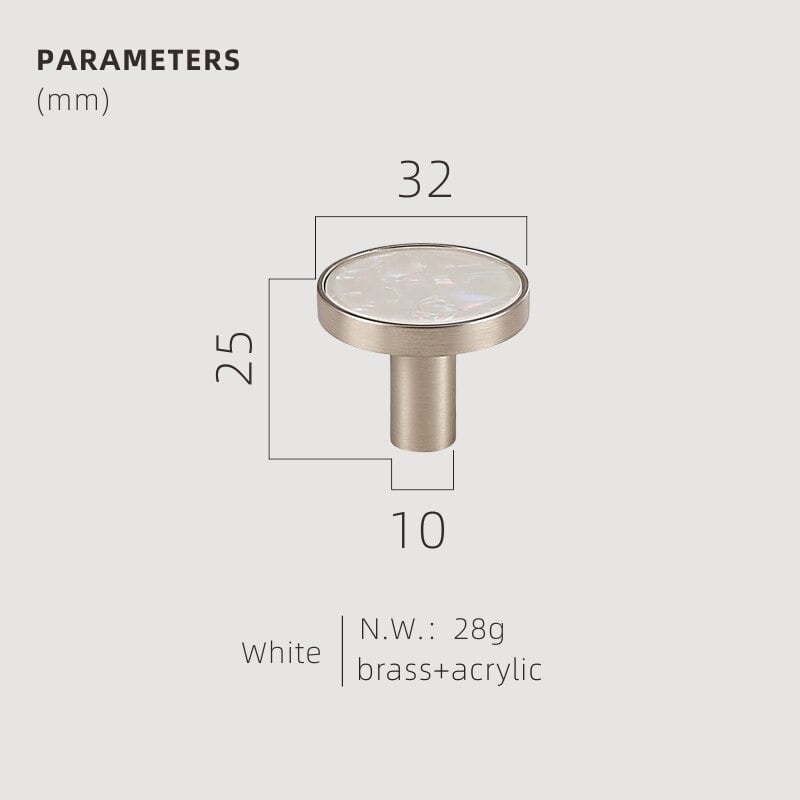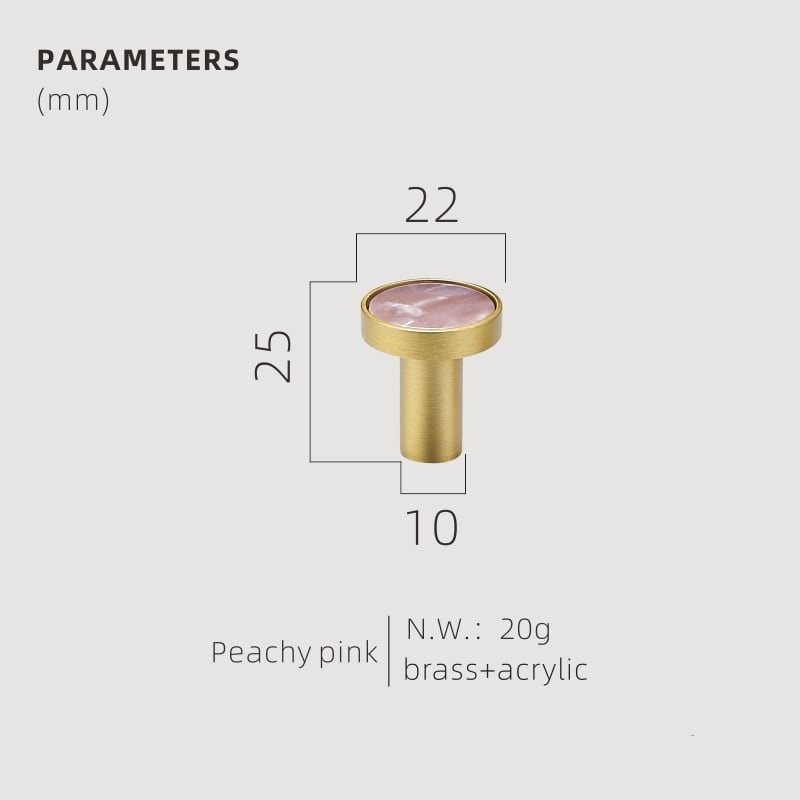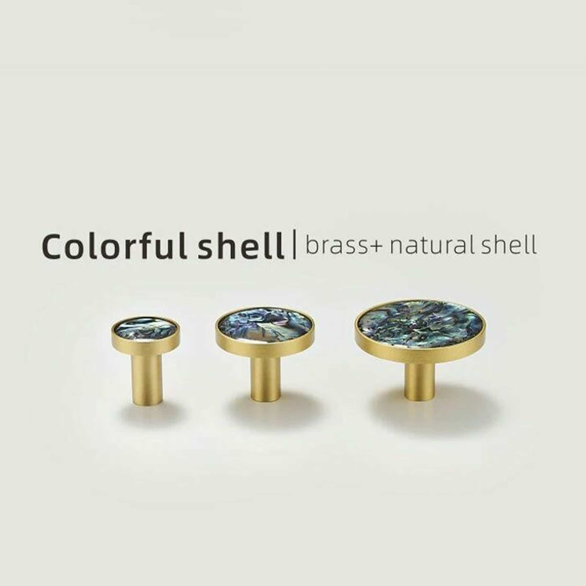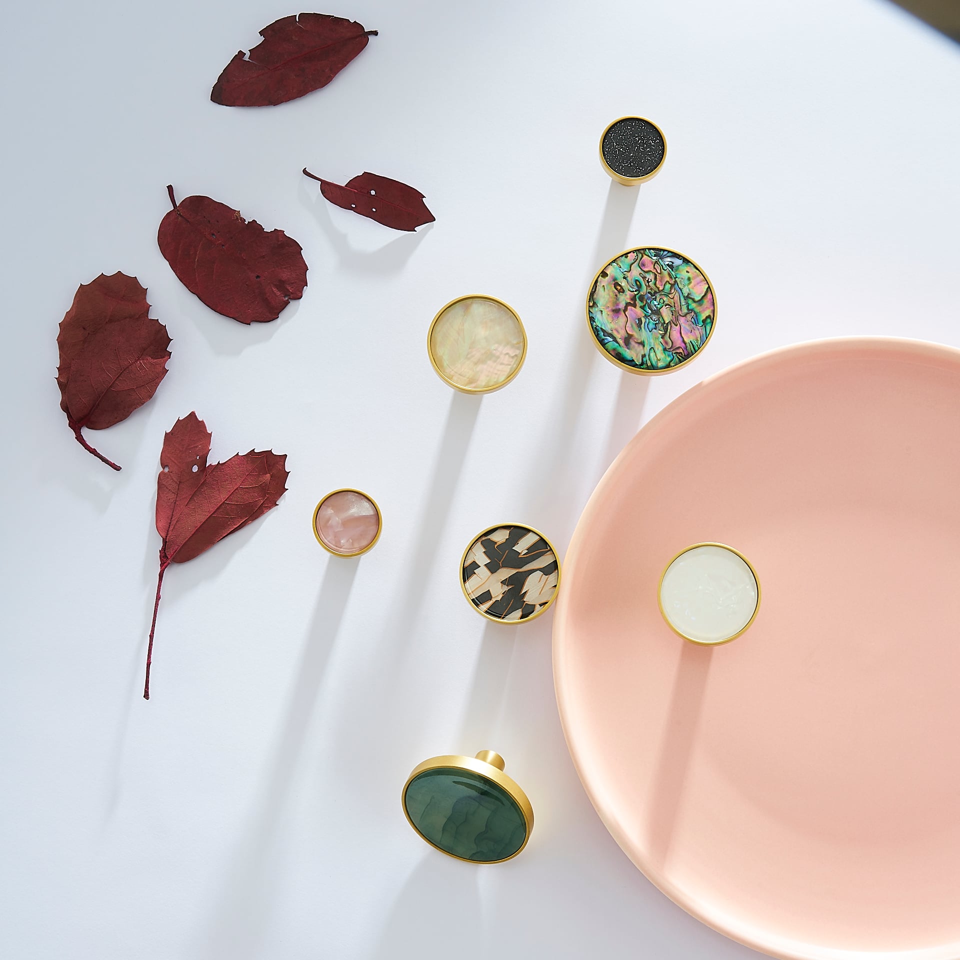 The range includes white shell, colourful shell, white abalone, starry black, celadon green, and peach pink options. Each material has its own natural variation, so no two knobs are identical. The brass surround is available in Satin Brass, Satin Nickel, and Vintage Brass.
