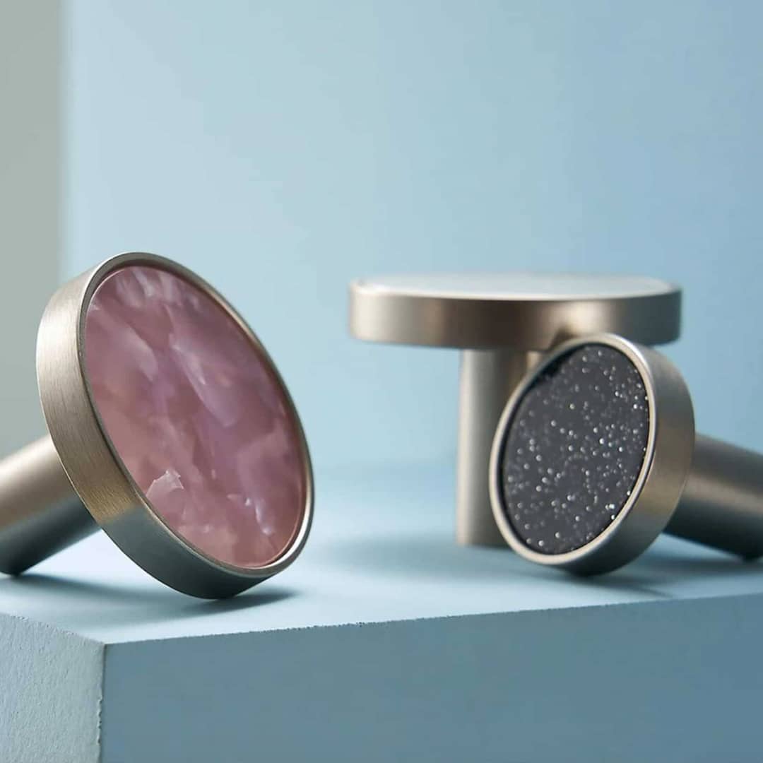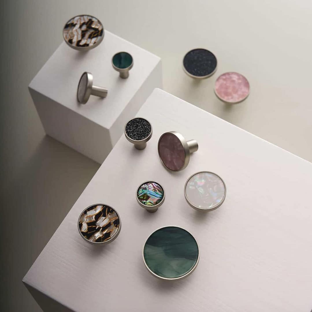 TESTA knobs bring natural materials and colour to cabinet hardware. Each knob features a shell or acrylic inlay set into a solid brass surround, creating pieces that feel collected rather than mass-produced.